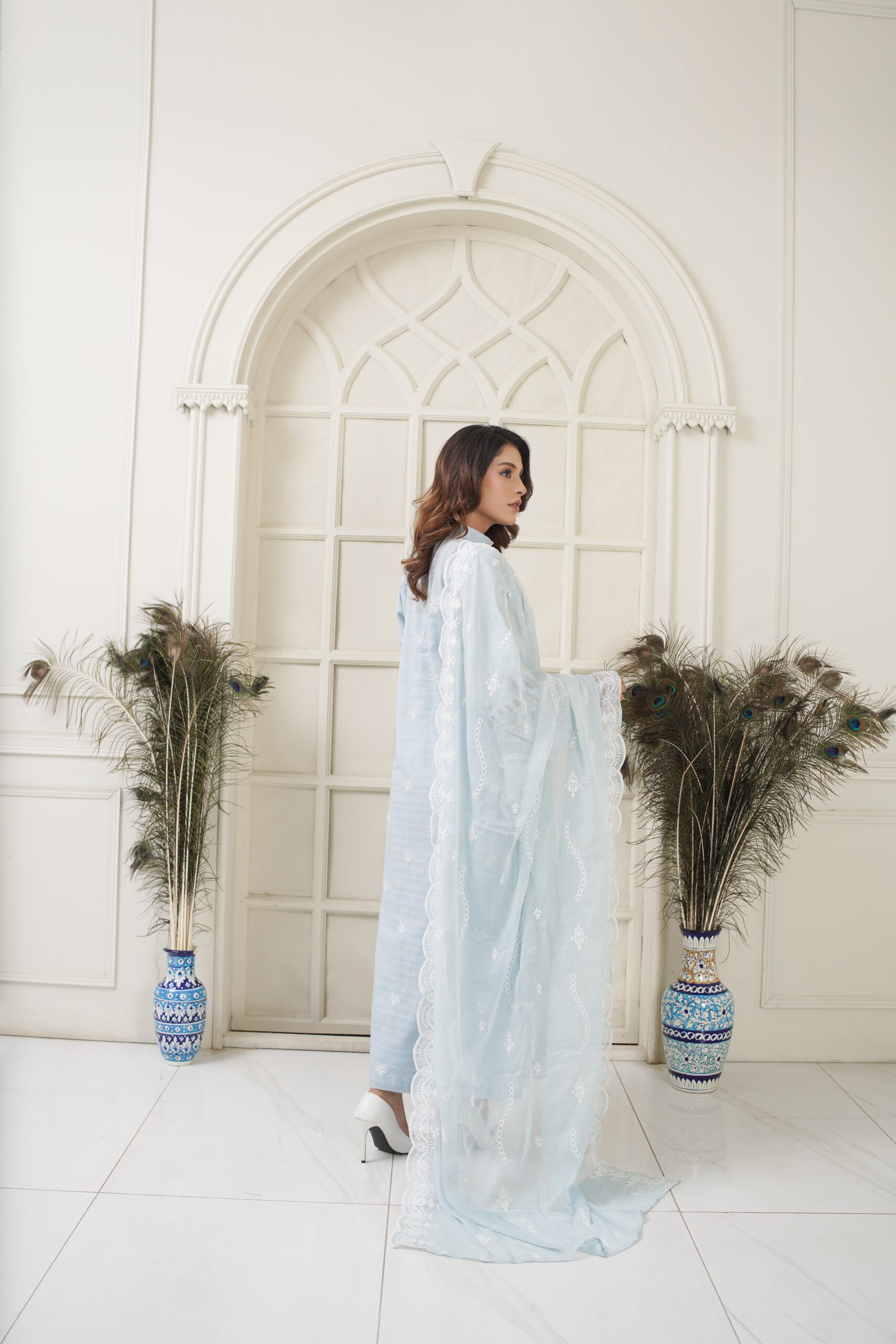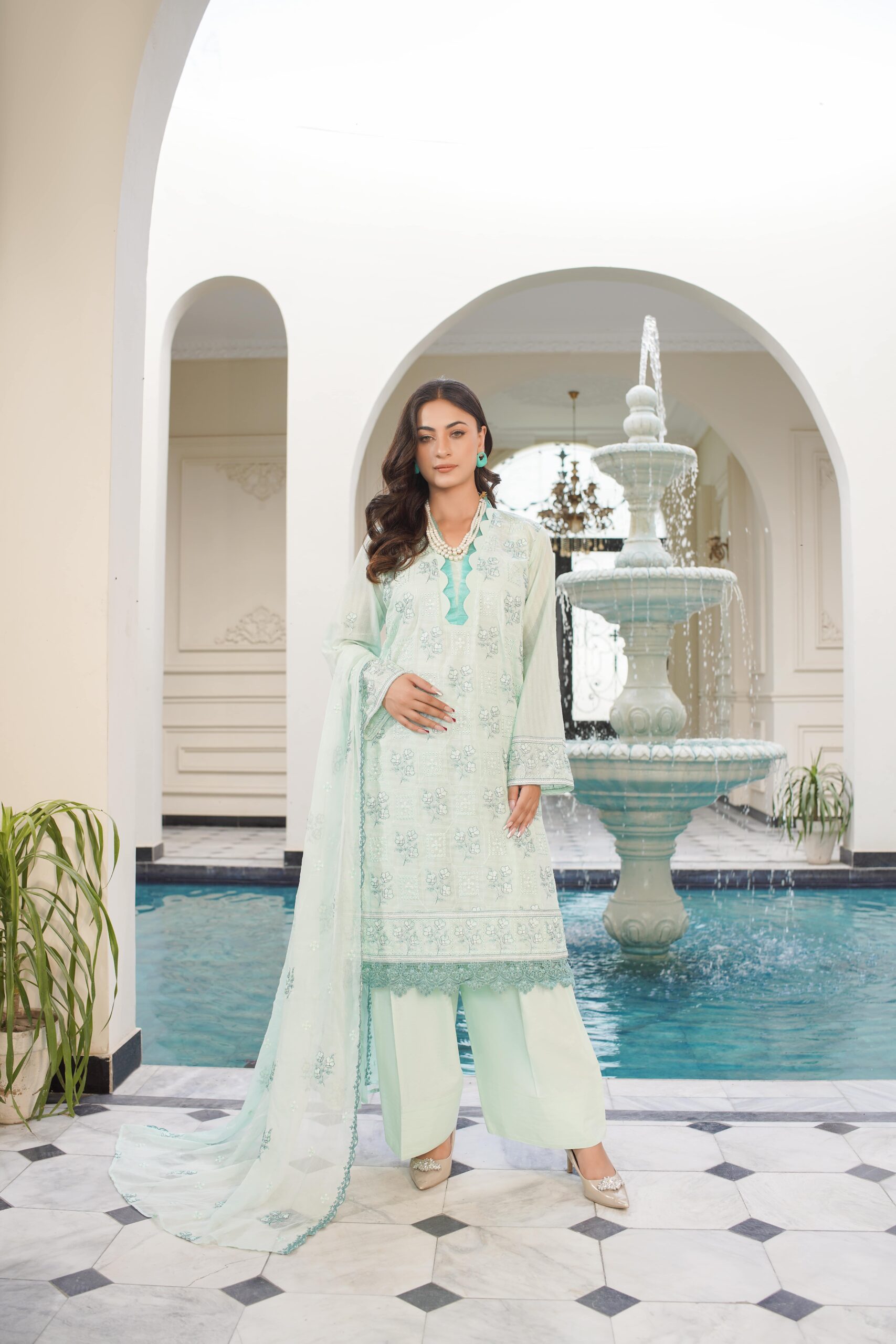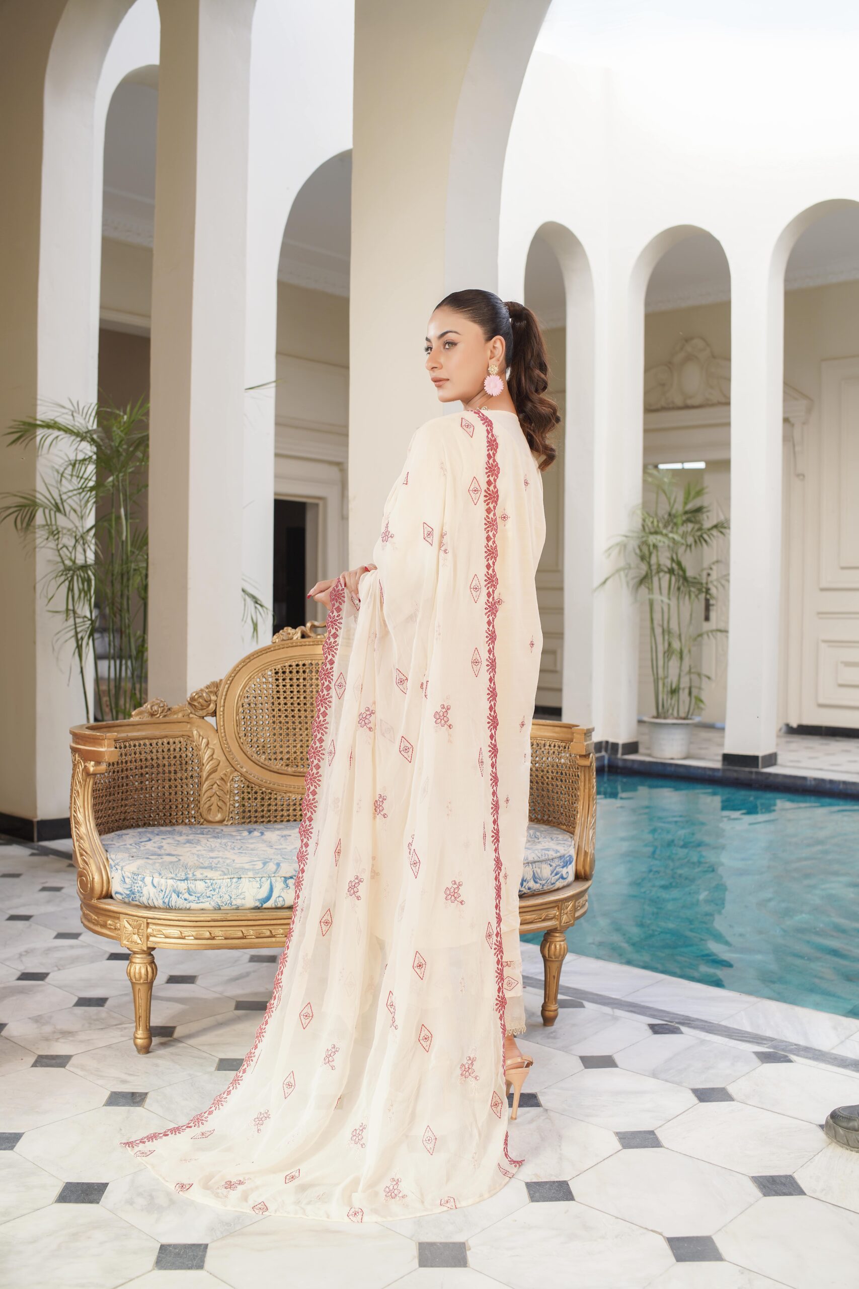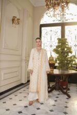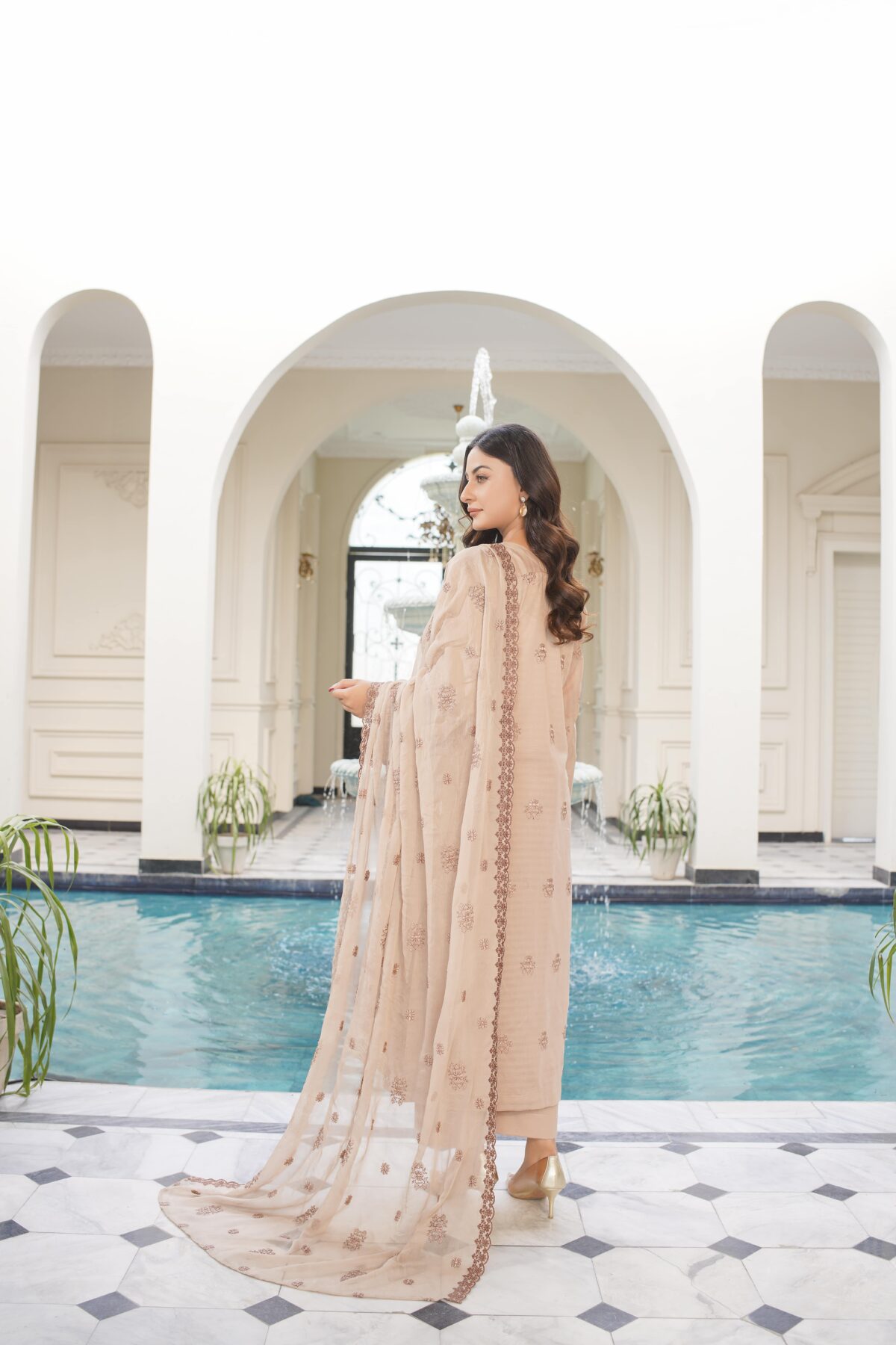 Arooj is thoughtfully designed for women who carry elegance in their posture and heritage in their style. With soft detailing on the shirt and a delicately embroidered crinkle dupatta, this outfit flows effortlessly, offering a refined look for festive and formal occasions.