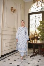 The Bana Dora Lawn provides a rich base for detailed embroidery, giving depth and texture to the design. The embroidered crinkle dupatta adds lightness and movement, completing the look with a whisper of refinement.