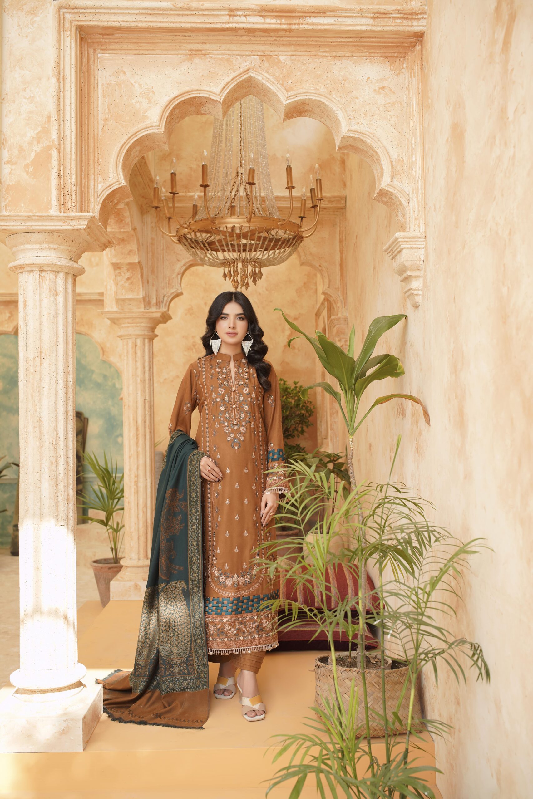 Manizay presents Bandhan — a symbol of warmth, elegance, and lasting grace. Crafted from premium embroidered peach leather, this exquisite ensemble captures the true essence of refined winter fashion. The beautifully embroidered front, back, and sleeves showcase delicate artistry, while the plain dyed trouser offers balance and sophistication.