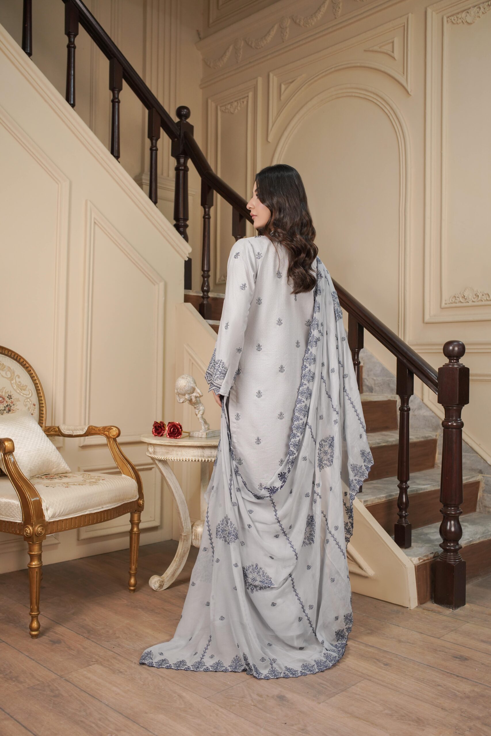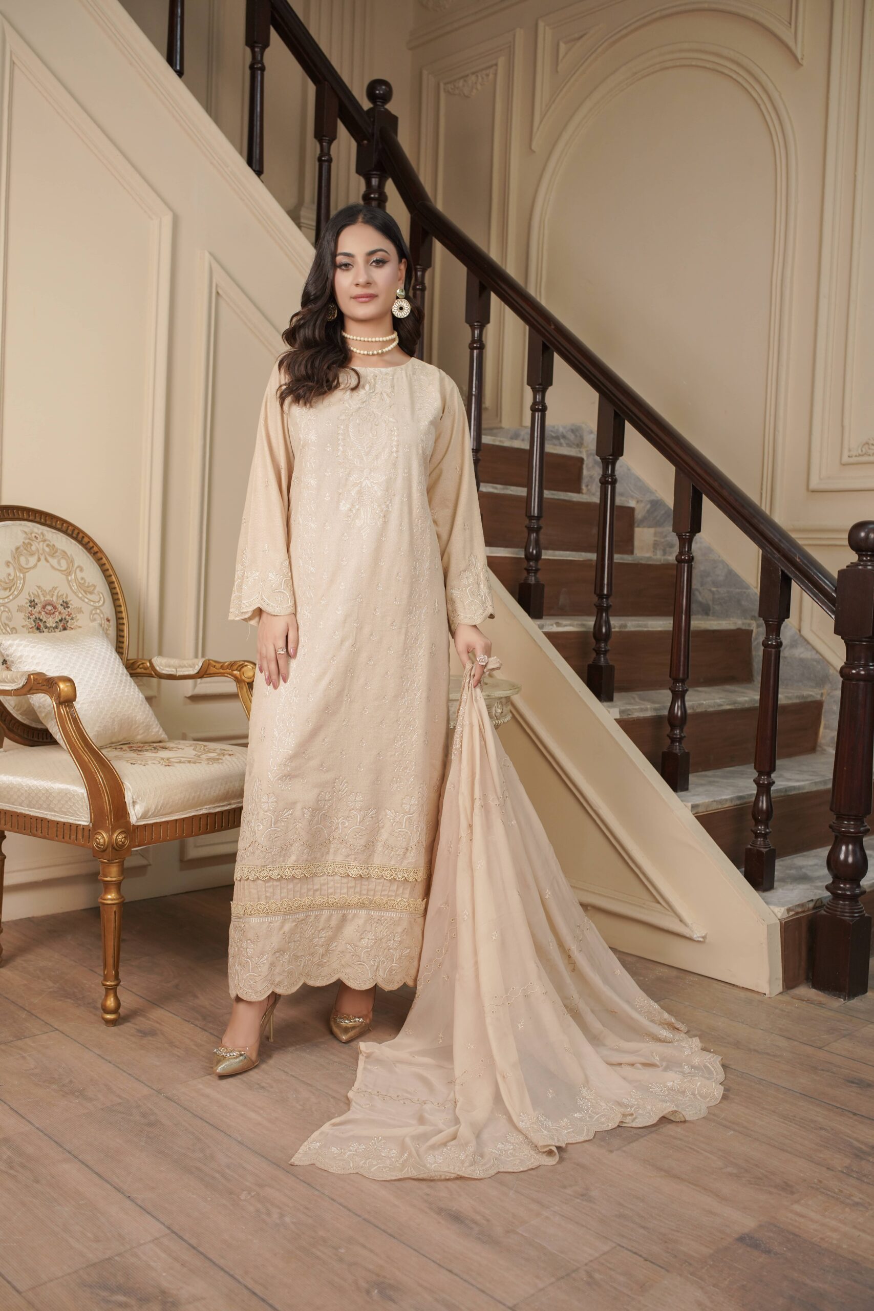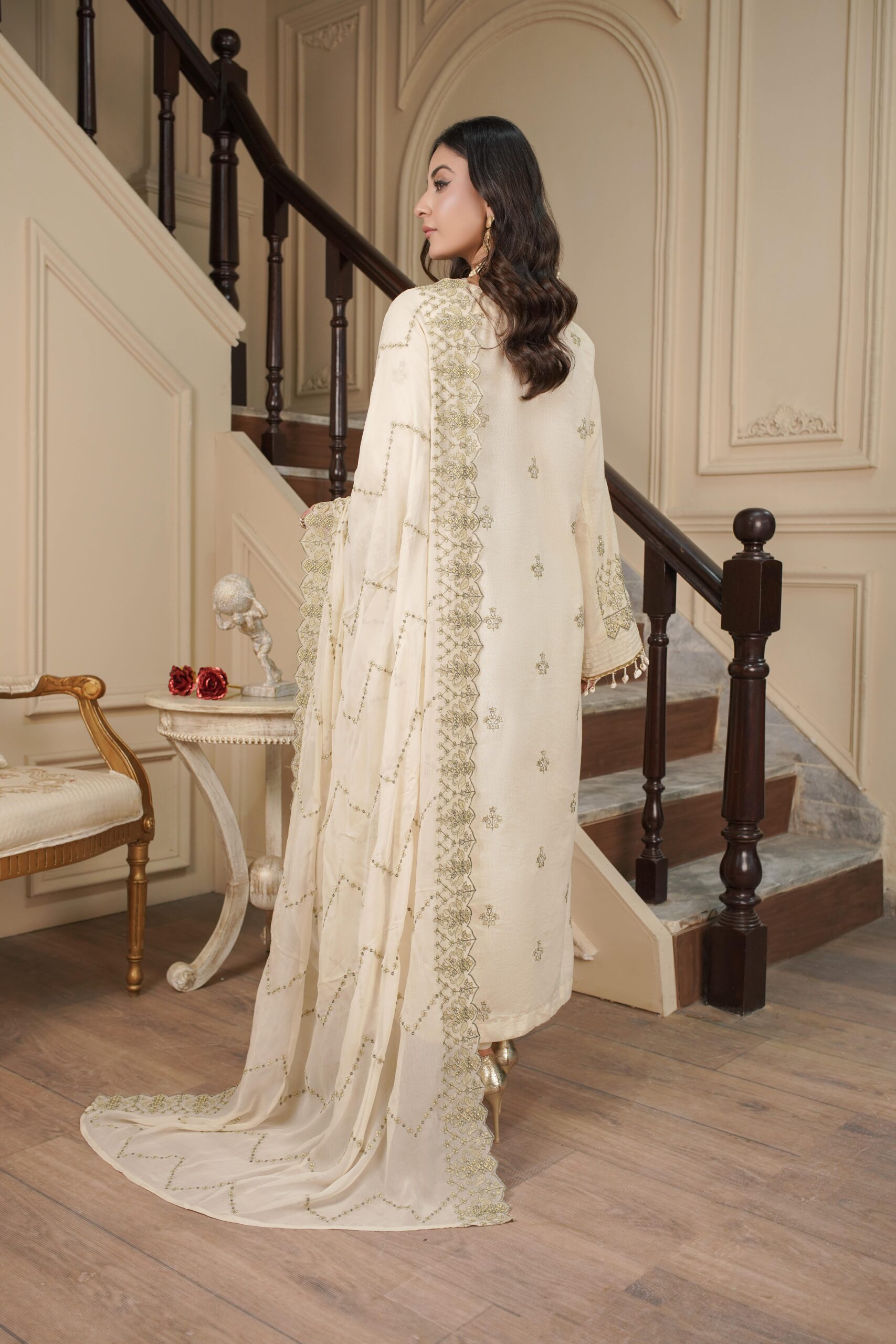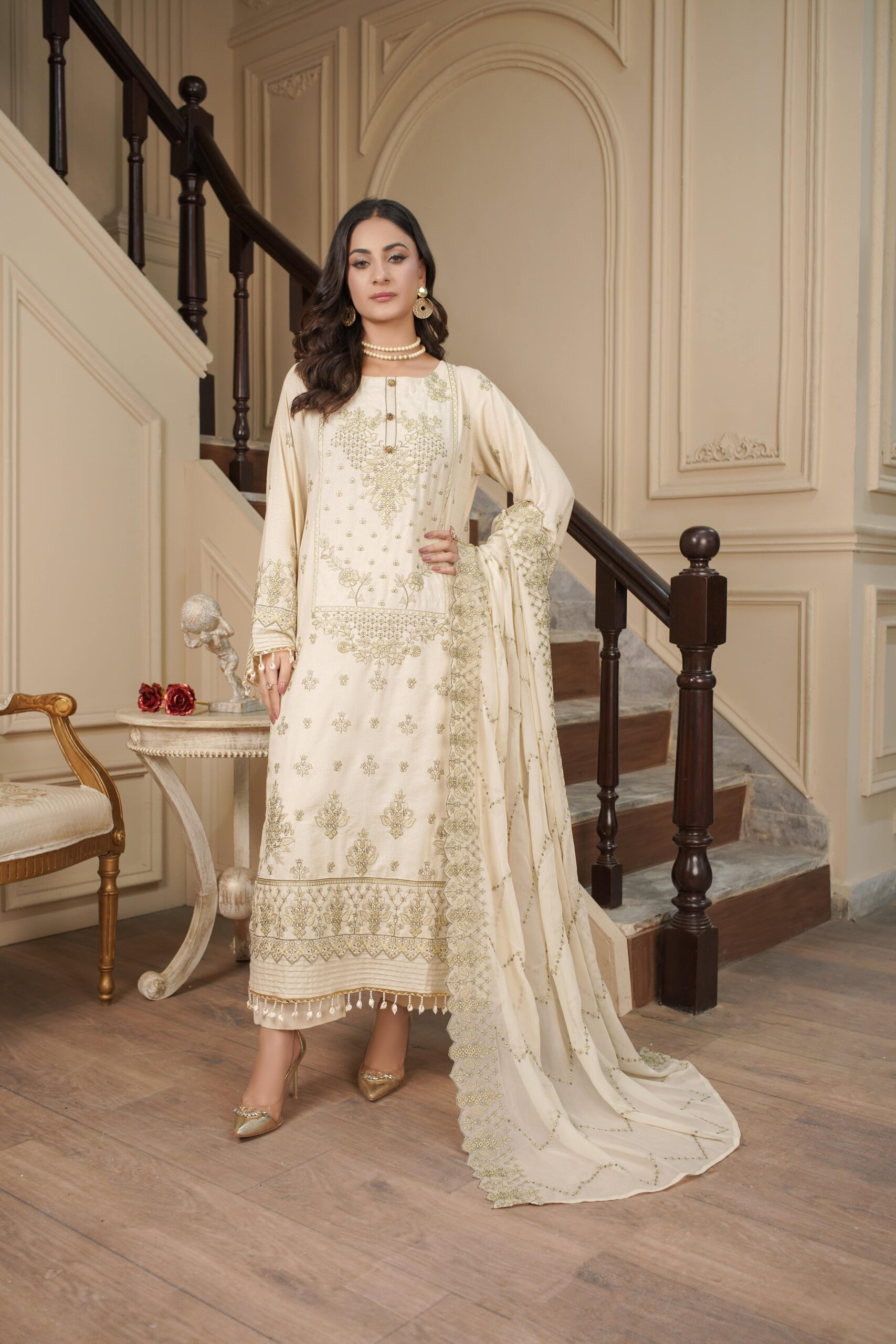 Paired with plain dyed trousers for a balanced and polished look, every outfit is elevated with a premium embroidered chiffon dupatta, offering lightness, flow, and sophistication. With its soft textures, classic silhouettes, and intricate detailing, the Gulfam Collection is perfect for winter festivities, cultural occasions, and graceful everyday wear.