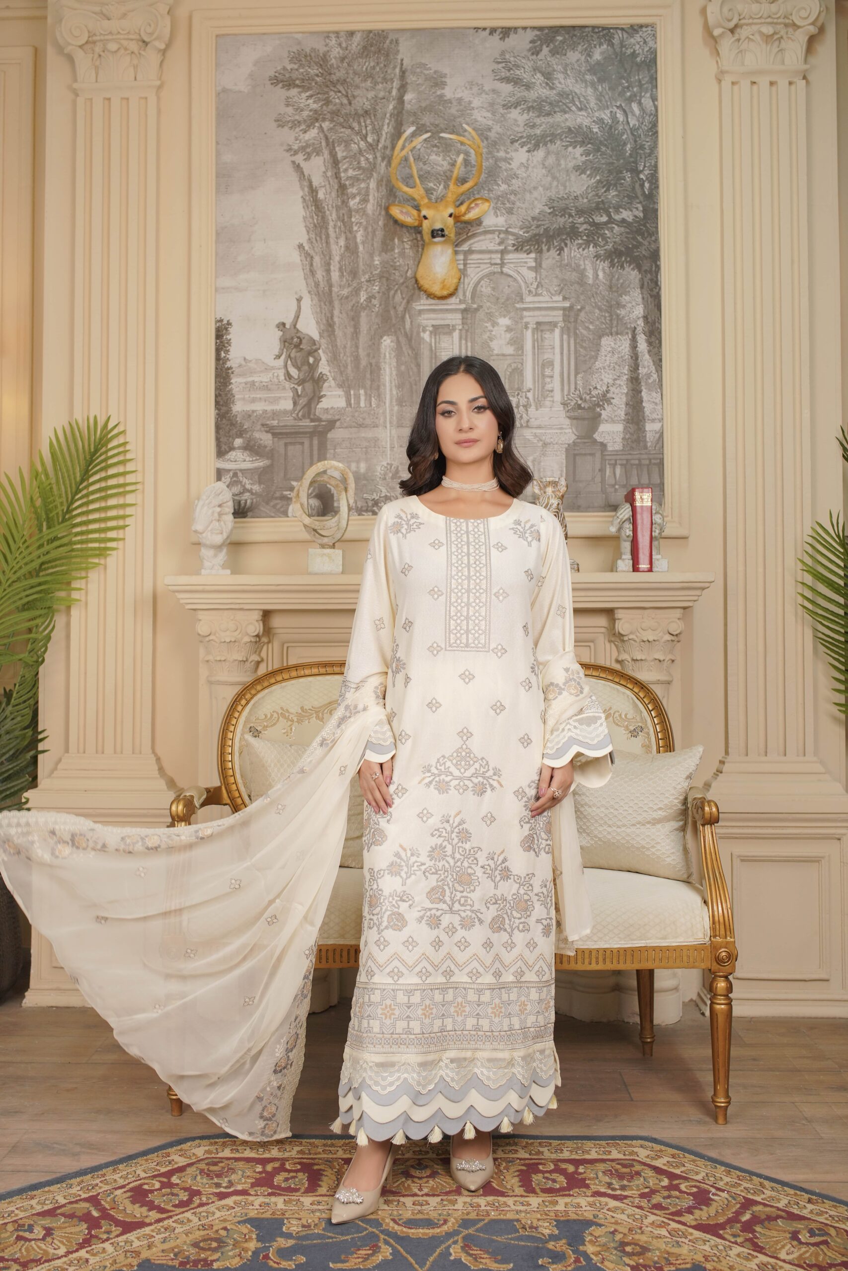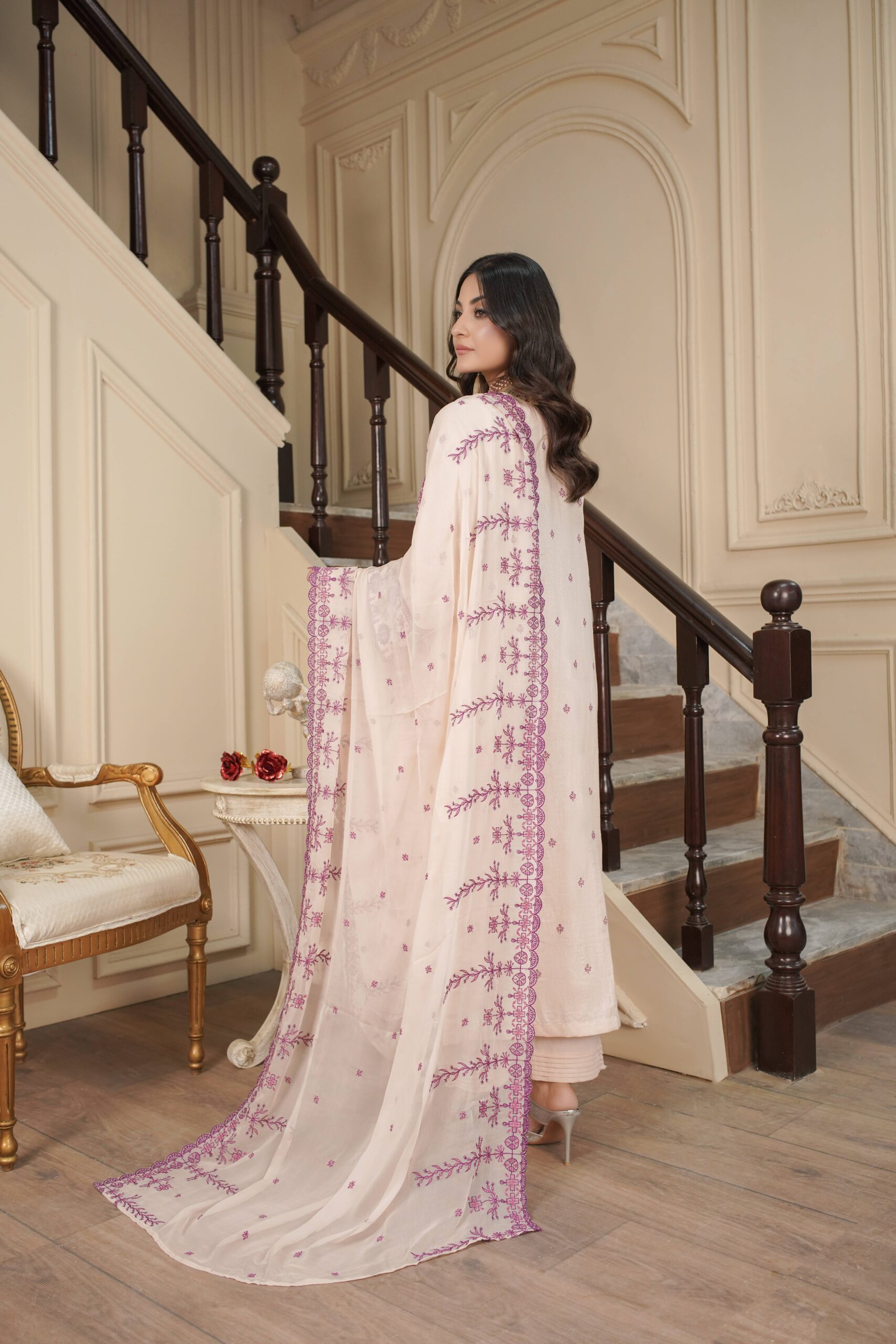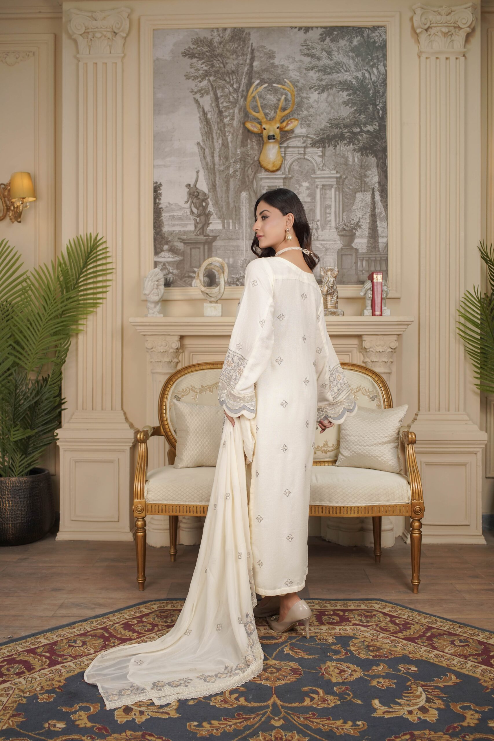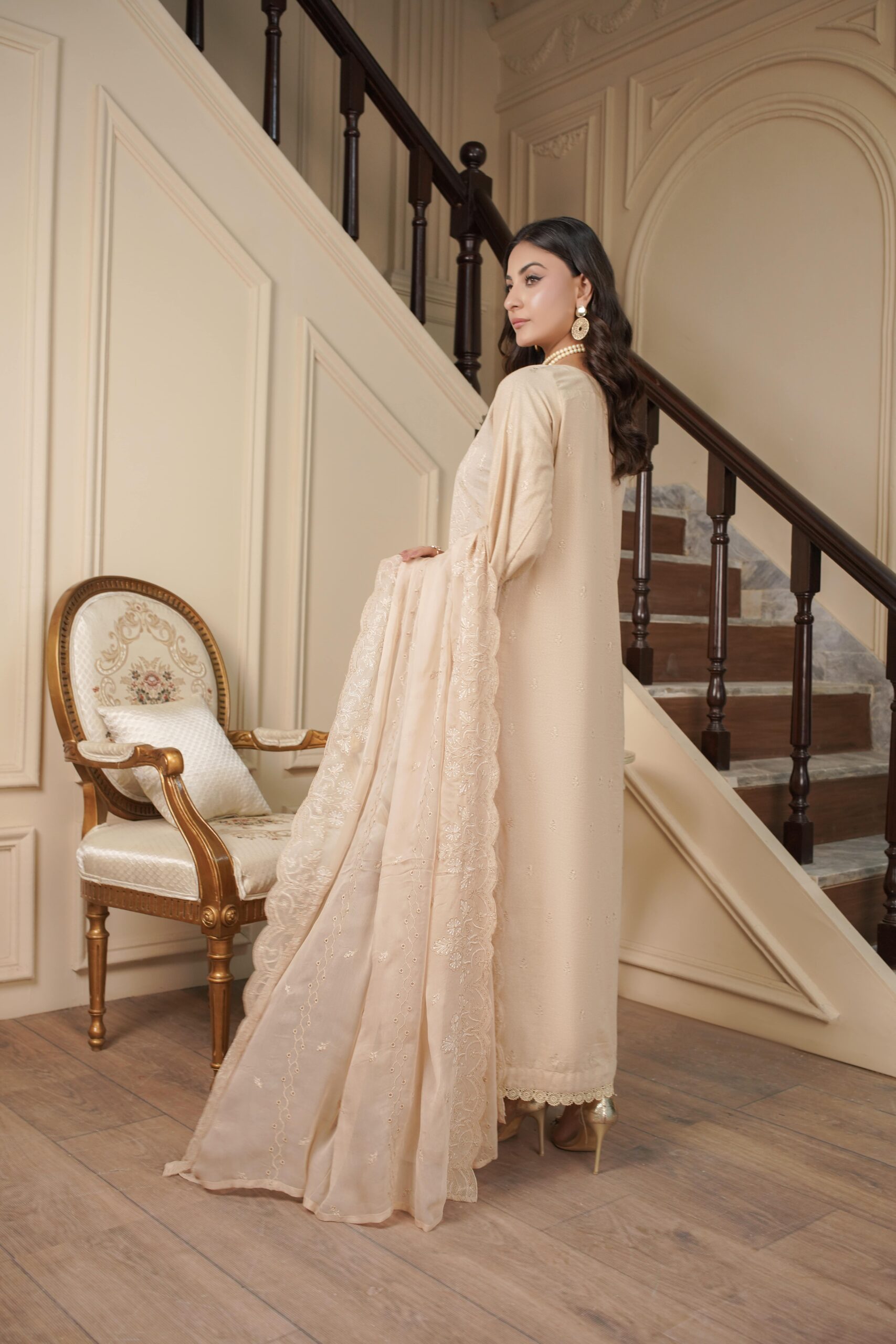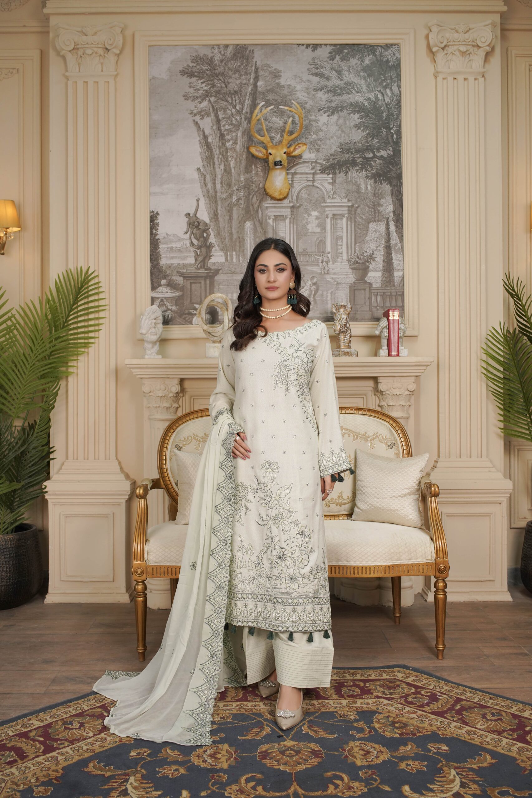 Paired with plain dyed trousers for a balanced and polished look, every outfit is elevated with a premium embroidered chiffon dupatta, offering lightness, flow, and sophistication. With its soft textures, classic silhouettes, and intricate detailing, the Gulfam Collection is perfect for winter festivities, cultural occasions, and graceful everyday wear.