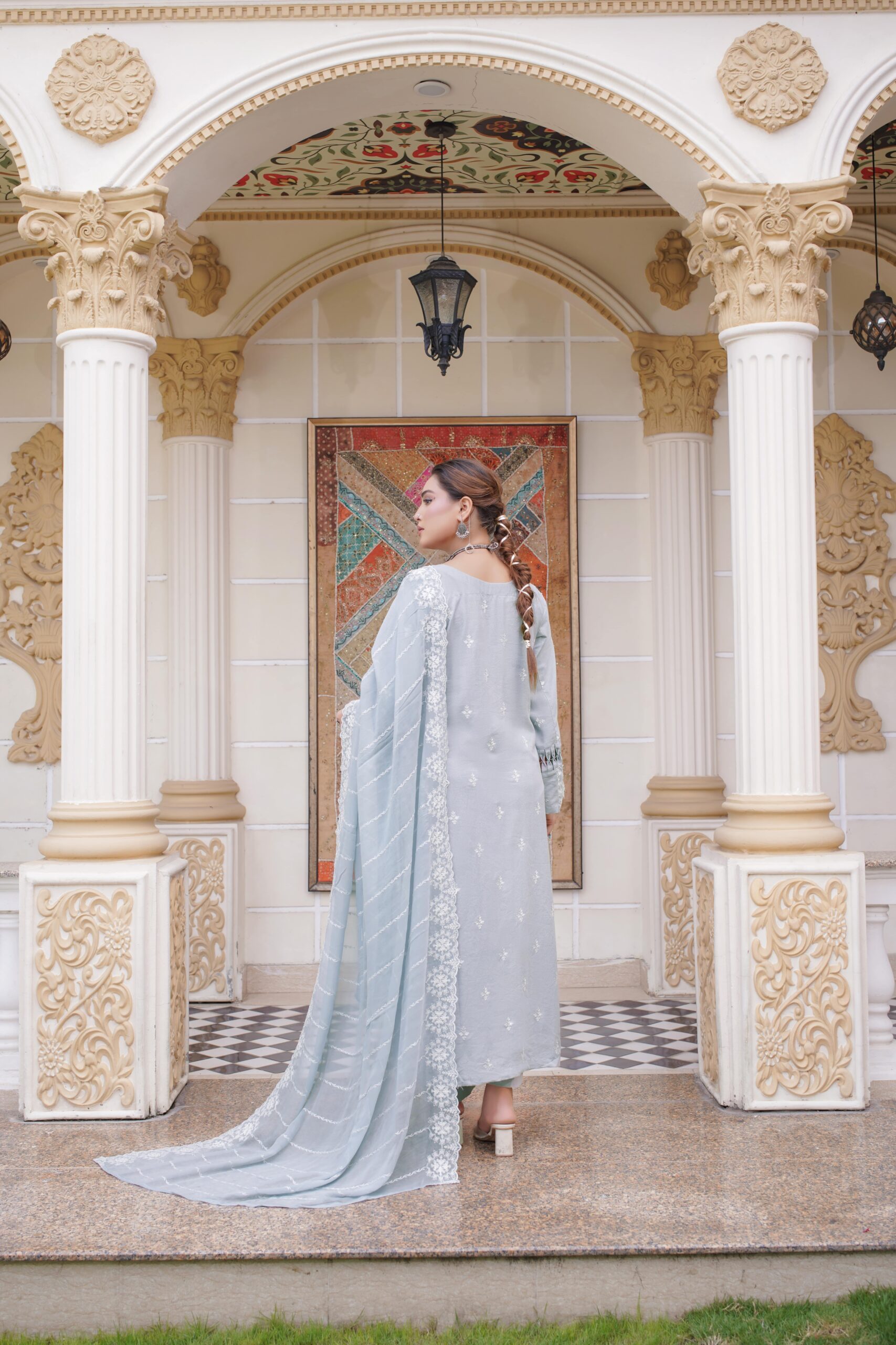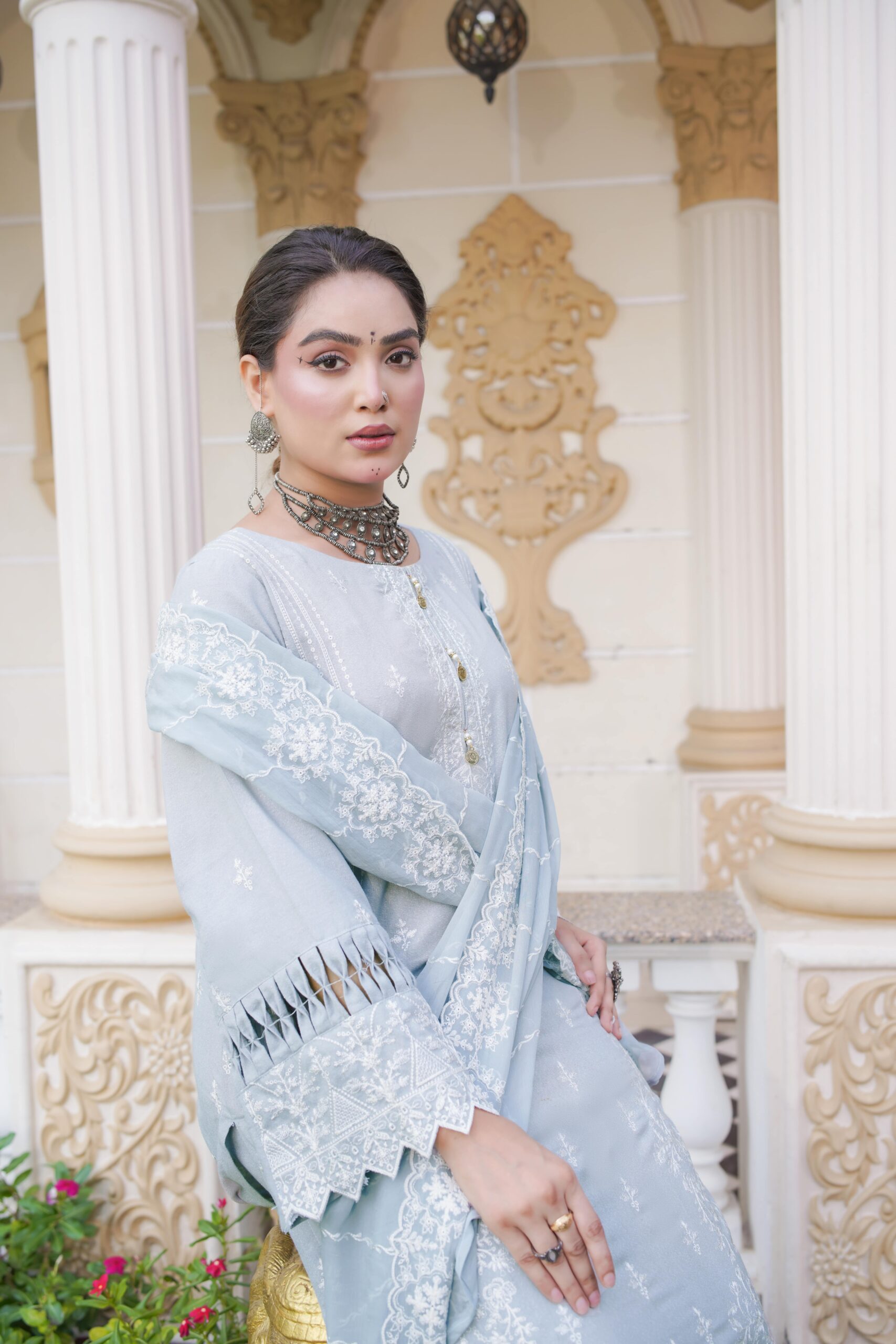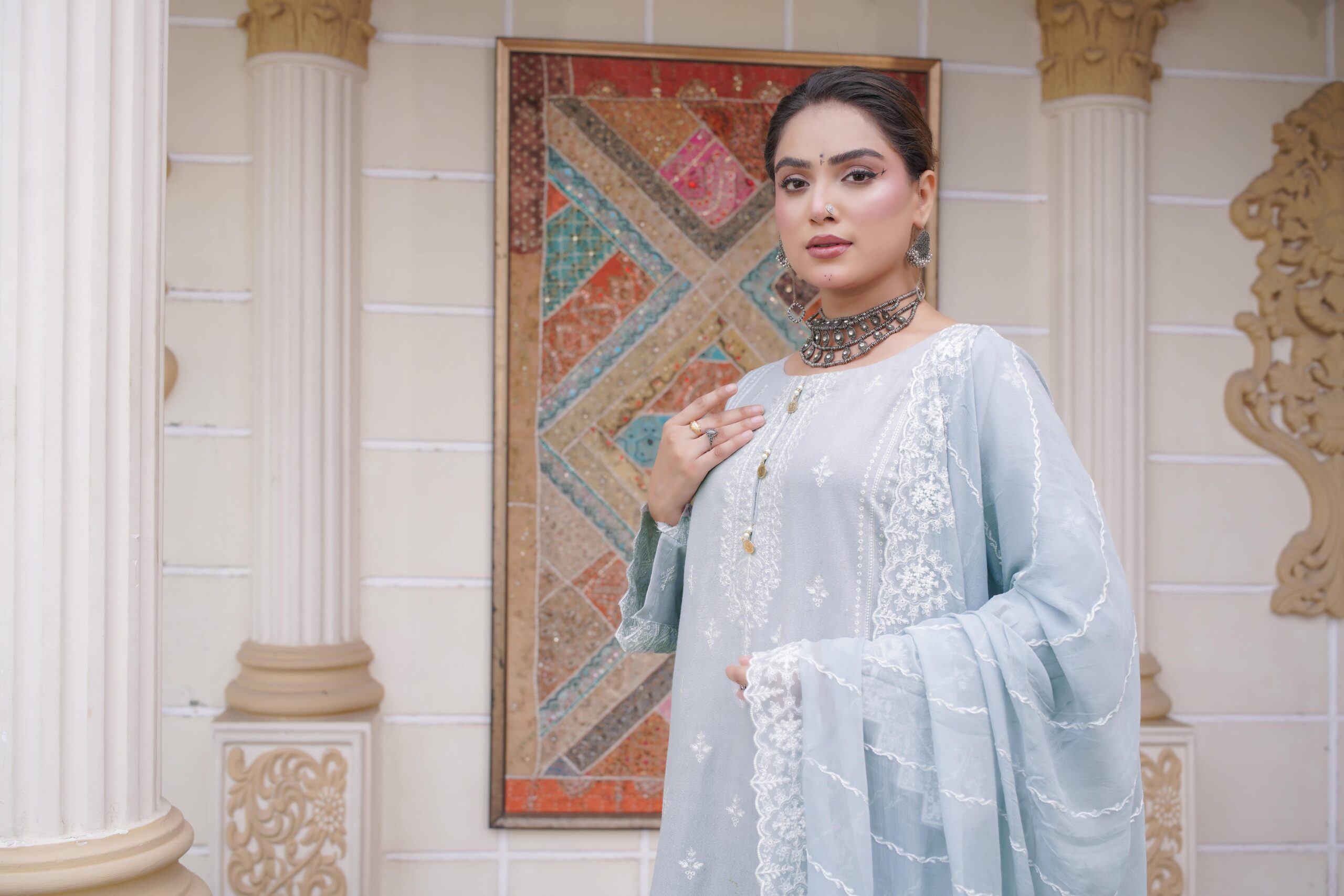 Complemented by a plain dyed trouser, the ensemble achieves a perfect balance between rich detail and wearable comfort. The showstopper of this look is the embroidered Crinkle Bamber dupatta, designed to drape you in charm and celebration. Its delicate textures and ornate patterns make Mooray Piya an ideal choice for festive gatherings, cultural soirées, and traditional occasions.