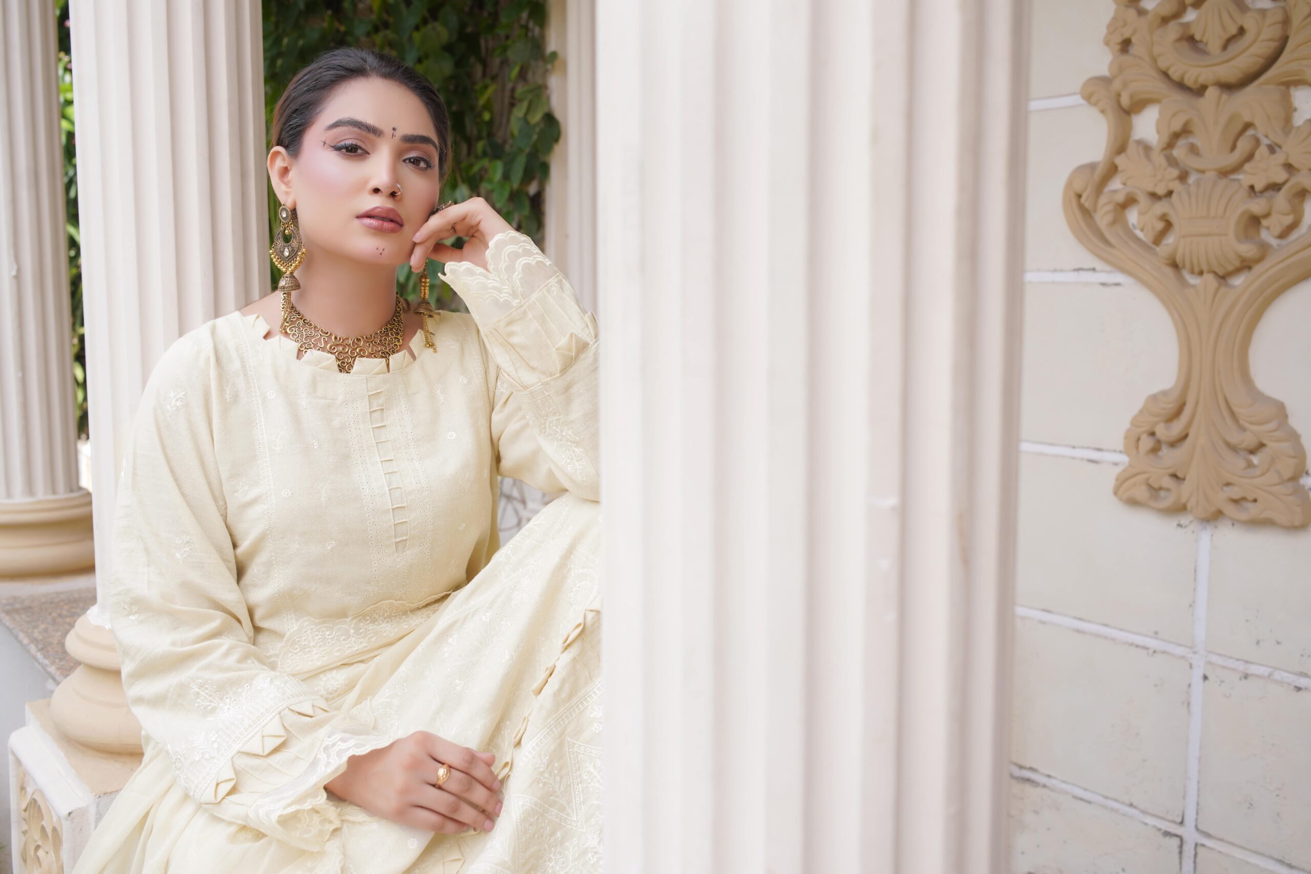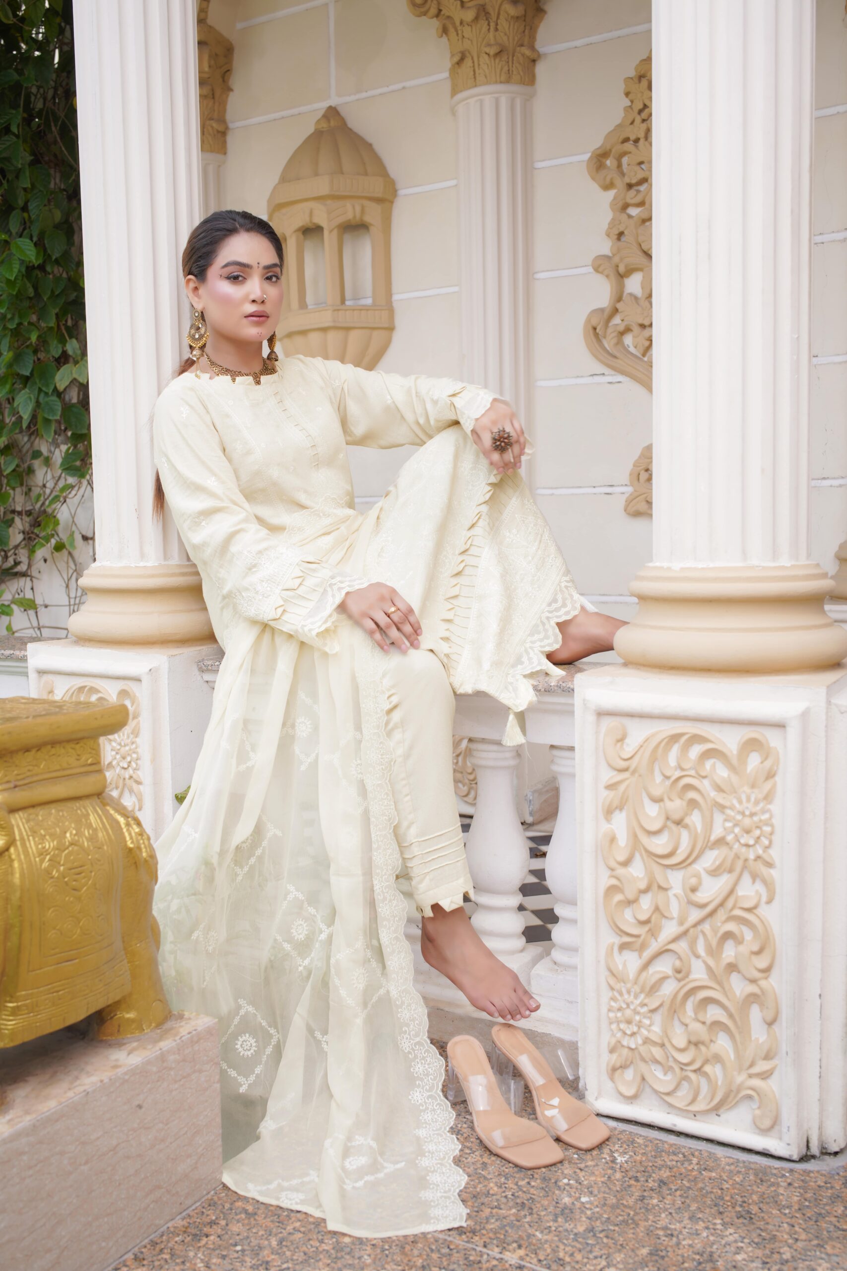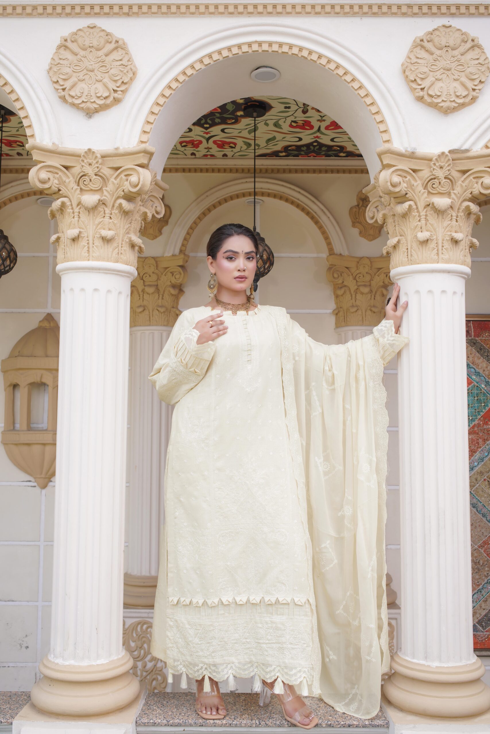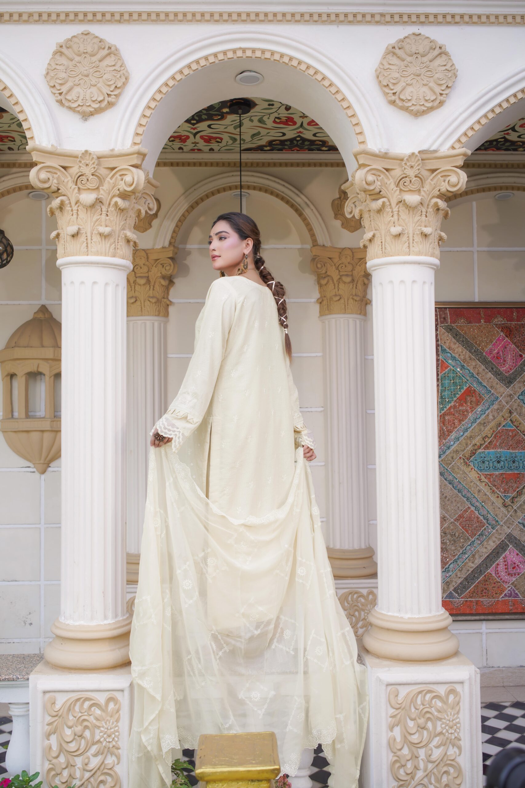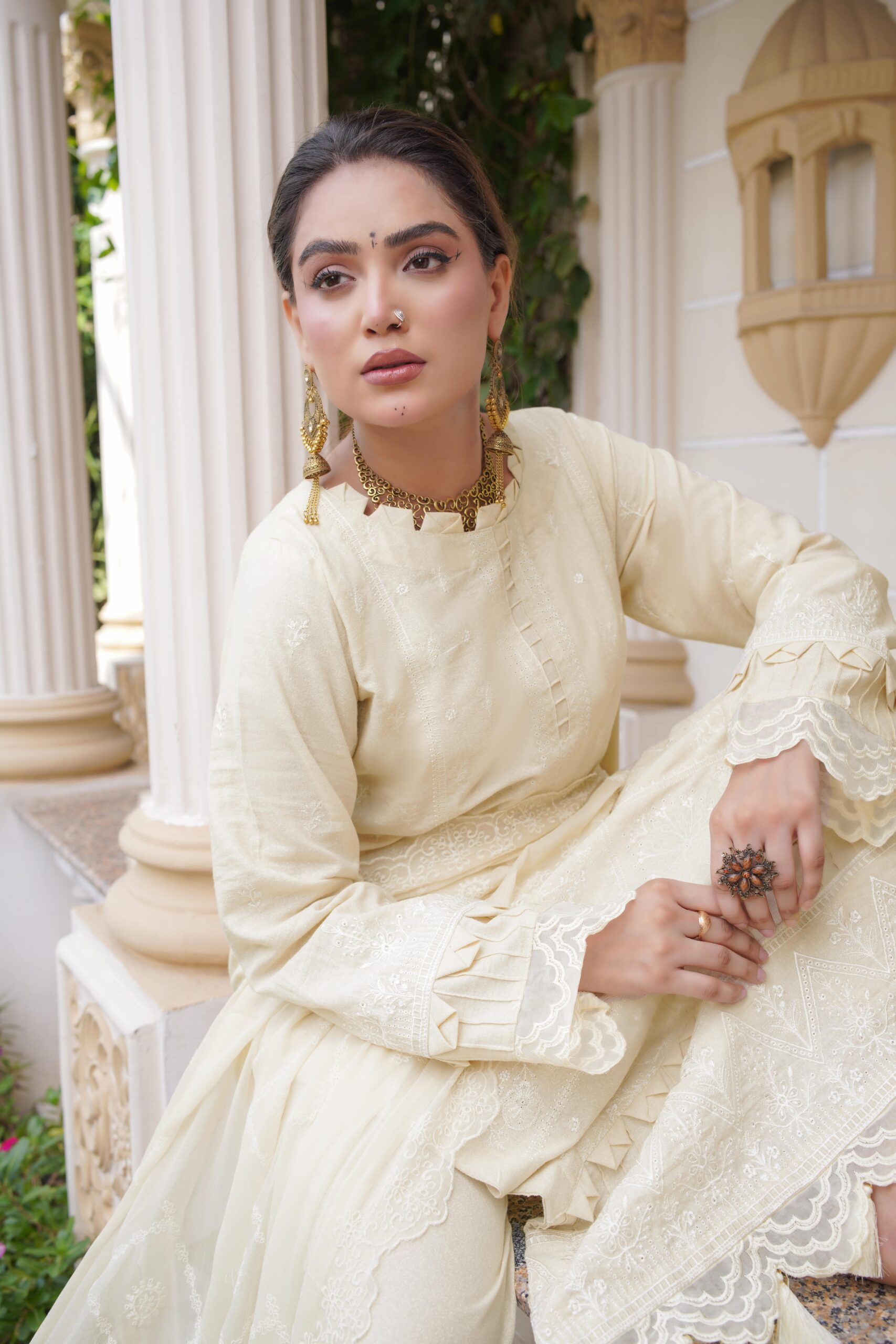 Mooray Piya is a graceful symphony of tradition and elegance, woven into a design that speaks to timeless beauty. Crafted from premium embroidered Karandi, this outfit showcases intricate embroidery on the front, back, and sleeves—exuding refined sophistication with every thread.