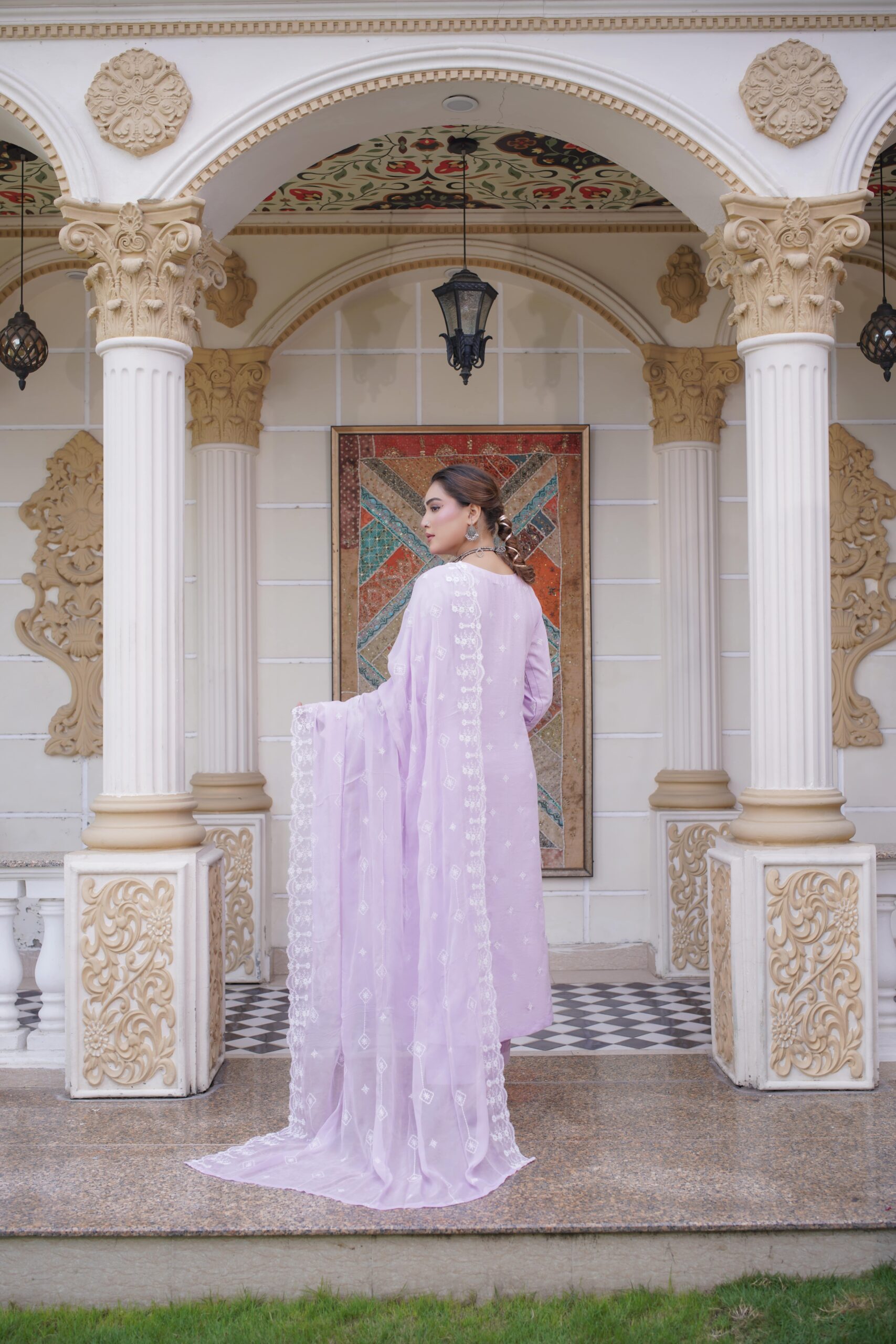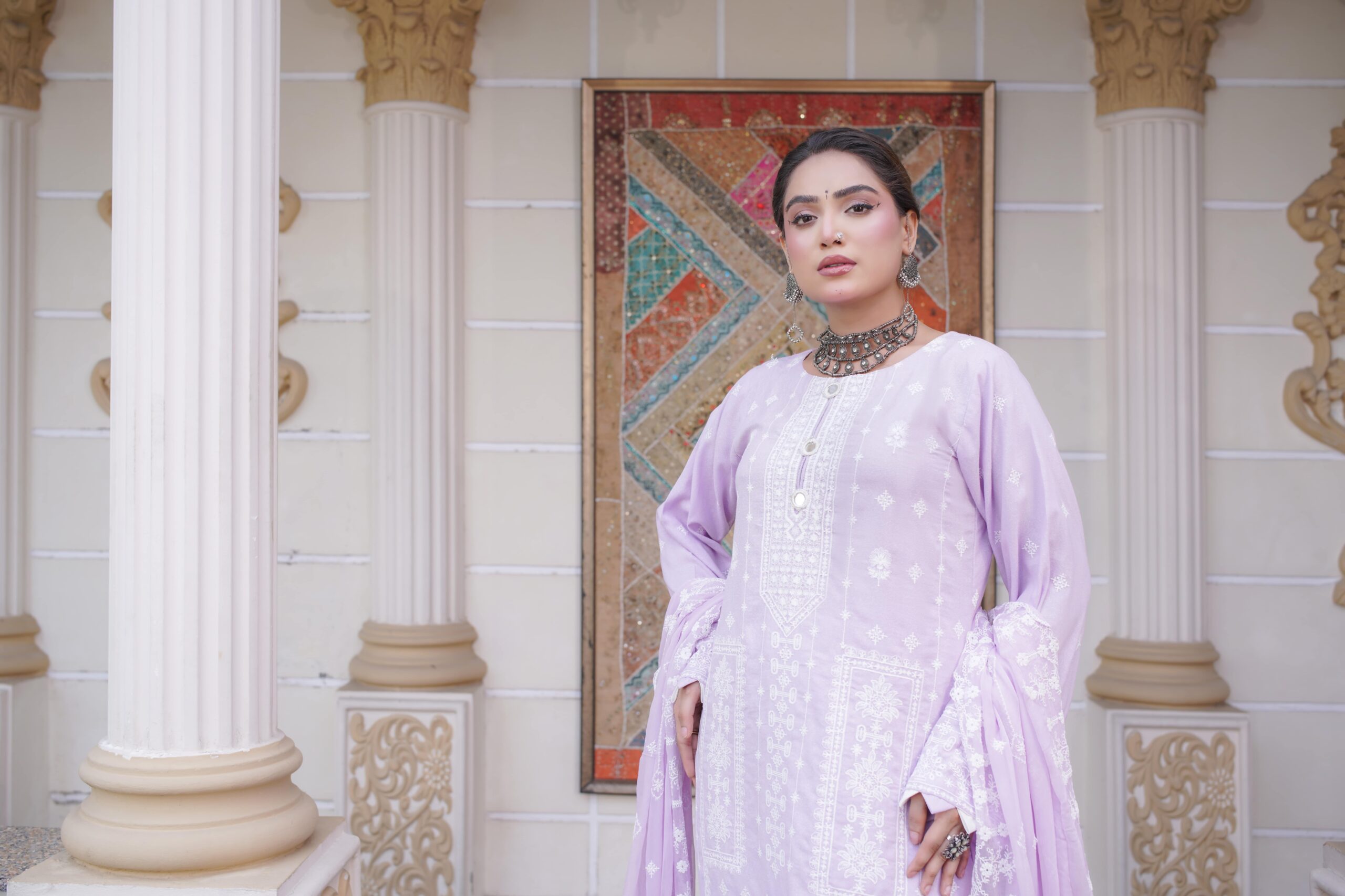 Complemented by a plain dyed trouser, the ensemble achieves a perfect balance between rich detail and wearable comfort. The showstopper of this look is the embroidered Crinkle Bamber dupatta, designed to drape you in charm and celebration. Its delicate textures and ornate patterns make Mooray Piya an ideal choice for festive gatherings, cultural soirées, and traditional occasions.
