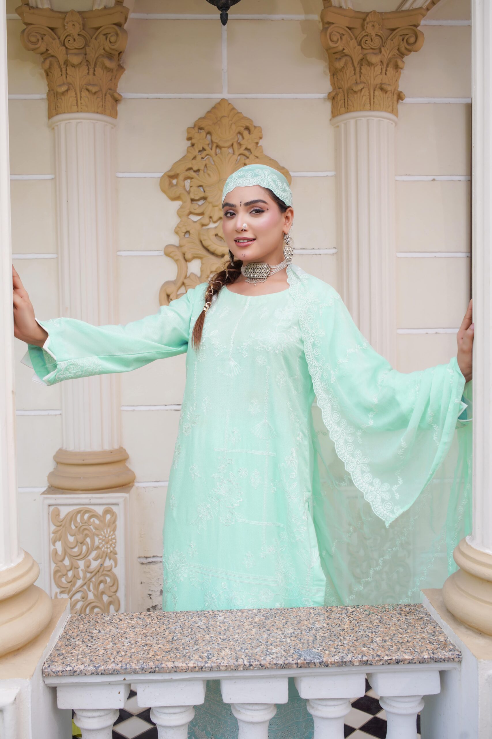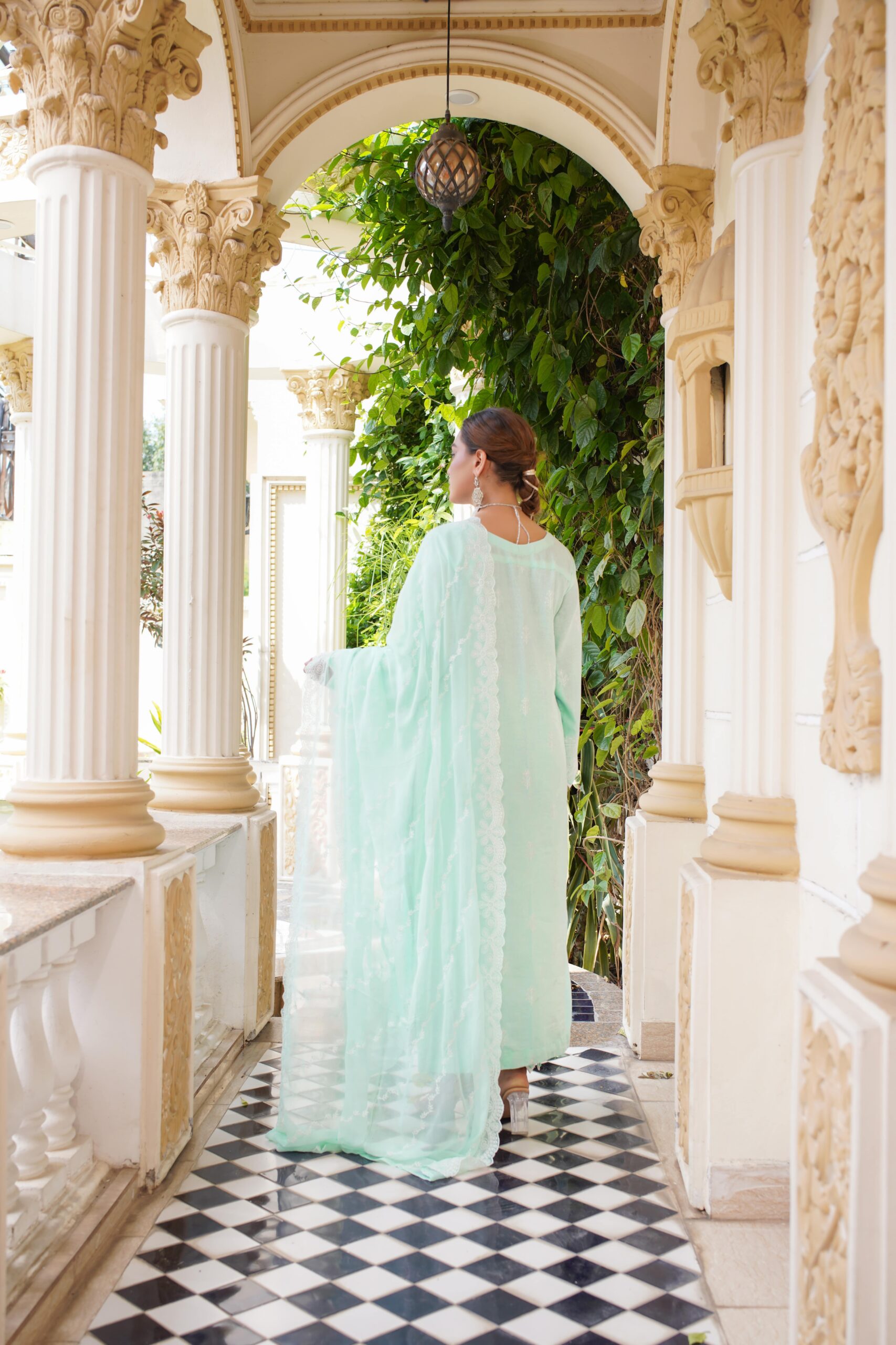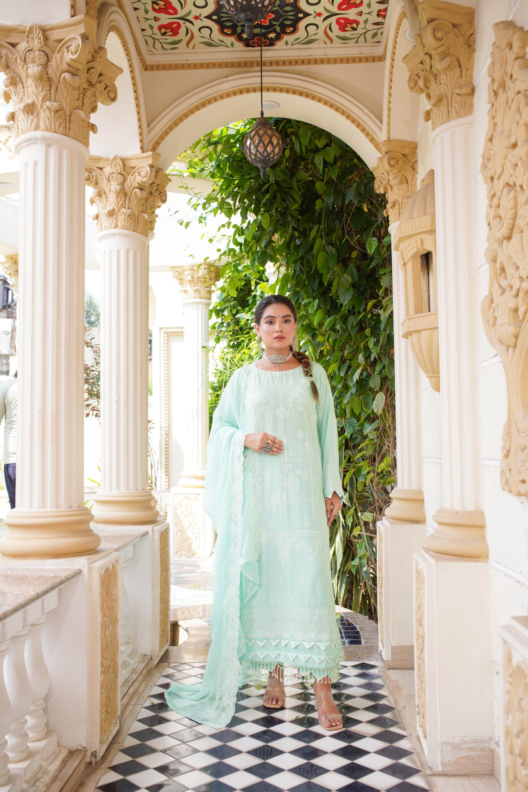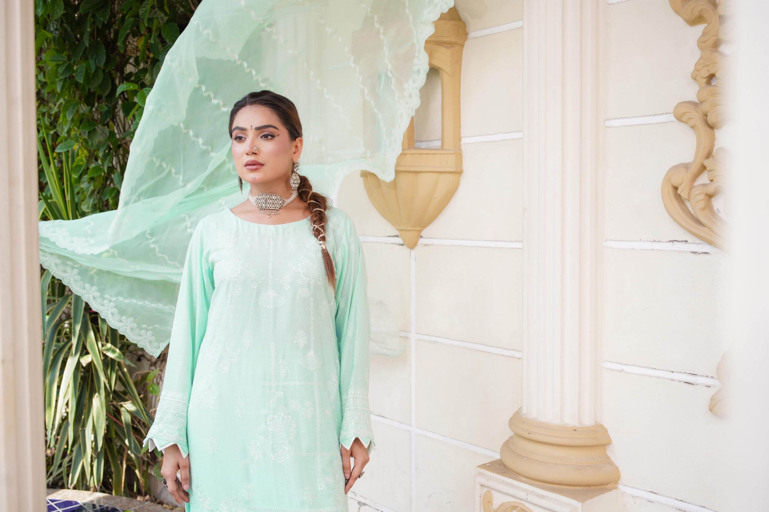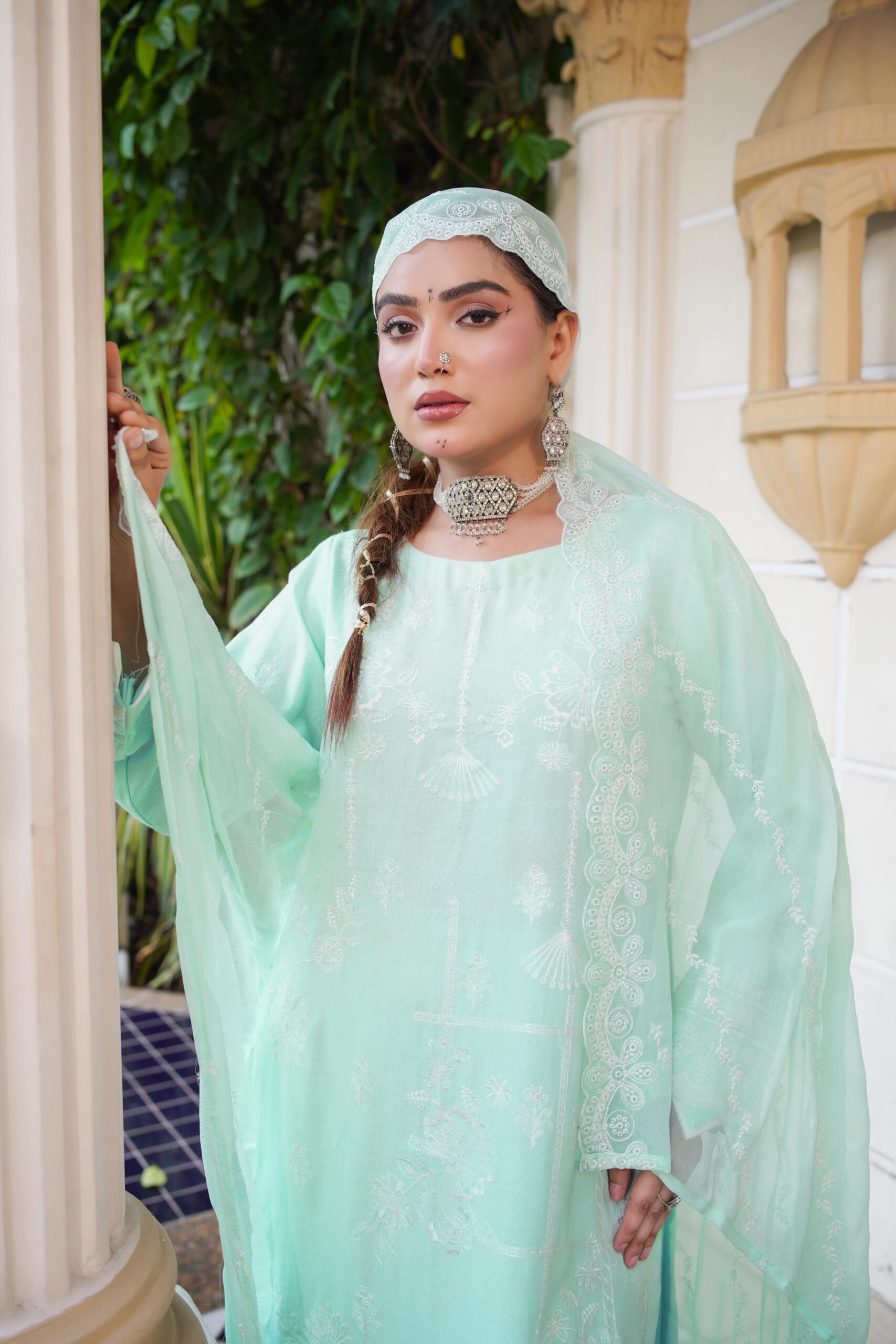 Complemented by a plain dyed trouser, the ensemble achieves a perfect balance between rich detail and wearable comfort. The showstopper of this look is the embroidered Crinkle Bamber dupatta, designed to drape you in charm and celebration. Its delicate textures and ornate patterns make Mooray Piya an ideal choice for festive gatherings, cultural soirées, and traditional occasions.
