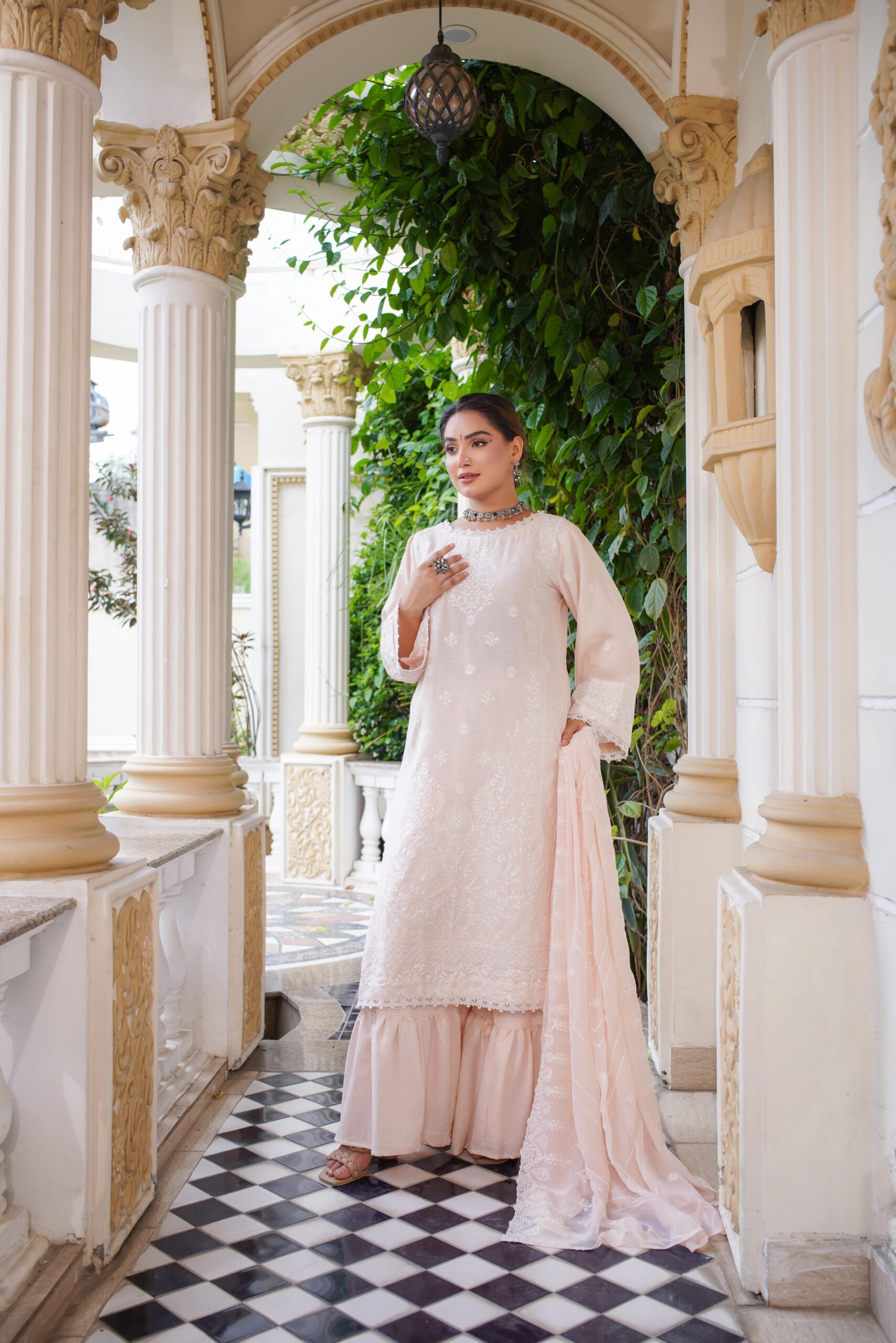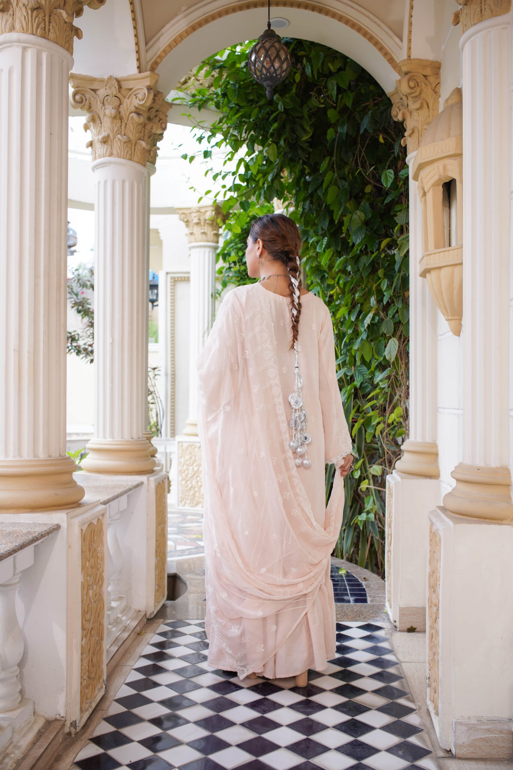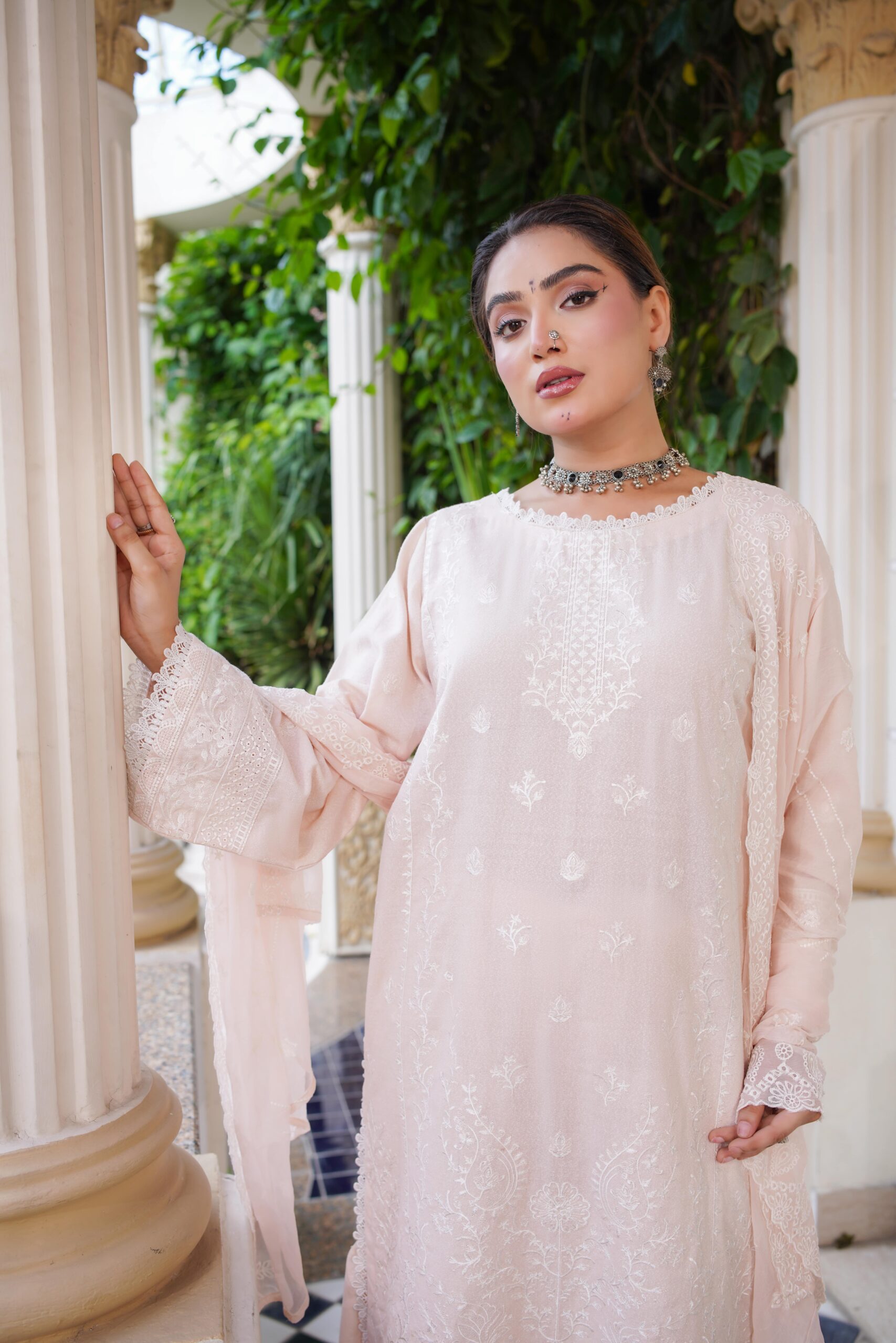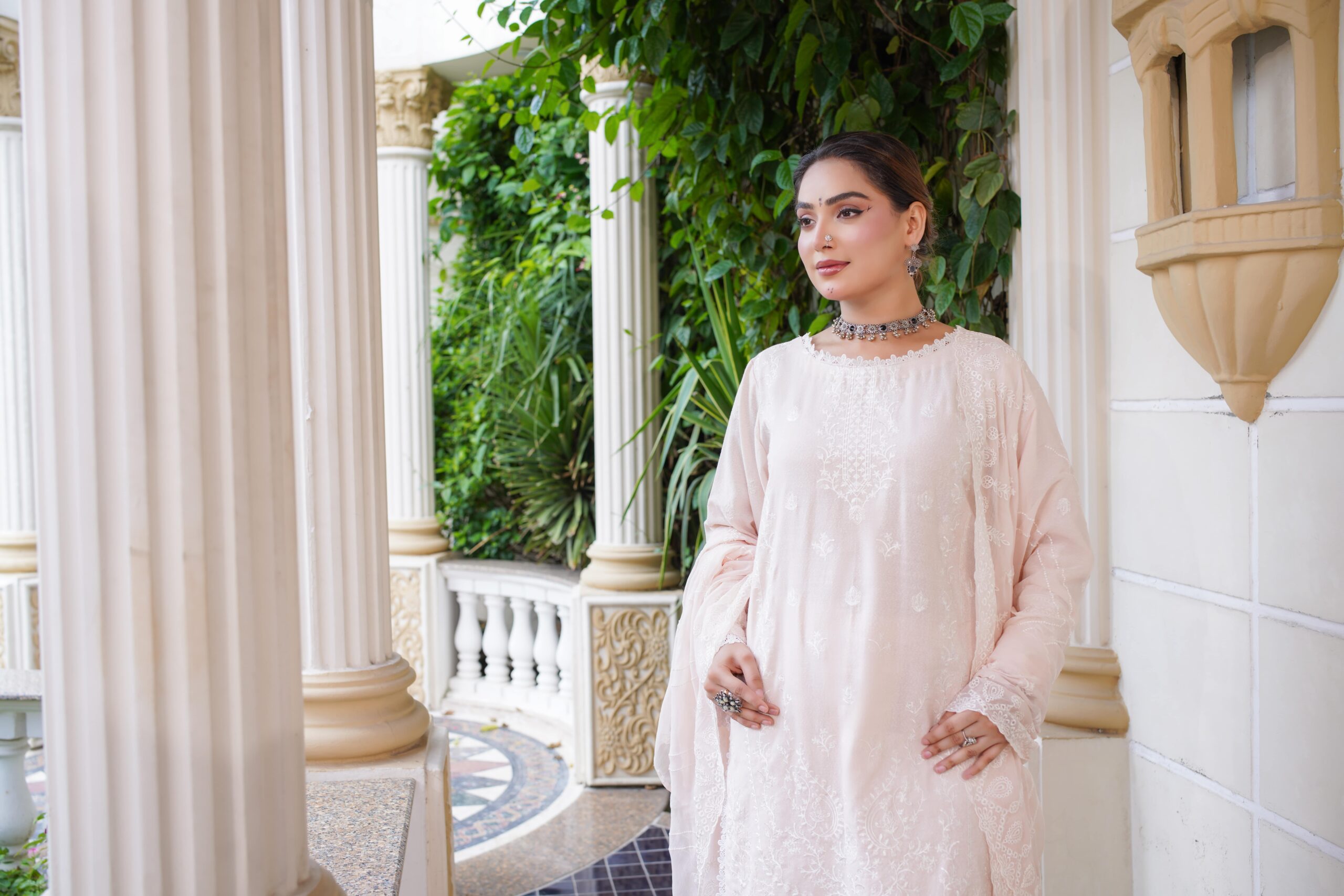 Complemented by a plain dyed trouser, the ensemble achieves a perfect balance between rich detail and wearable comfort. The showstopper of this look is the embroidered Crinkle Bamber dupatta, designed to drape you in charm and celebration. Its delicate textures and ornate patterns make Mooray Piya an ideal choice for festive gatherings, cultural soirées, and traditional occasions.
