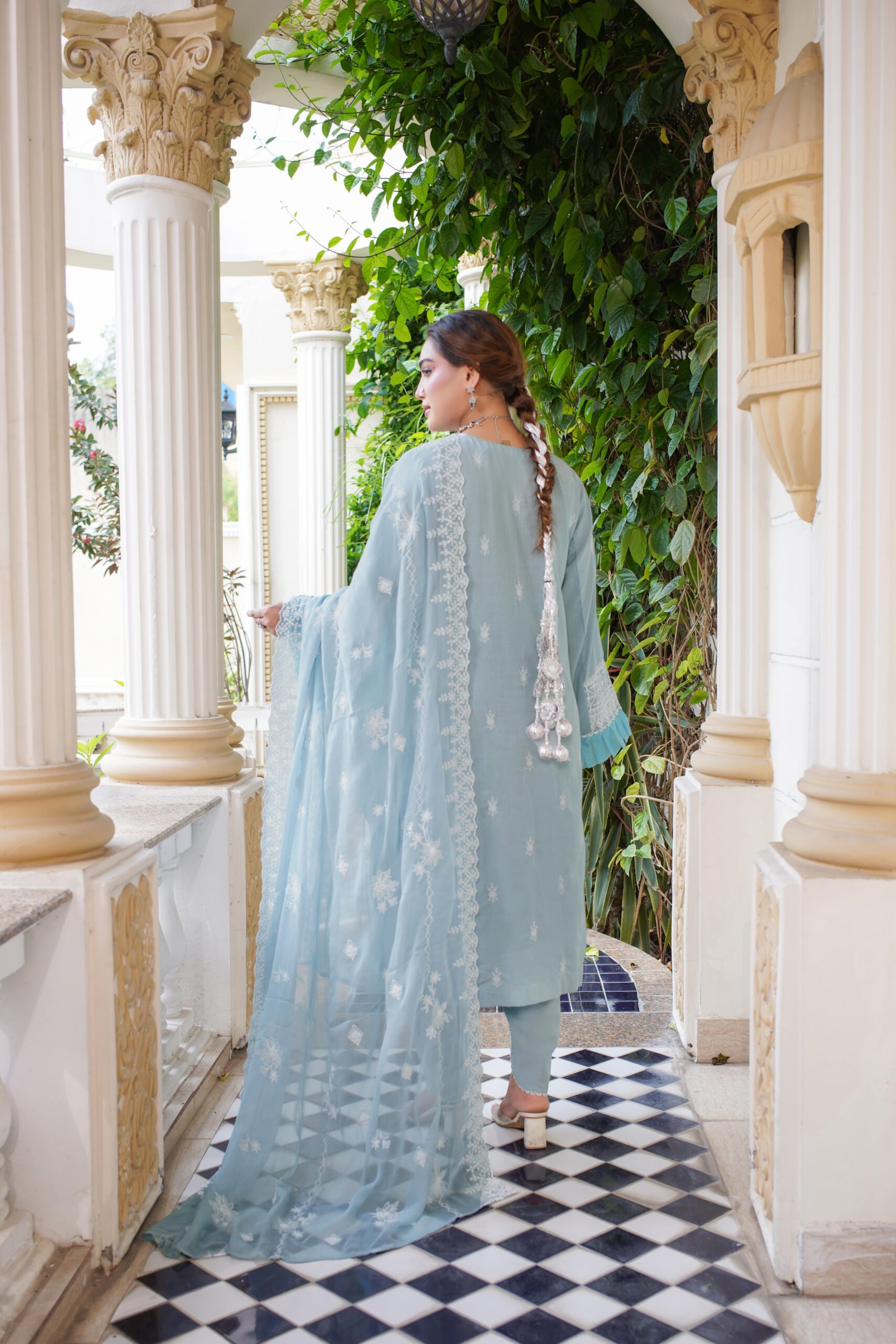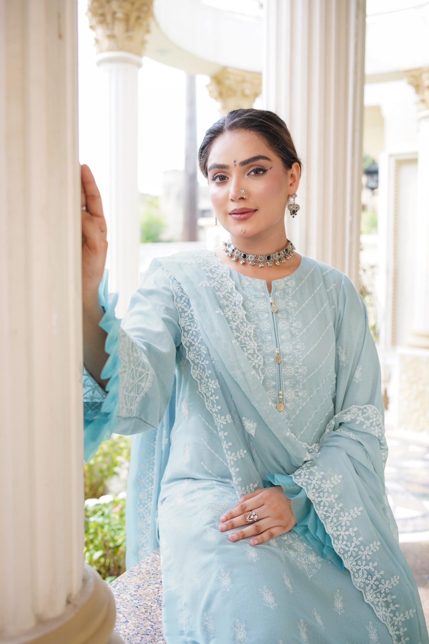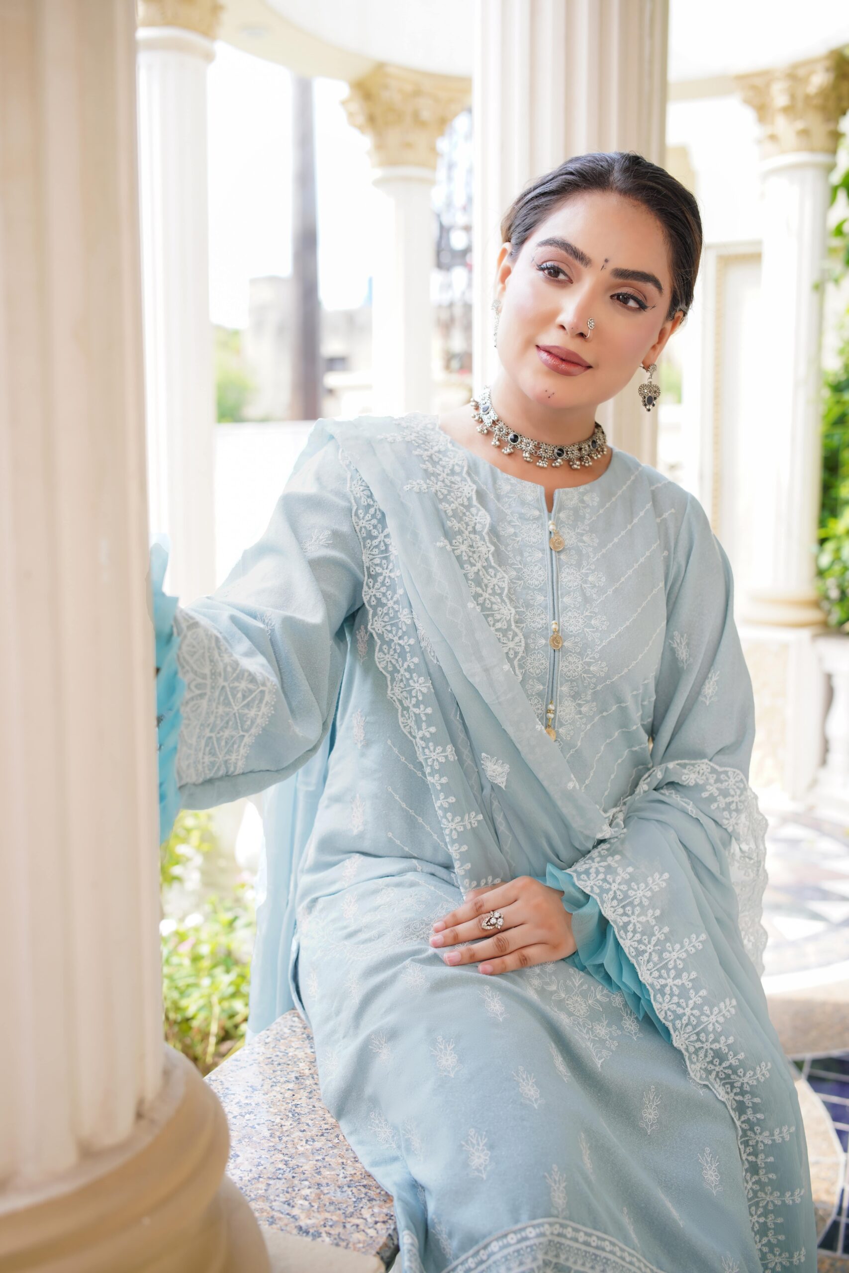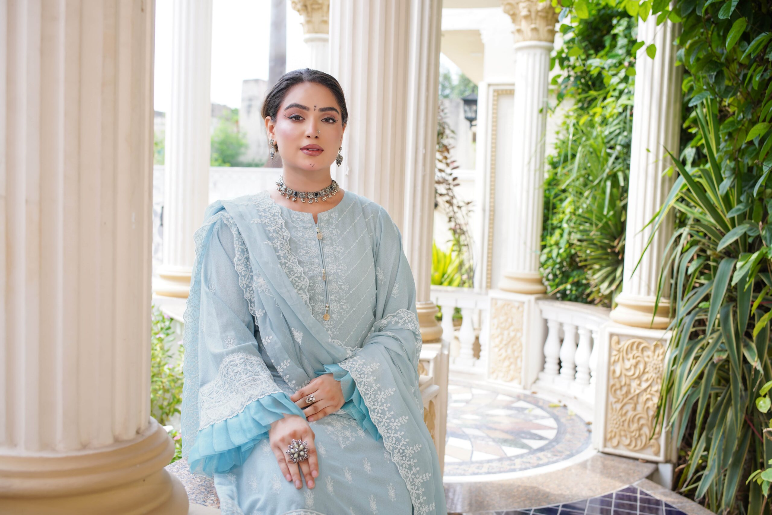 Complemented by a plain dyed trouser, the ensemble achieves a perfect balance between rich detail and wearable comfort. The showstopper of this look is the embroidered Crinkle Bamber dupatta, designed to drape you in charm and celebration. Its delicate textures and ornate patterns make Mooray Piya an ideal choice for festive gatherings, cultural soirées, and traditional occasions.