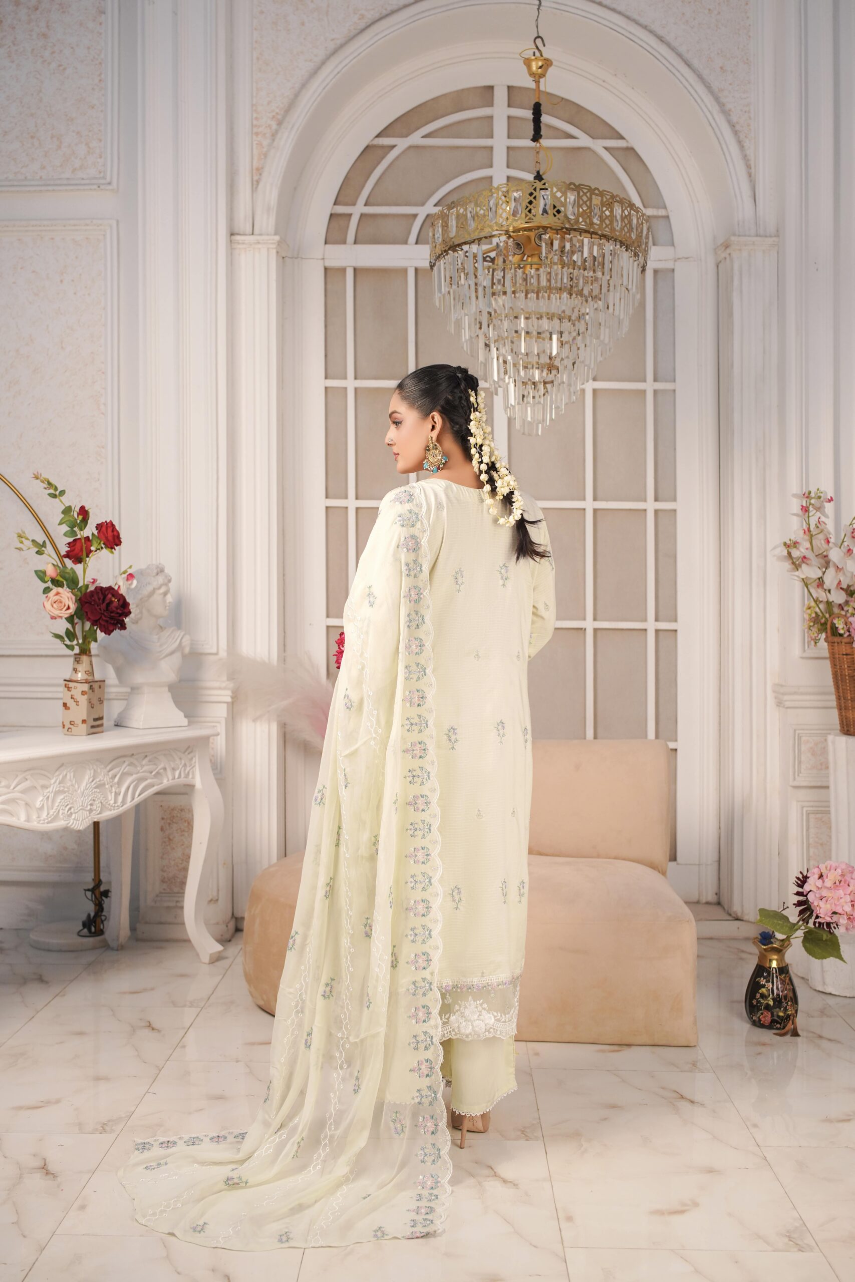 is a graceful expression of timeless beauty and refined elegance. Crafted from premium embroidered viscose, this ensemble embodies sophistication through delicate embroidery that enhances its luxurious texture. The front, back, and sleeves are adorned with intricate threadwork, while the plain dyed trouser provides the perfect balance to complete the refined look.