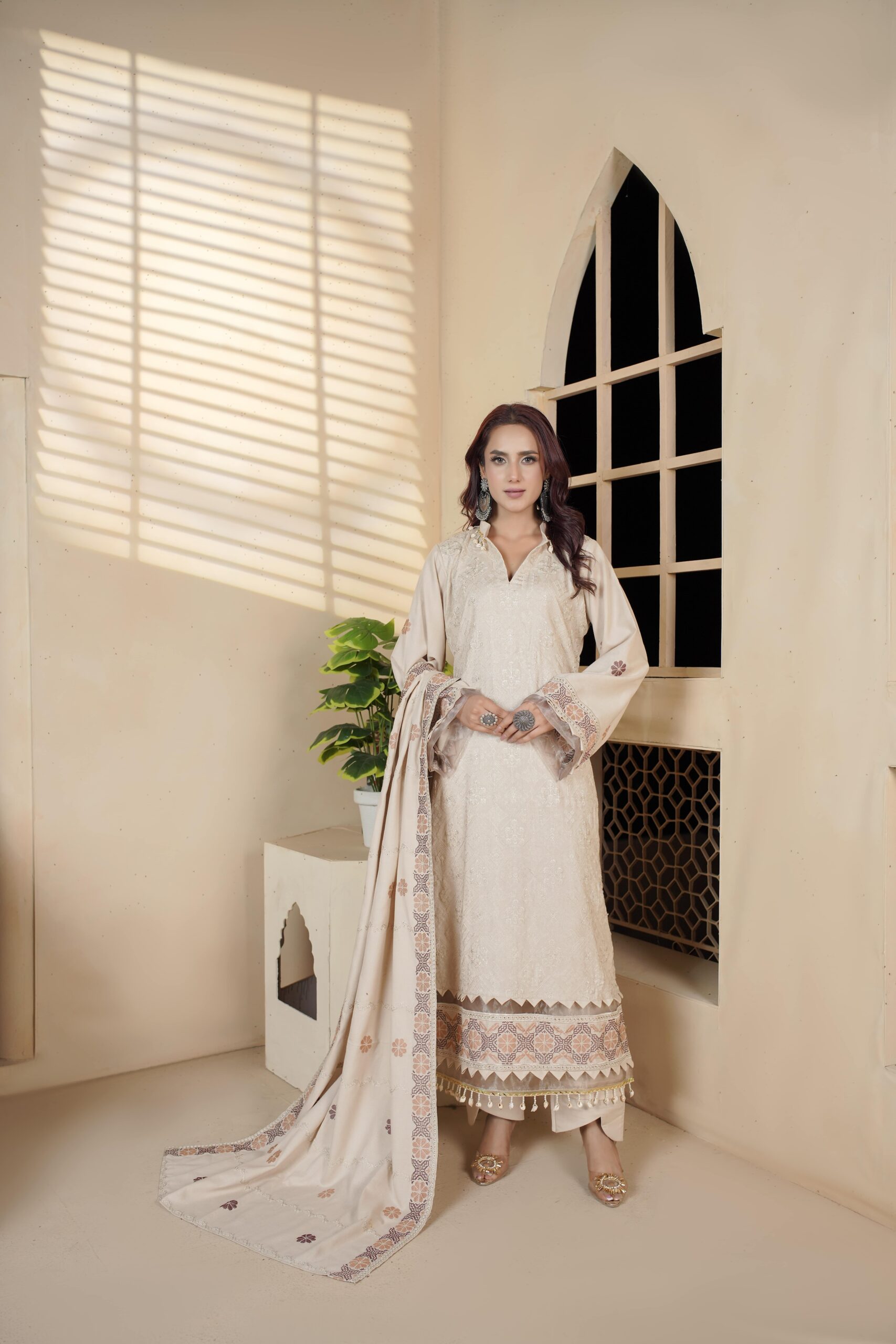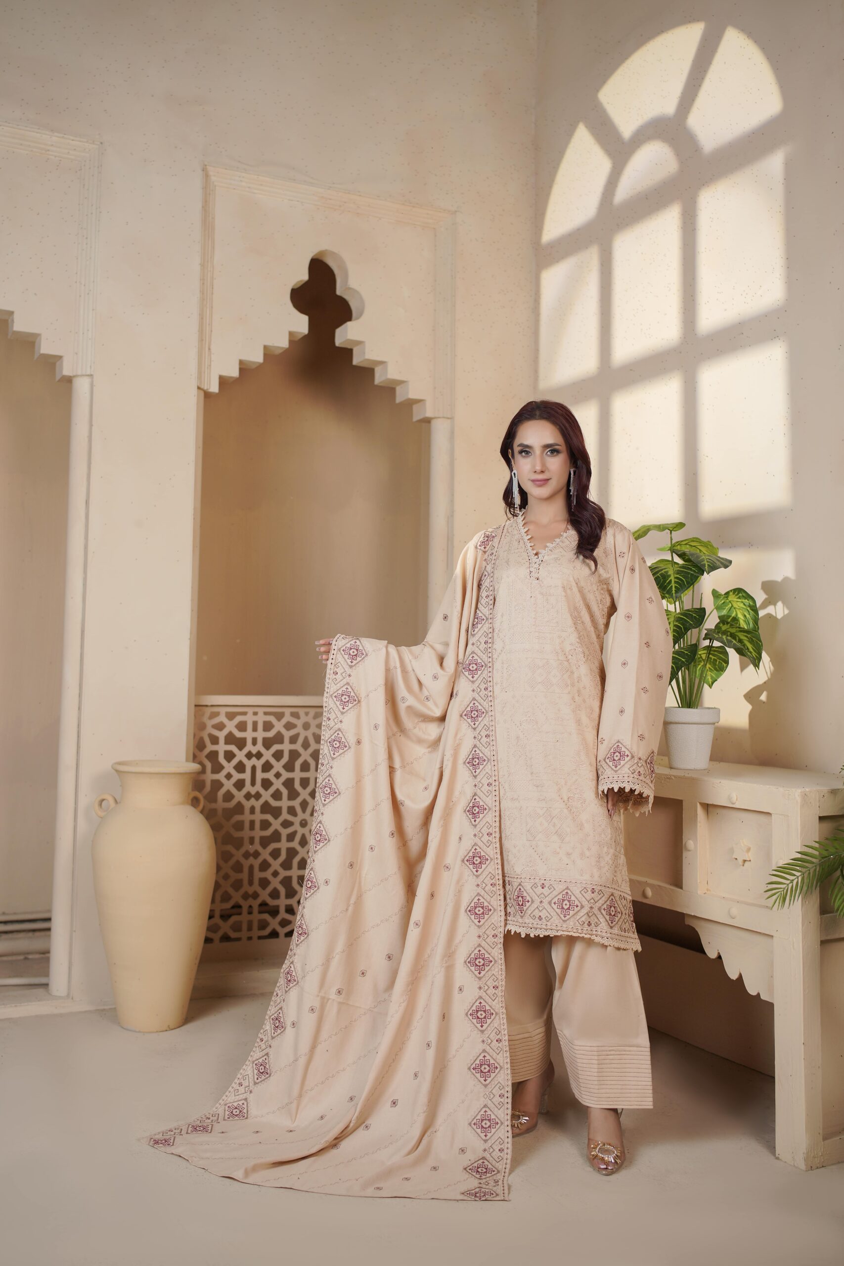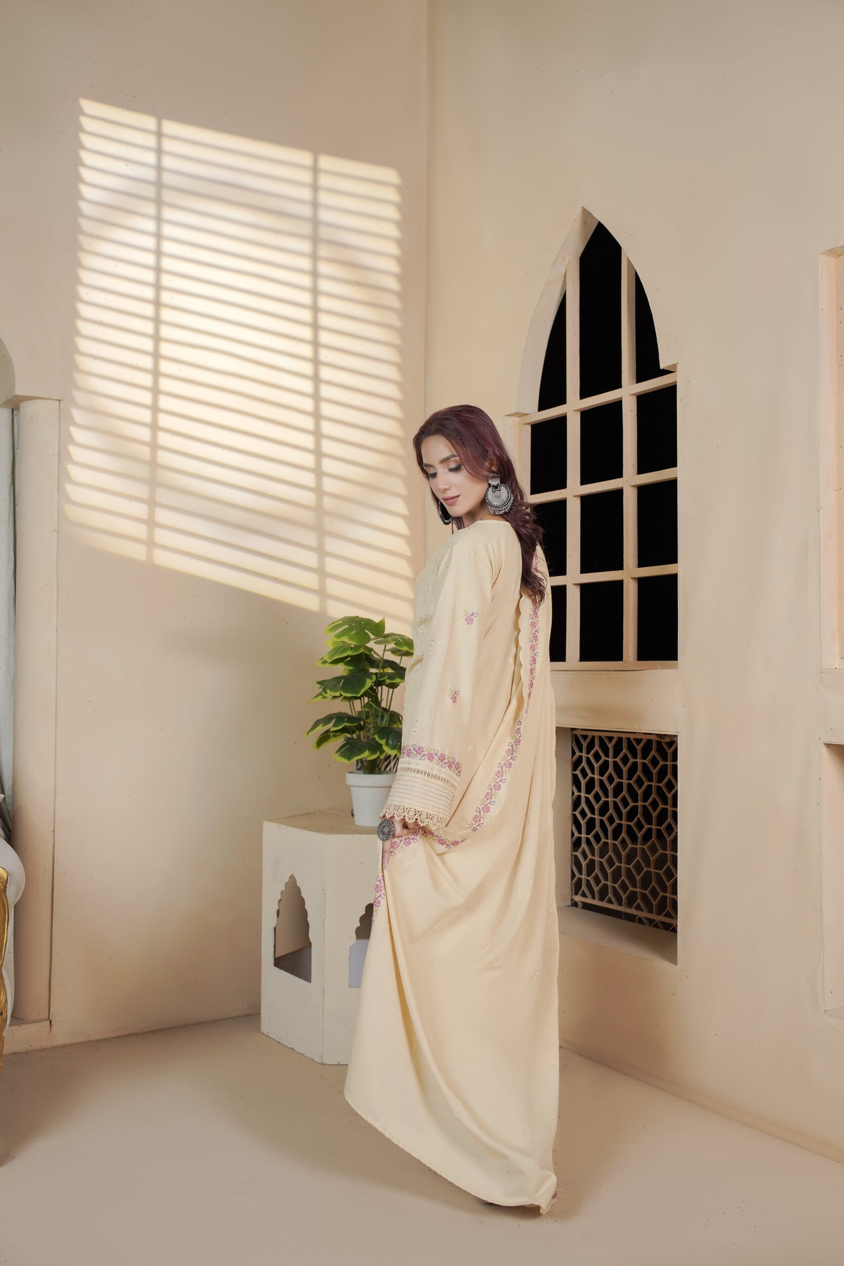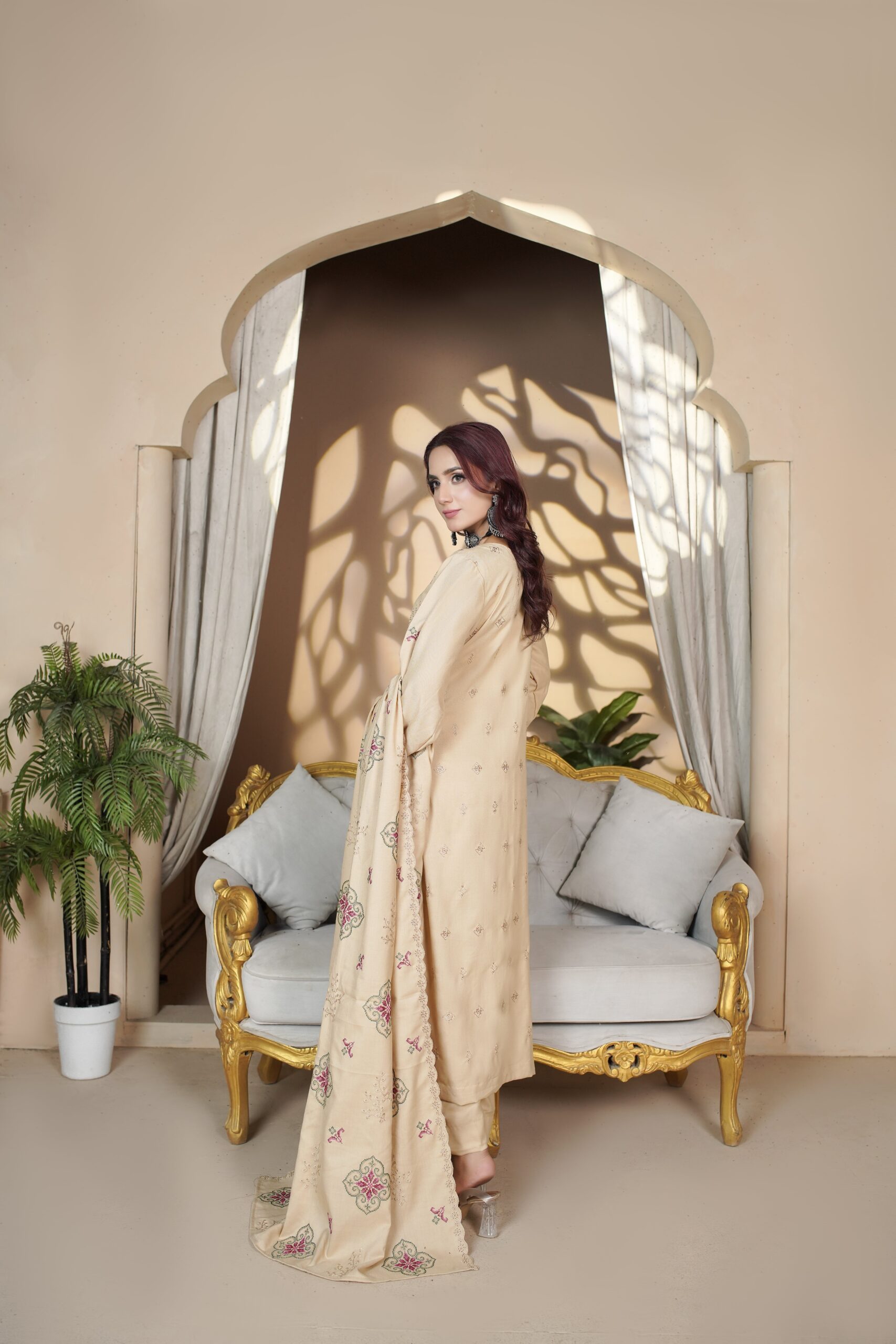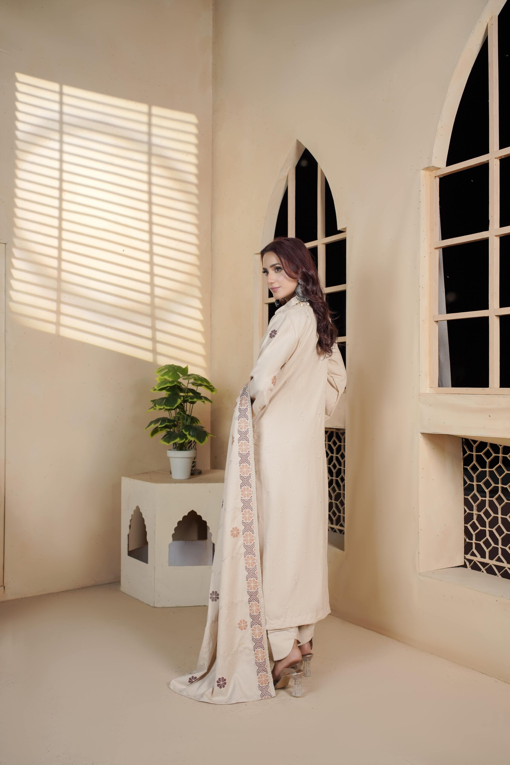 Manizay presents Muhabat Nama— a graceful winter ensemble that embodies sophistication and warmth. Crafted from premium embroidered Dhanak fabric, this outfit is a reflection of timeless artistry and refined elegance. The intricate embroidery on the front, back, and sleeves showcases exquisite craftsmanship, while the plain dyed trouser adds balance and simplicity.