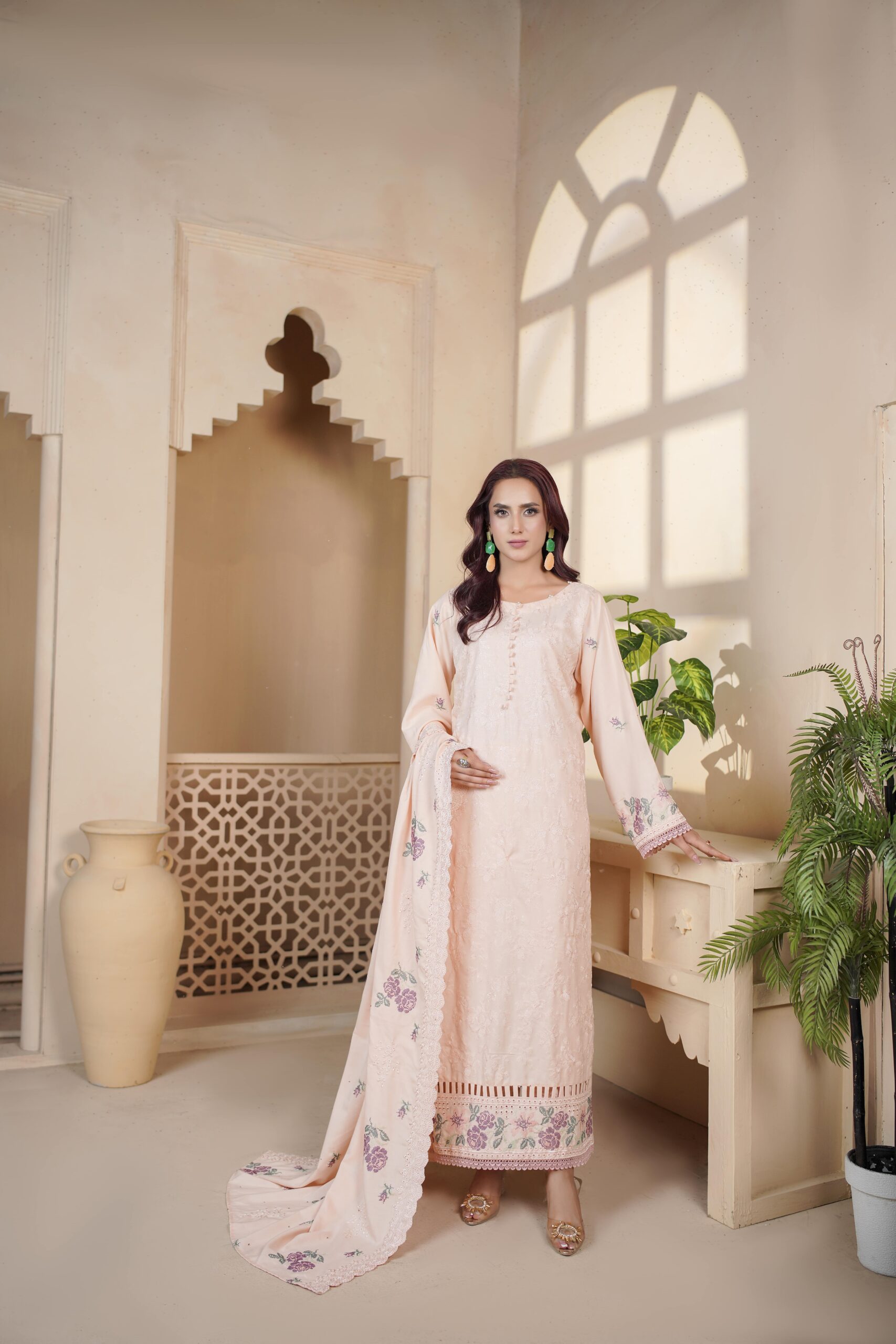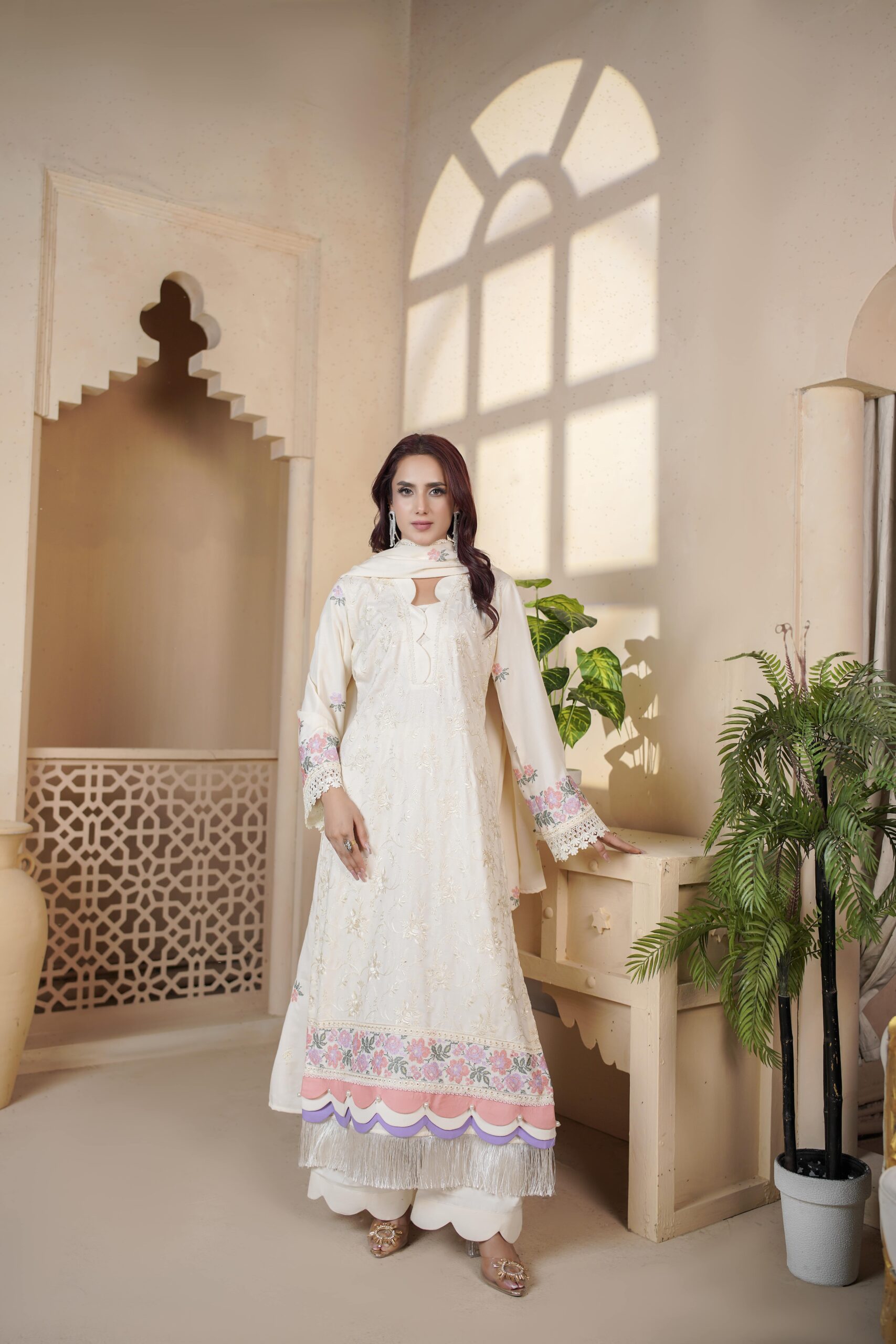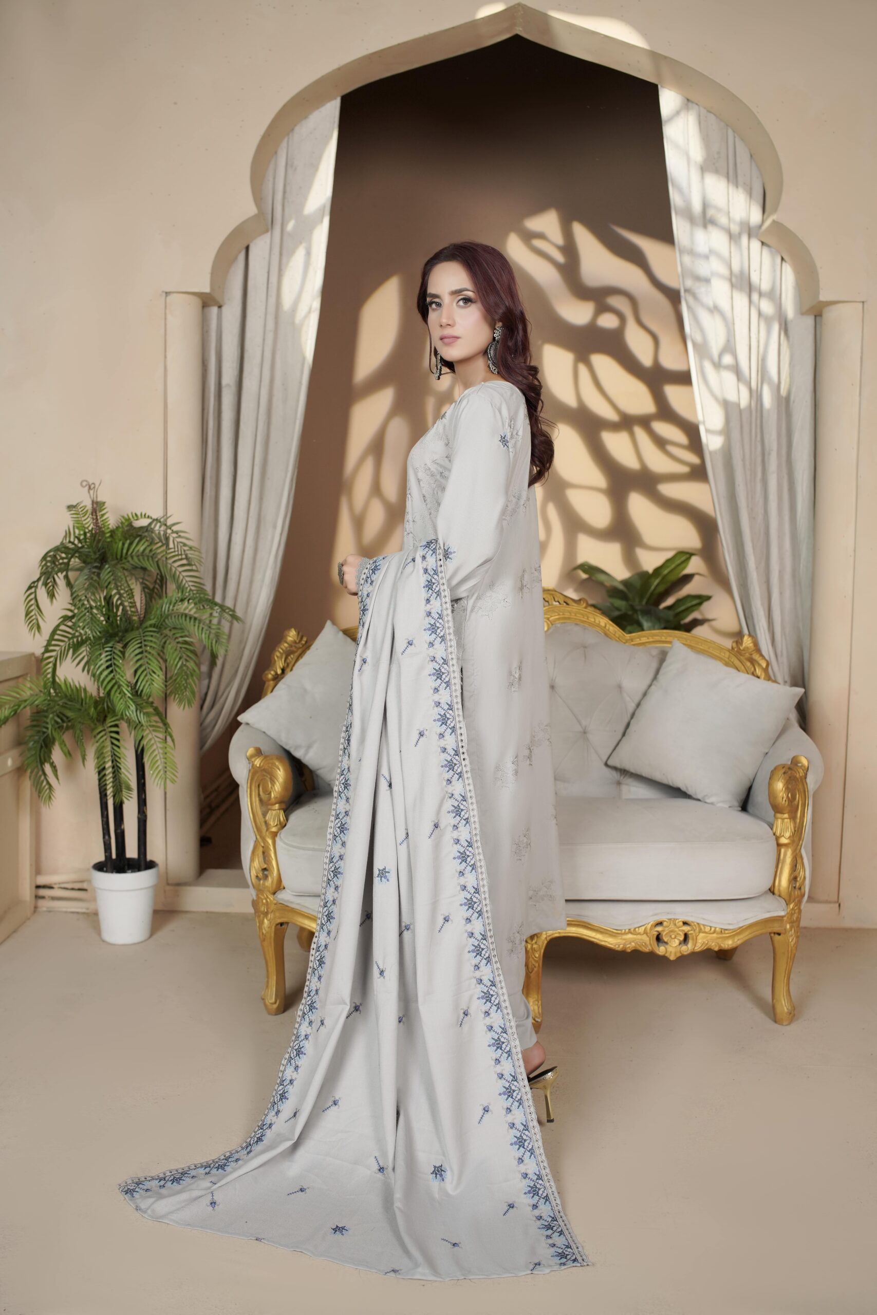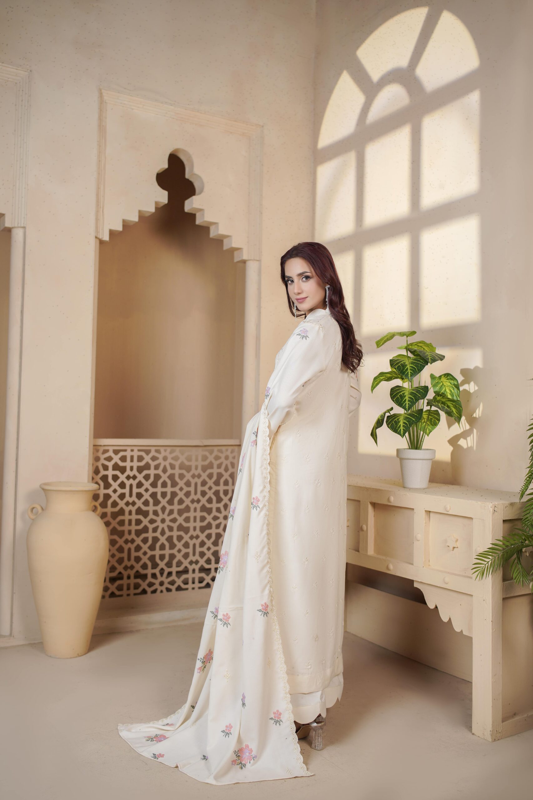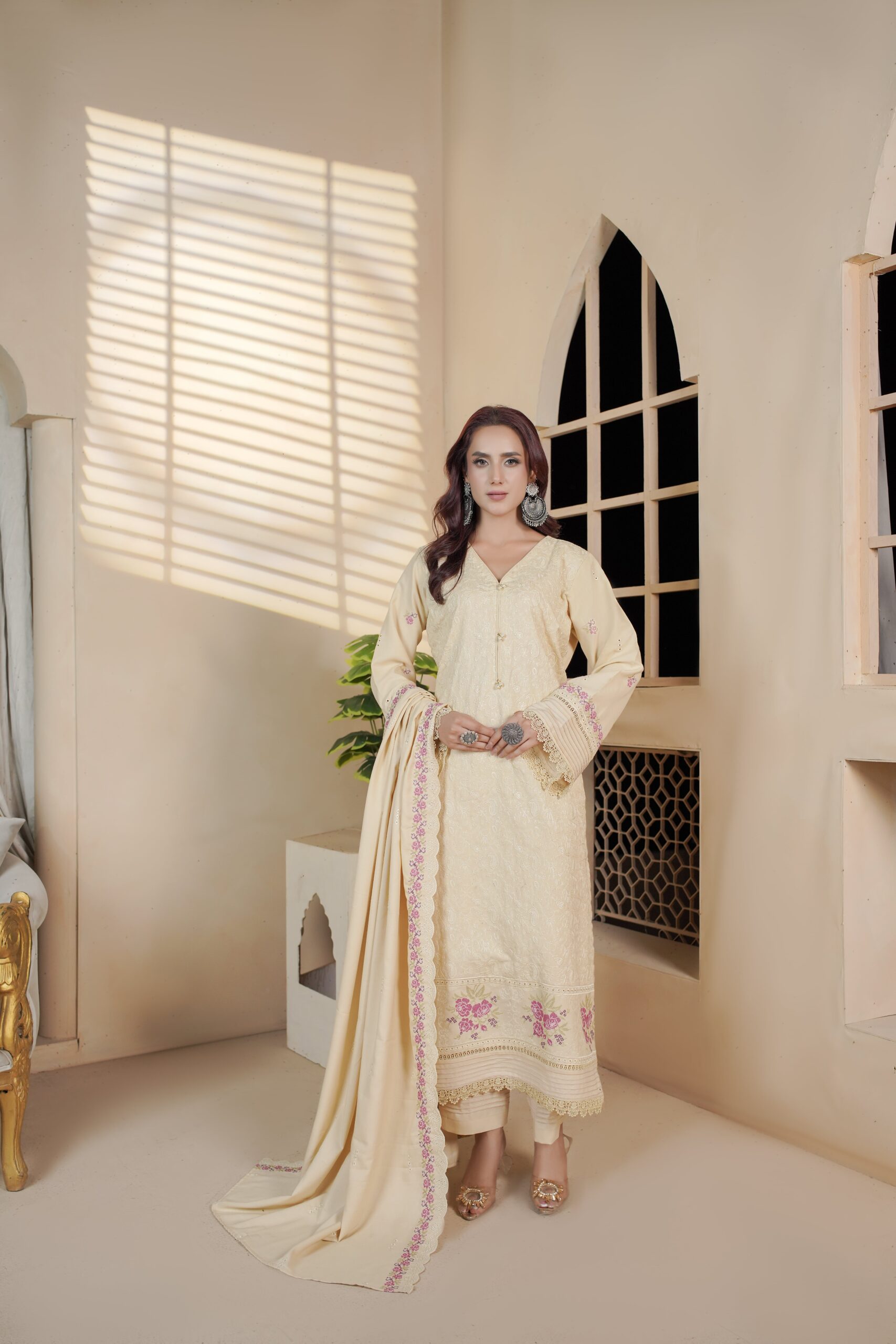 Manizay presents Muhabat Nama— a graceful winter ensemble that embodies sophistication and warmth. Crafted from premium embroidered Dhanak fabric, this outfit is a reflection of timeless artistry and refined elegance. The intricate embroidery on the front, back, and sleeves showcases exquisite craftsmanship, while the plain dyed trouser adds balance and simplicity.