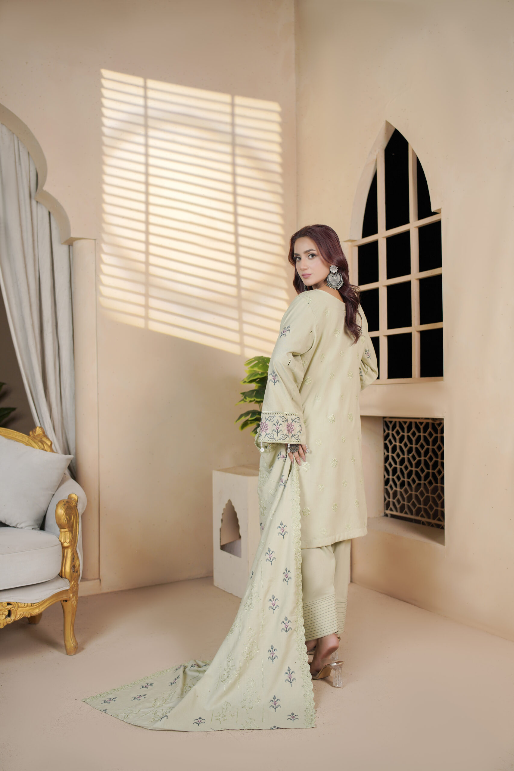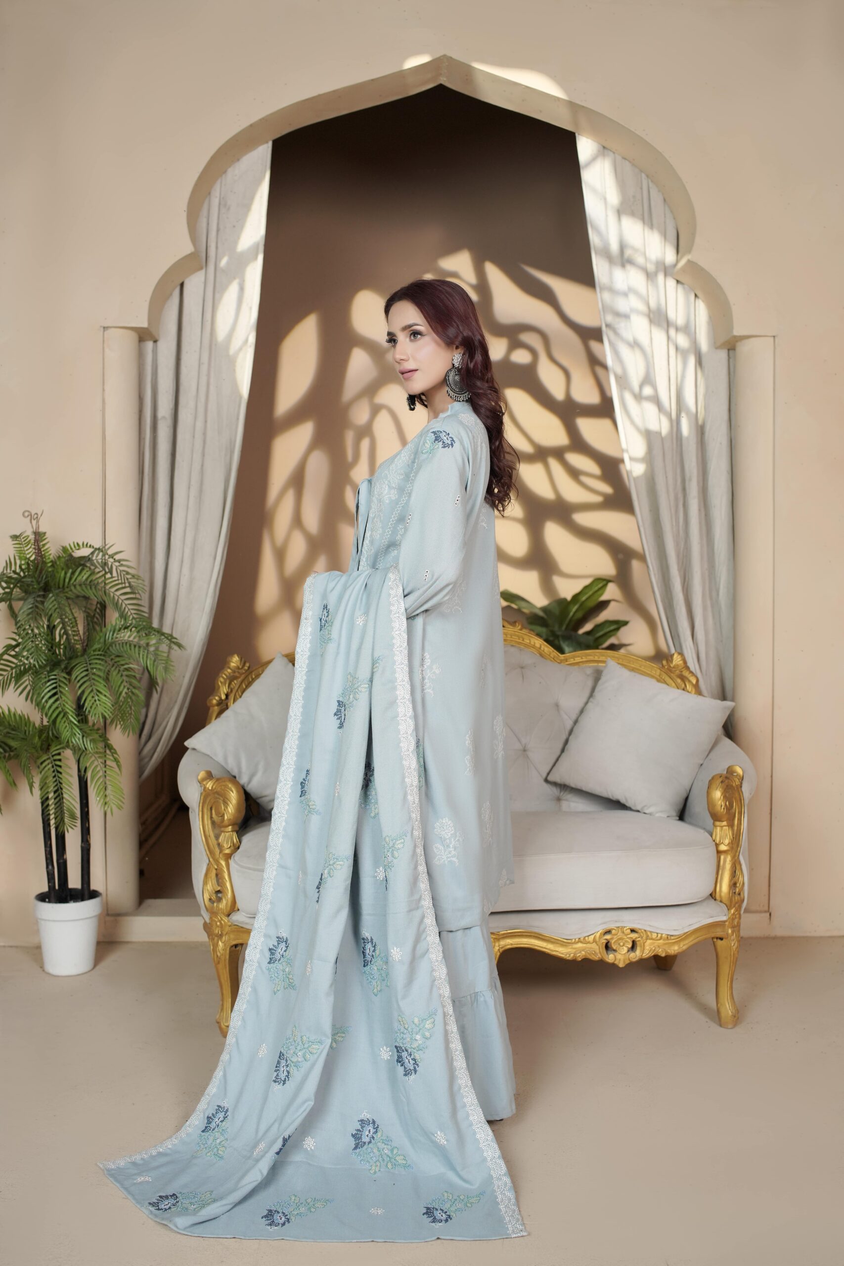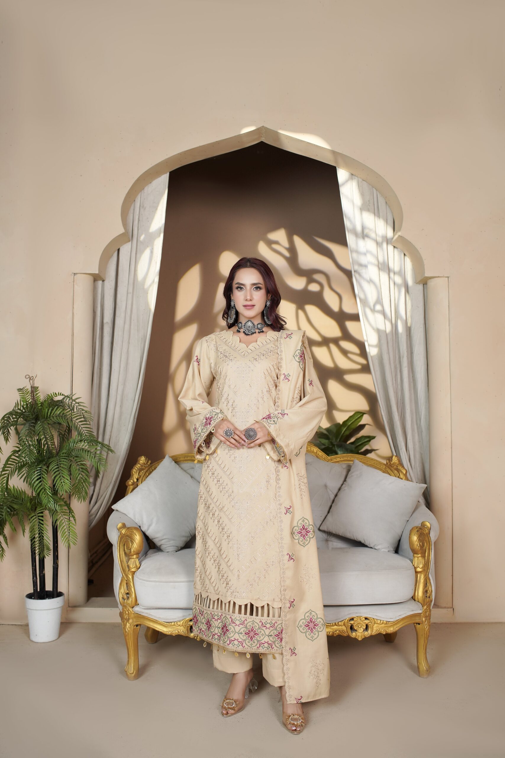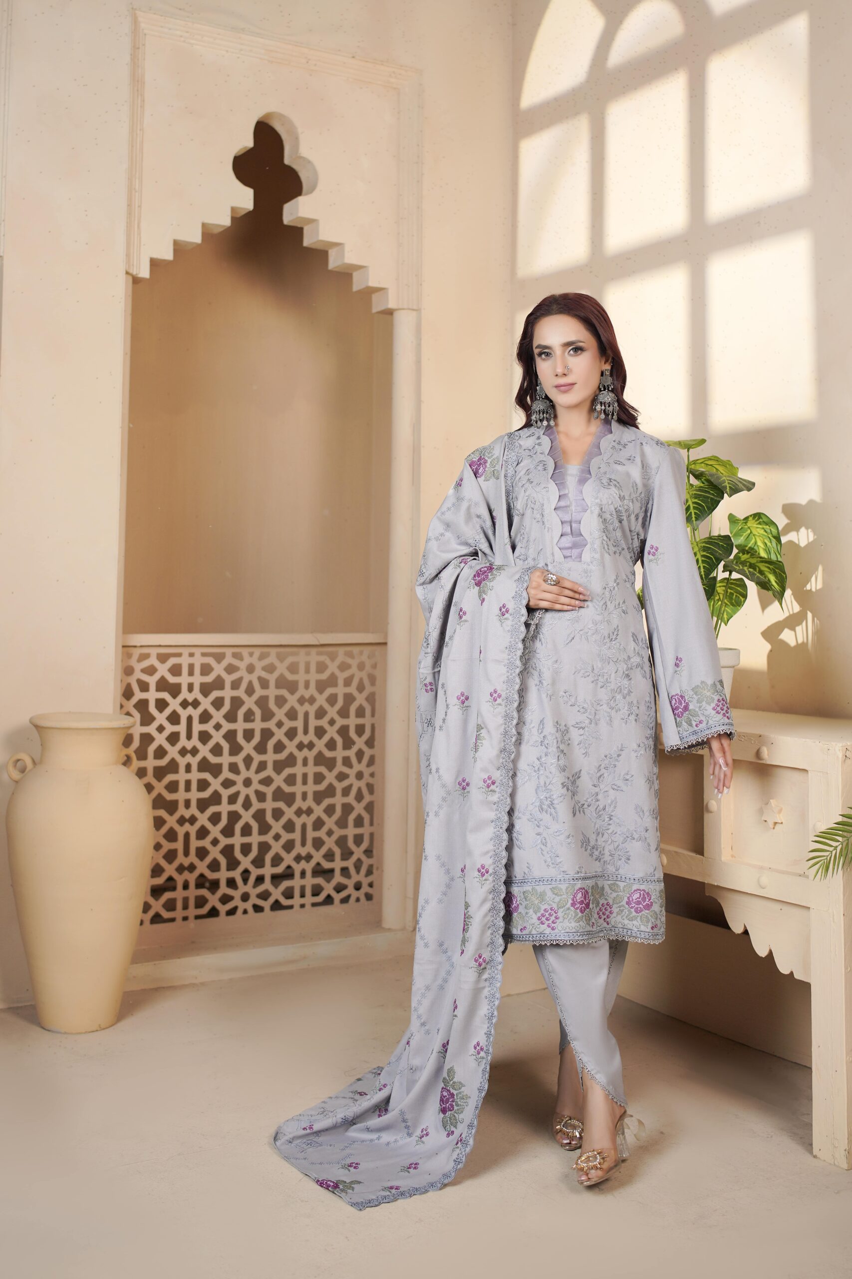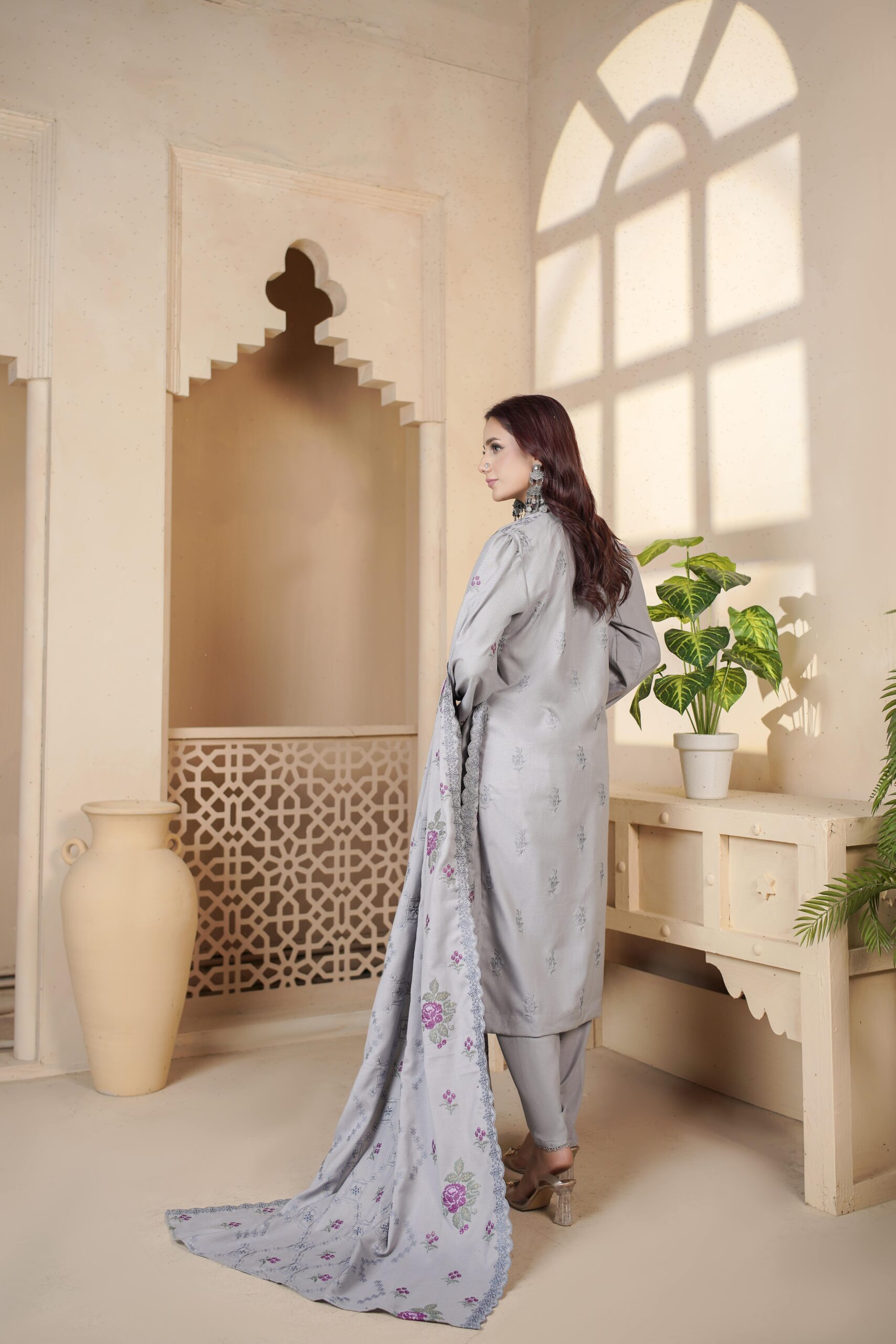 Manizay presents Muhabat Nama— a graceful winter ensemble that embodies sophistication and warmth. Crafted from premium embroidered Dhanak fabric, this outfit is a reflection of timeless artistry and refined elegance. The intricate embroidery on the front, back, and sleeves showcases exquisite craftsmanship, while the plain dyed trouser adds balance and simplicity.