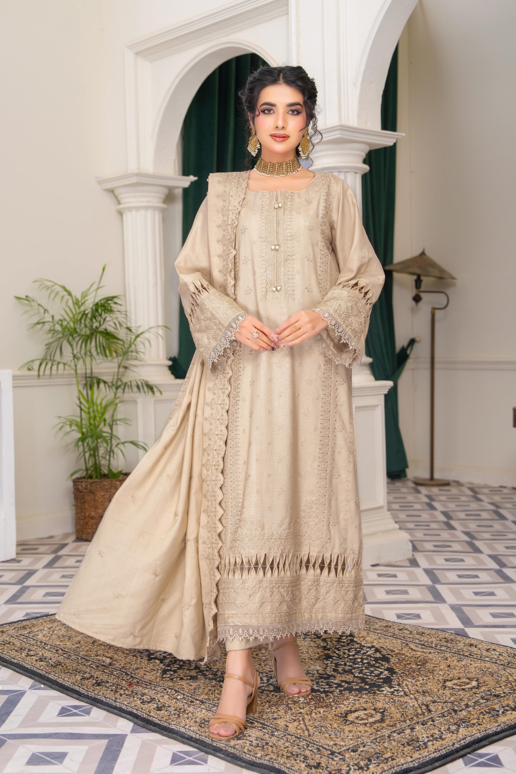 The ensemble is paired with a premium embroidered Dhanak shawl, completing the look with a touch of luxury and comfort. Elegant, warm, and mesmerizing — Nigah E Shokh captures the true essence of winter beauty.