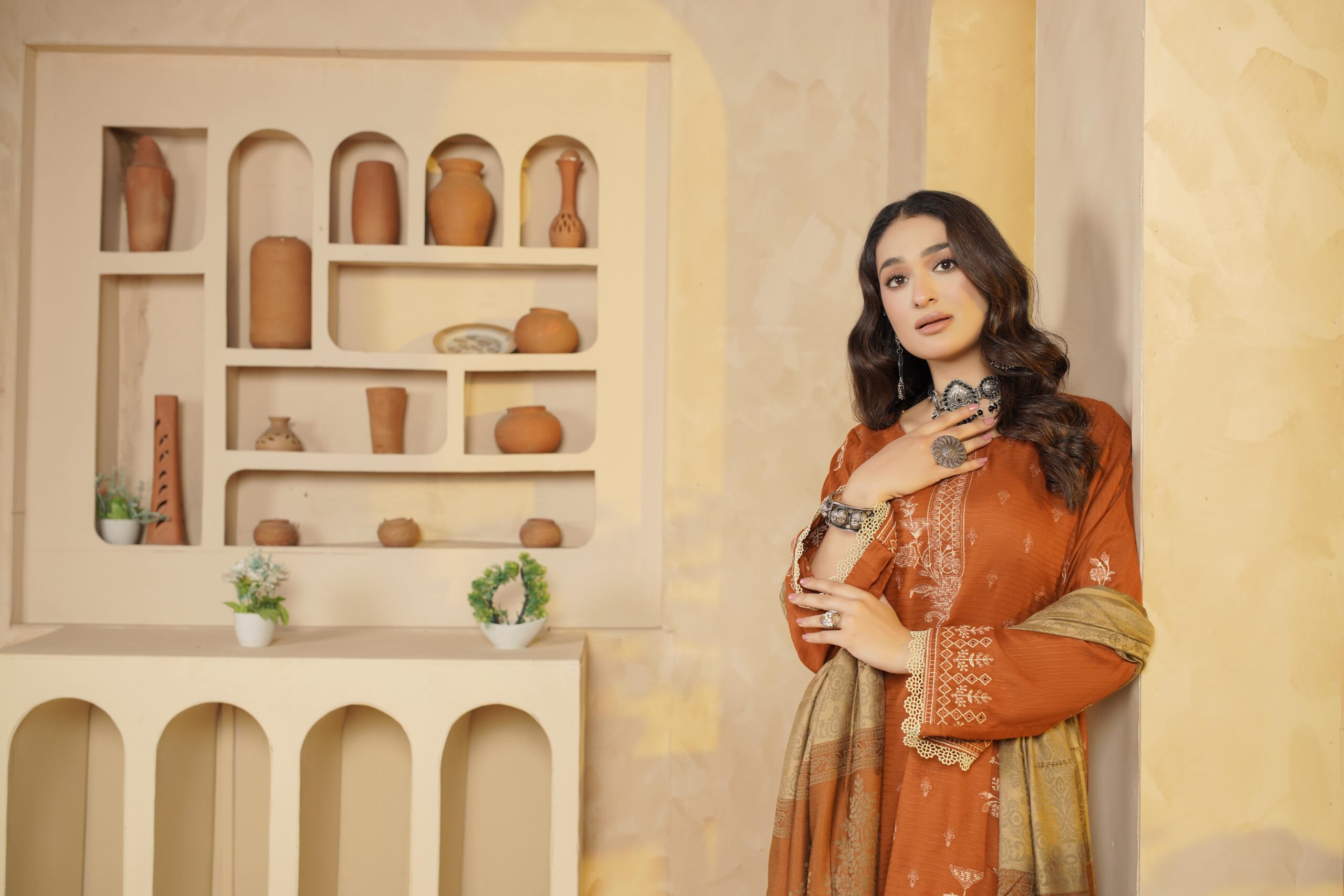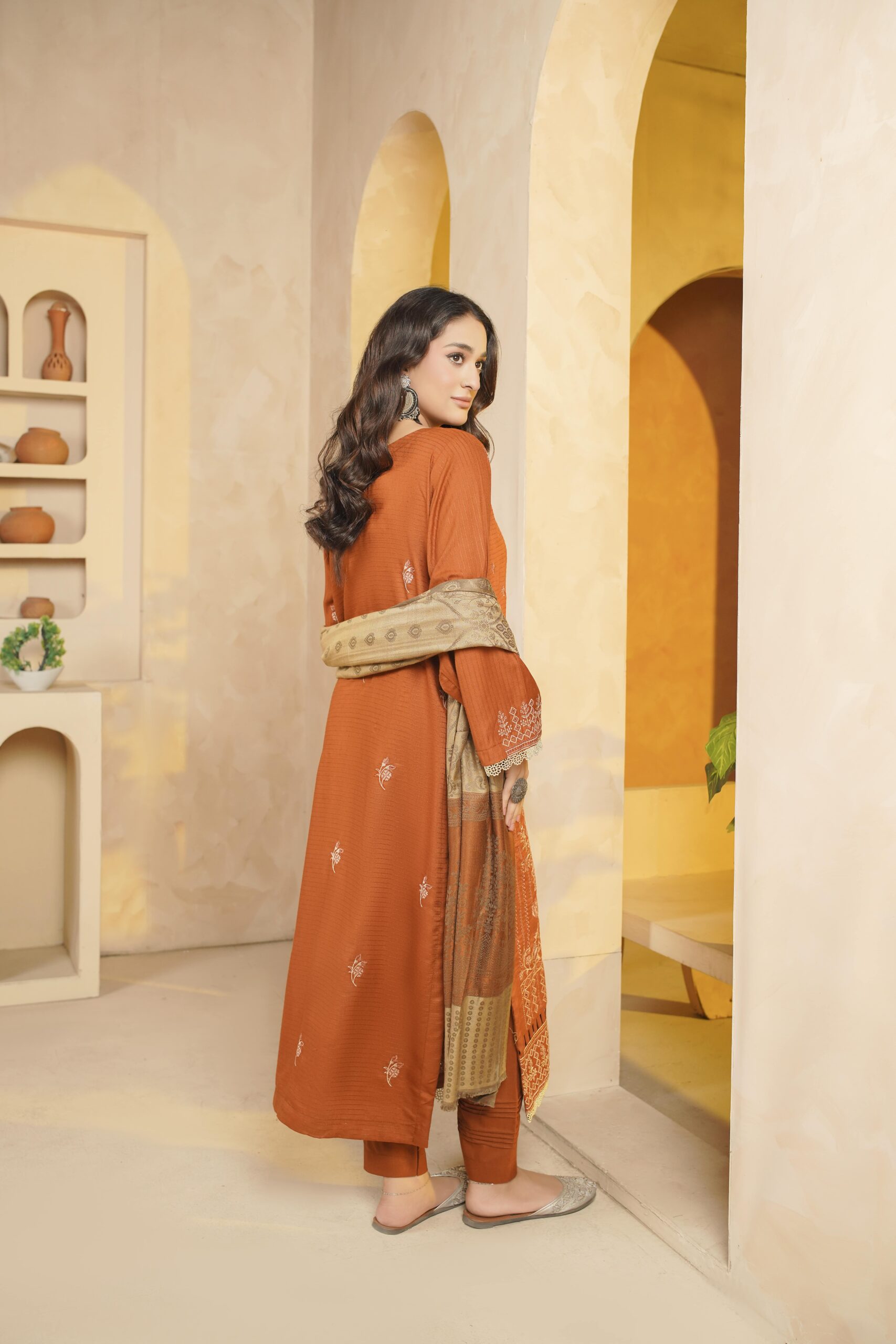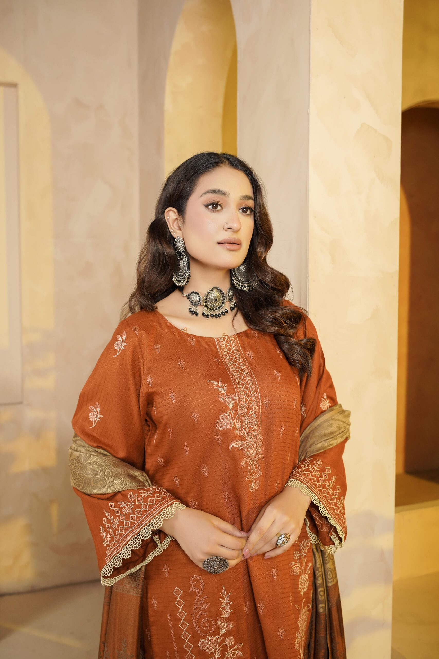 Manizay presents Sanghaar — a graceful winter ensemble that embodies sophistication and warmth. Crafted from premium embroidered Dhanak fabric, this outfit is a reflection of timeless artistry and refined elegance. The intricate embroidery on the front, back, and sleeves showcases exquisite craftsmanship, while the plain dyed trouser adds balance and simplicity.