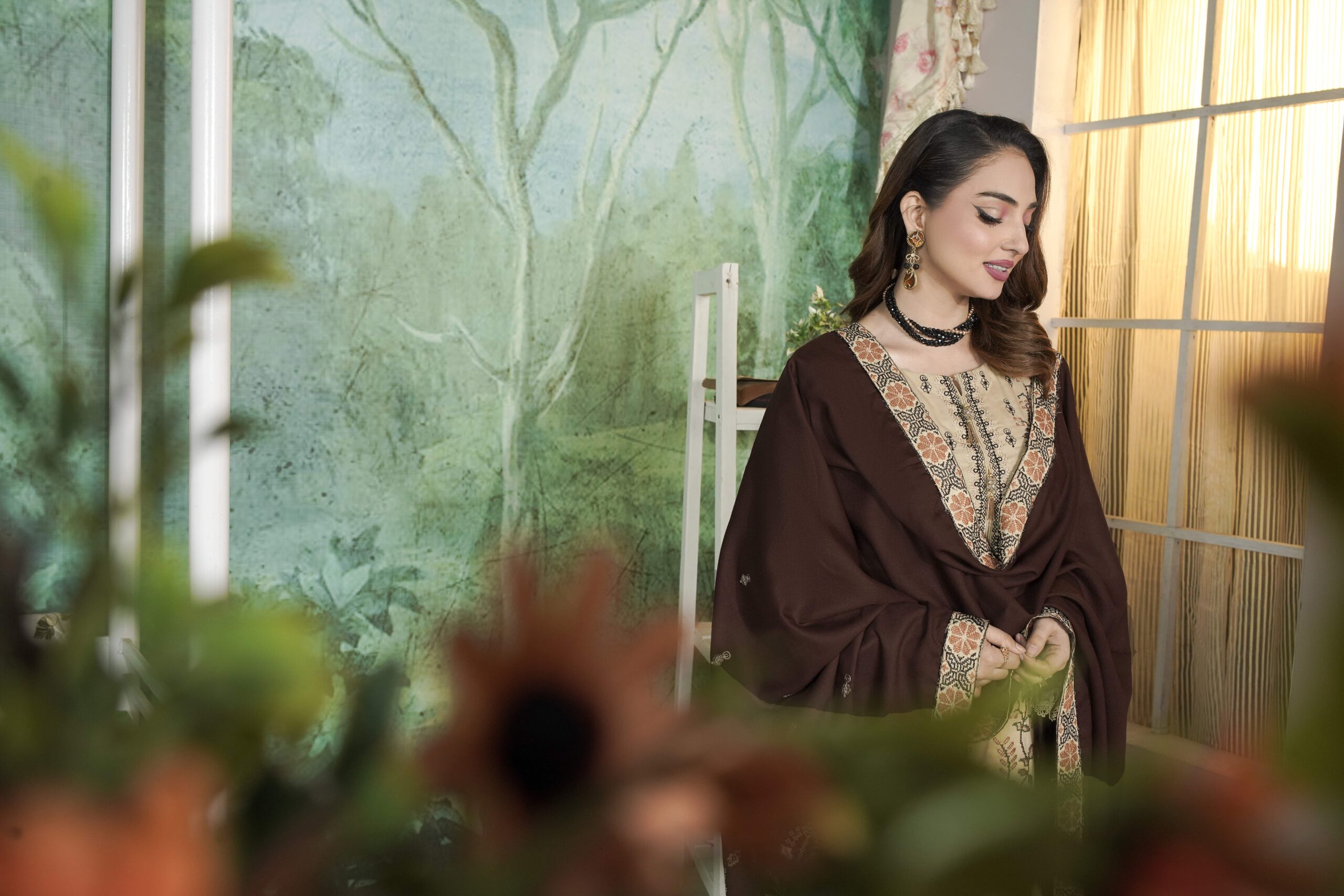 The outfit is completed with a heavy embroidered Dhanak shawl that enhances the overall charm and provides cozy warmth during colder days. Umeed Khush Rang is perfect for winter gatherings, festive occasions, and formal evenings, offering a graceful appearance with lasting comfort.