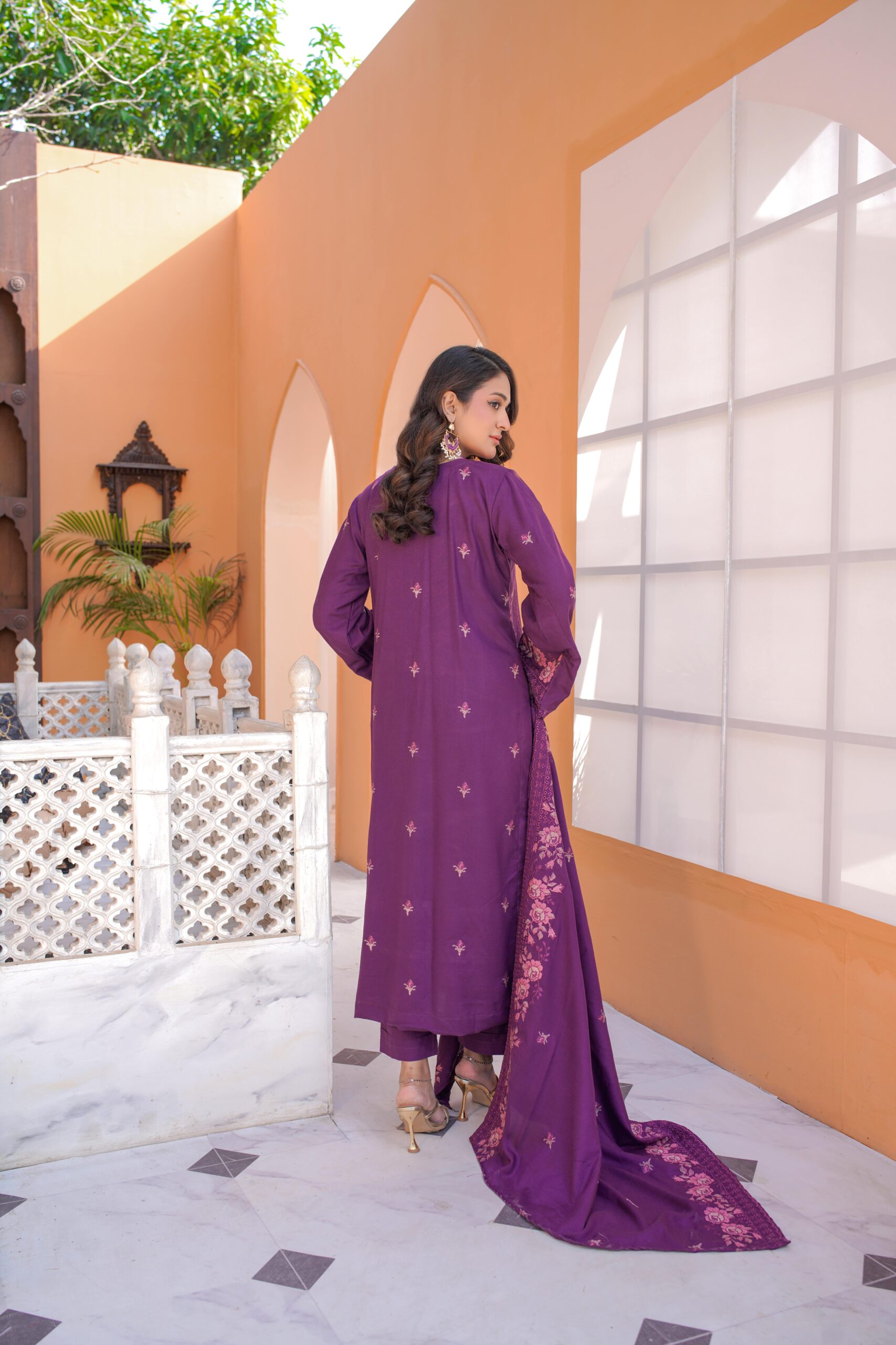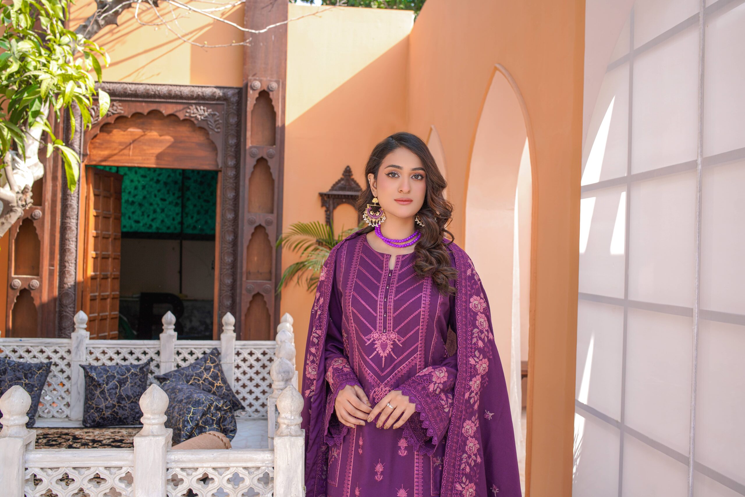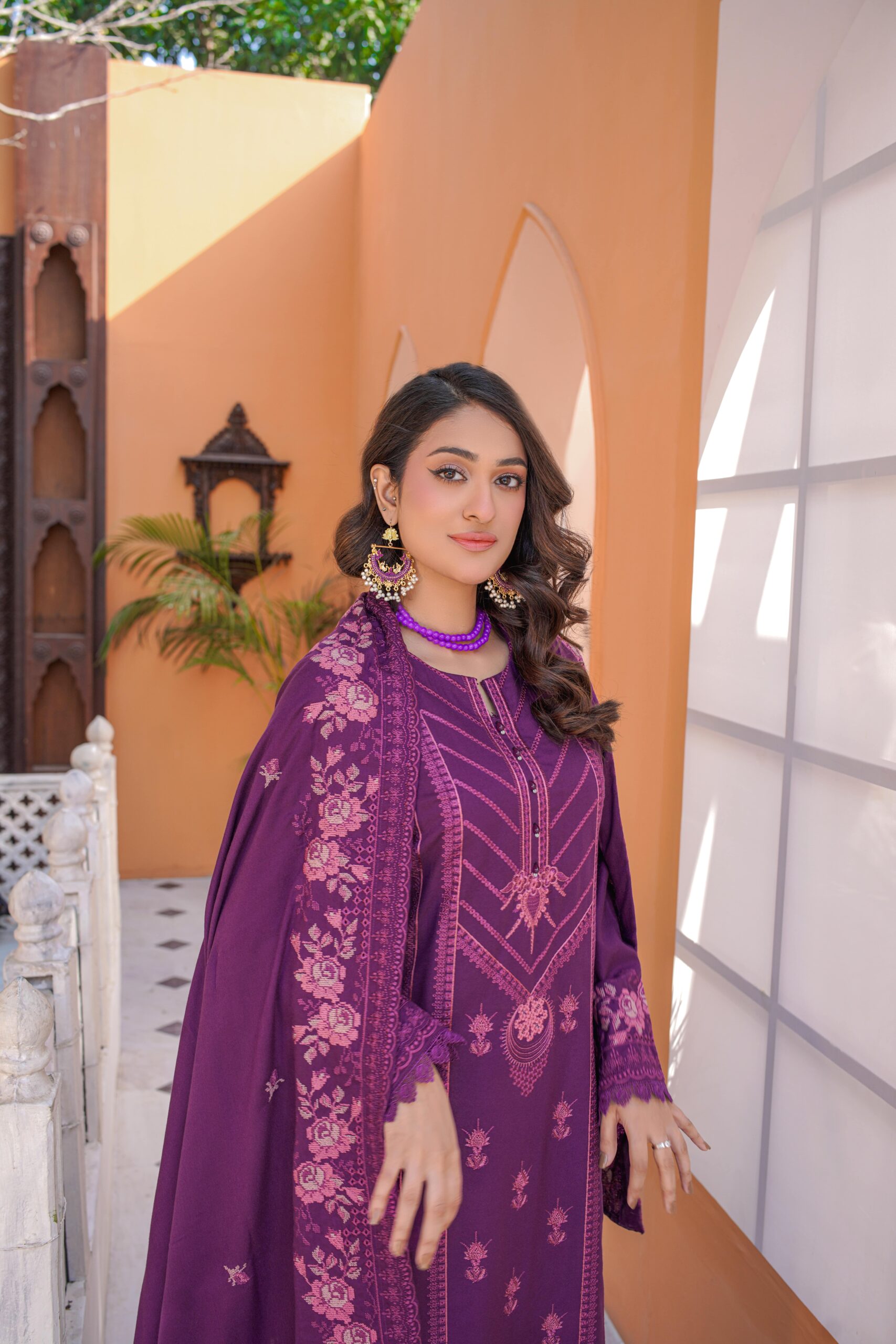 The embroidered front, back, and sleeves add richness to the design, while the plain dyed trouser keeps the look refined and balanced. Completing the outfit is a luxurious Embroidered Wool Shawl, offering unmatched comfort, traditional beauty, and a royal winter feel.