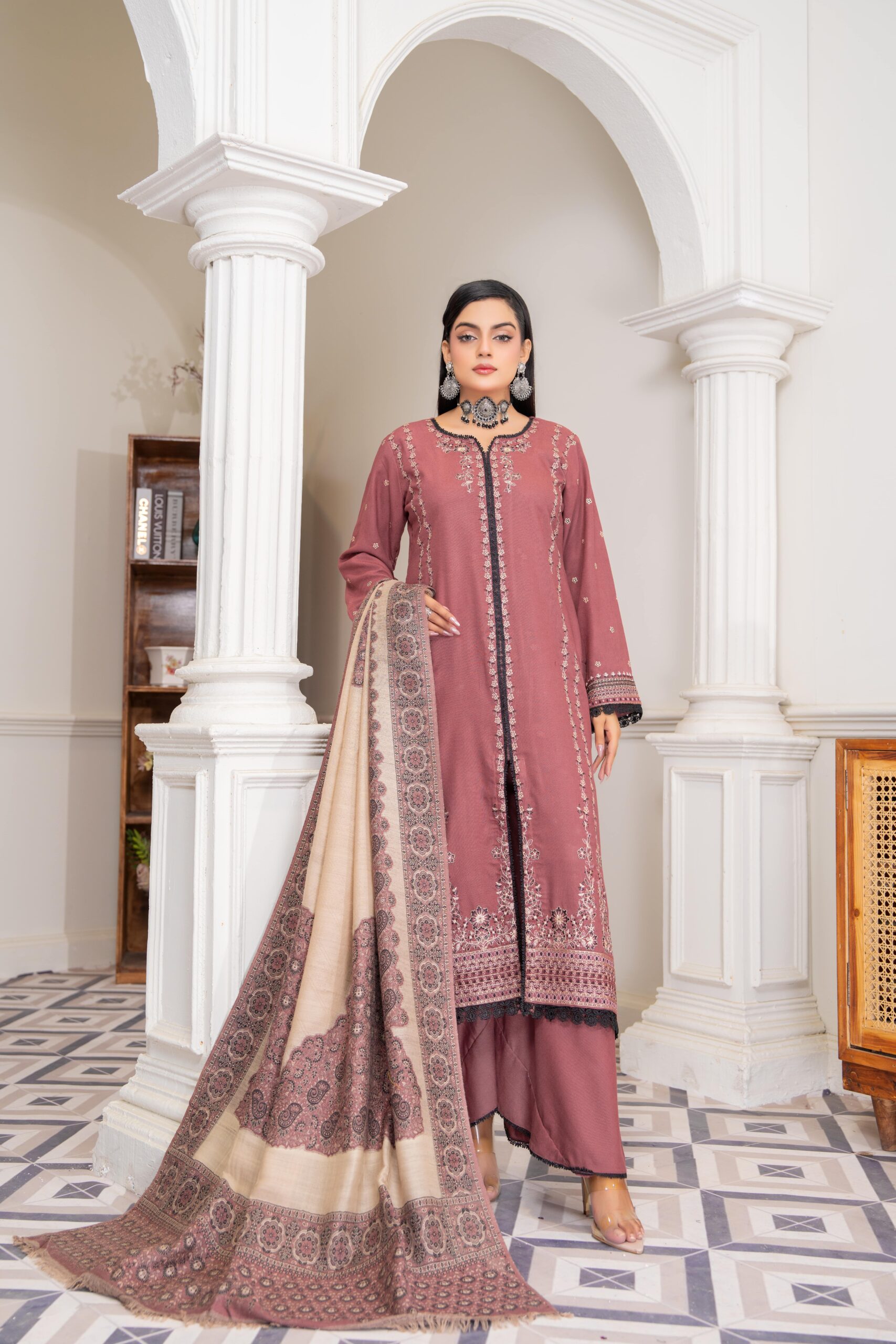 The embroidered front, back, and sleeves add richness to the design, while the plain dyed trouser keeps the look refined and balanced. Completing the outfit is a luxurious pure Pashmina shawl, offering unmatched comfort, traditional beauty, and a royal winter feel.