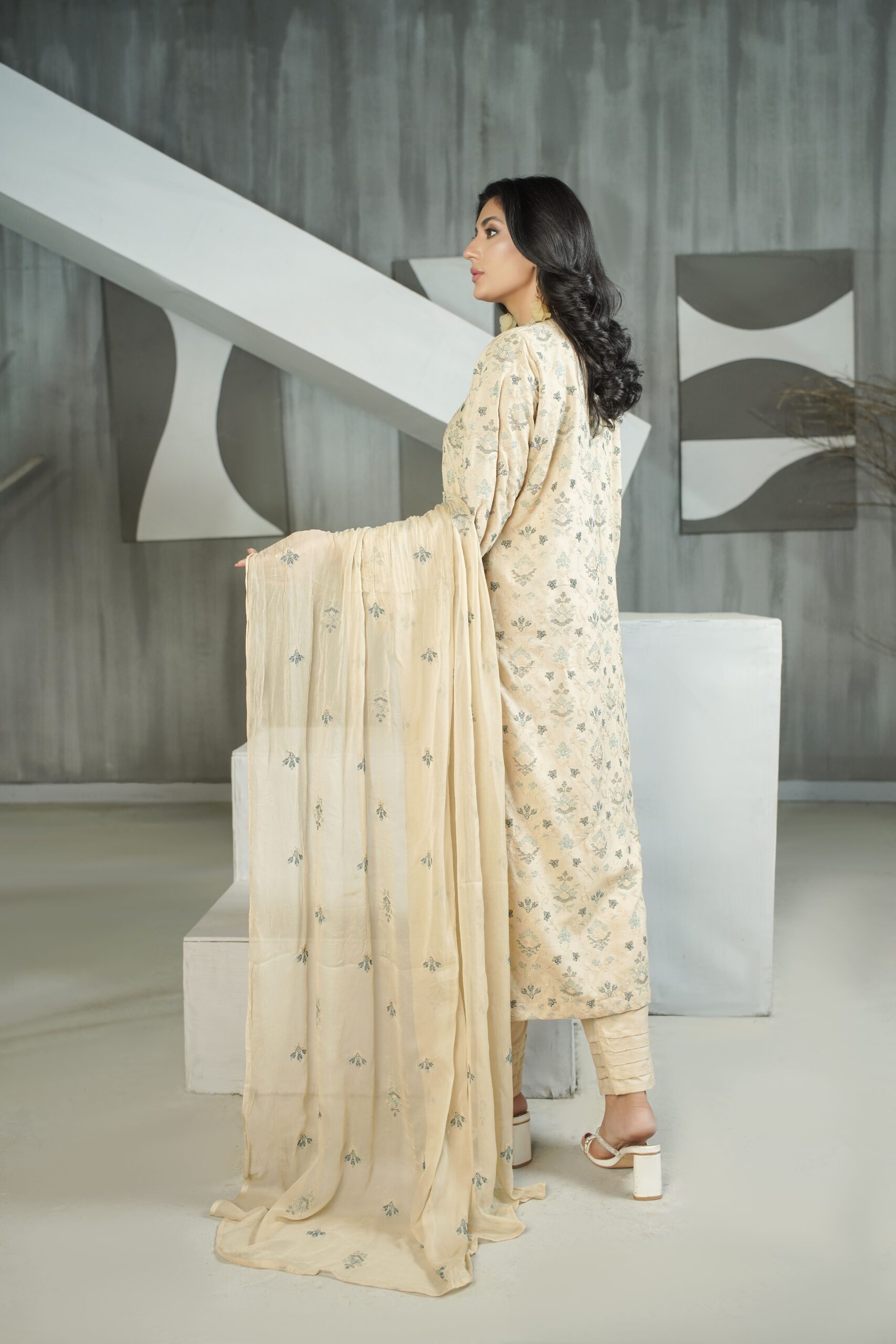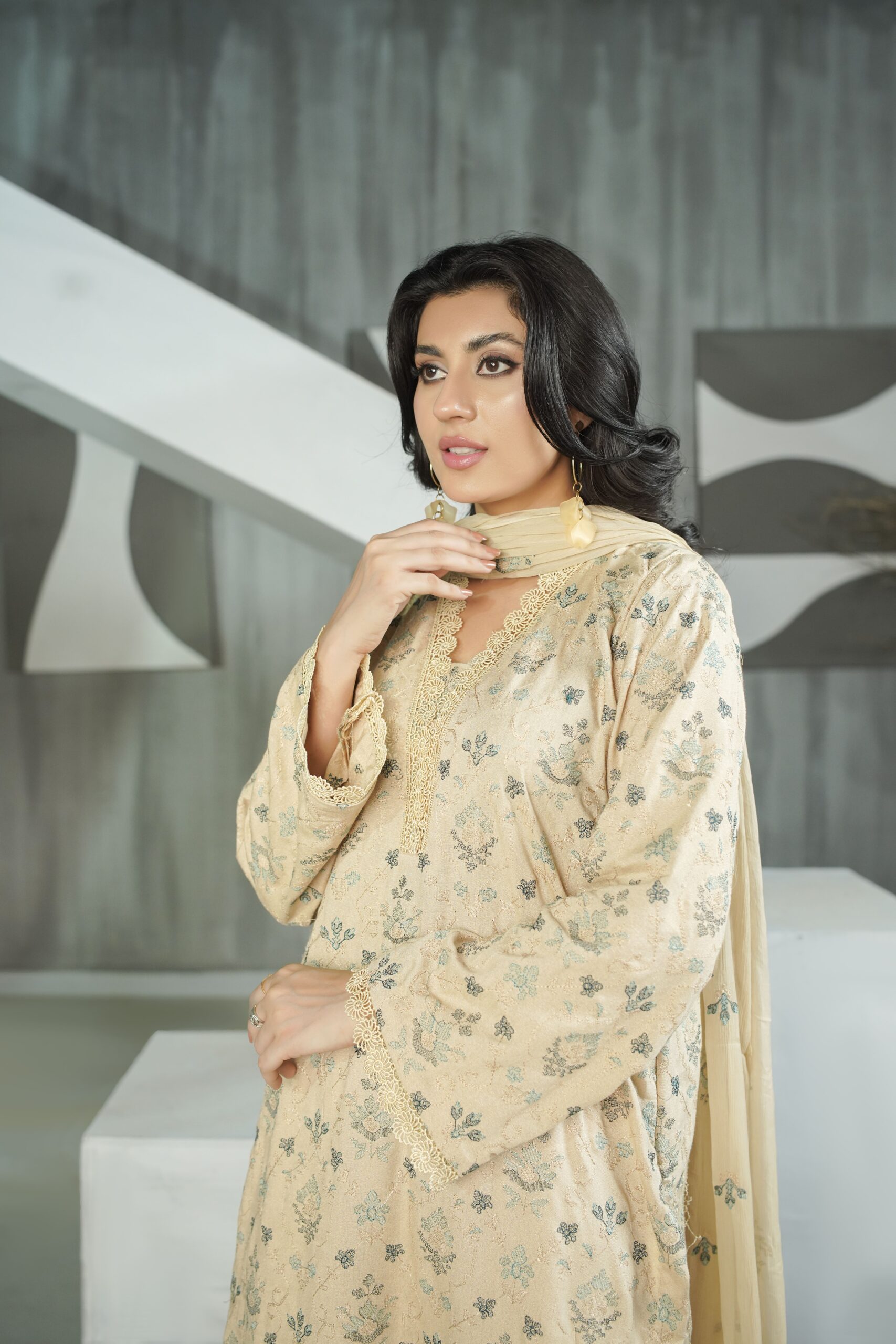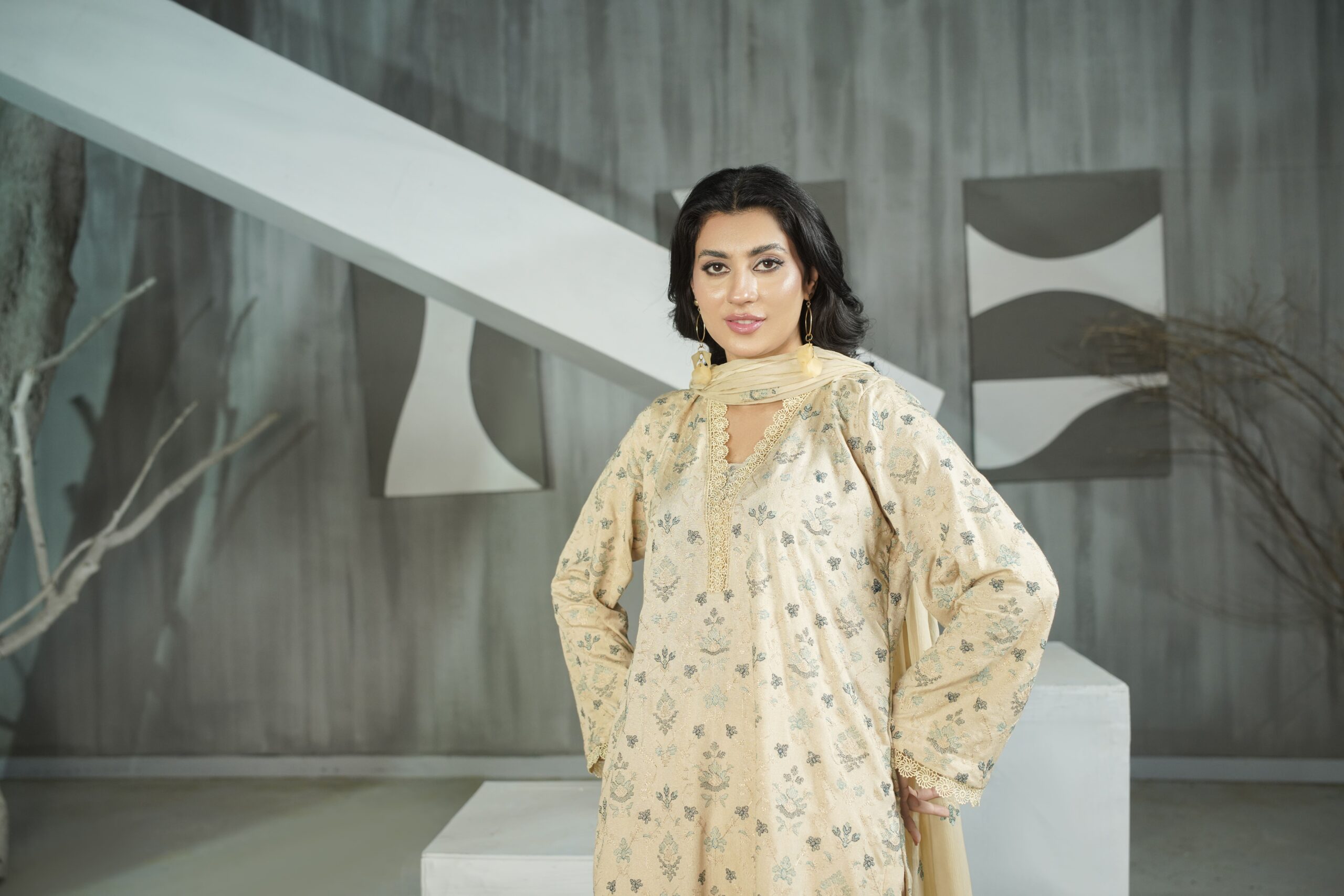 Paired with a plain dyed trouser for a timeless silhouette, every ensemble is completed with a premium embroidered Crinkle dupatta, adding lightness and textured sophistication. With its cozy fabric, graceful detailing, and versatile appeal, Gul e Gulzar is ideal for seasonal gatherings, cultural events, and everyday luxury.