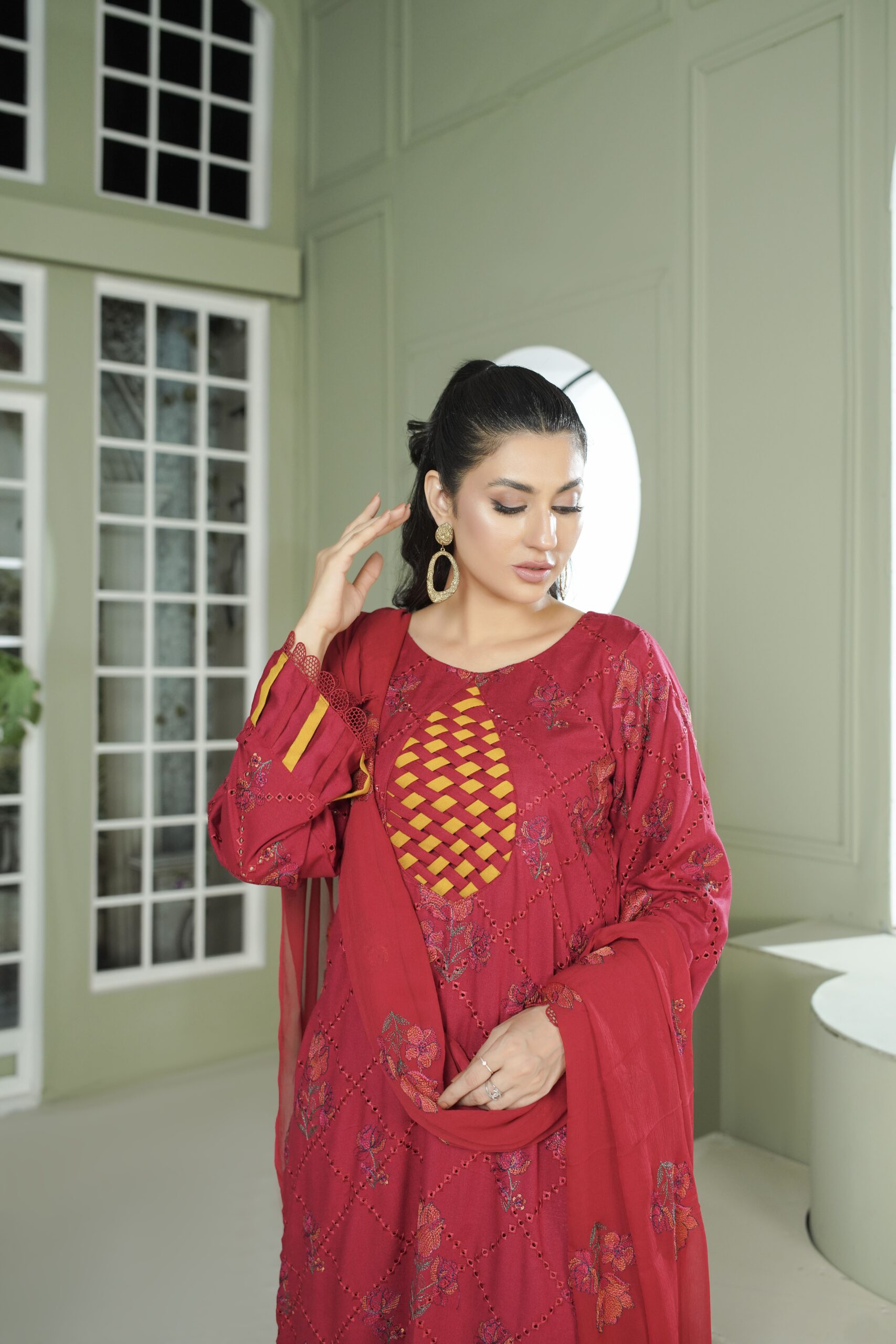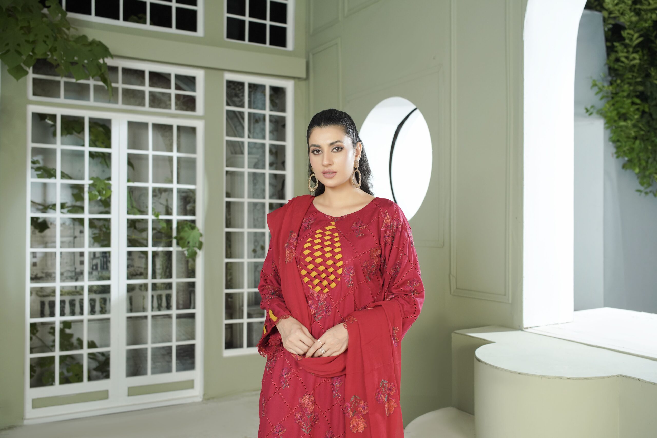 Paired with a plain dyed trouser for a timeless silhouette, every ensemble is completed with a premium embroidered Crinkle dupatta, adding lightness and textured sophistication. With its cozy fabric, graceful detailing, and versatile appeal, Gul e Gulzar is ideal for seasonal gatherings, cultural events, and everyday luxury.