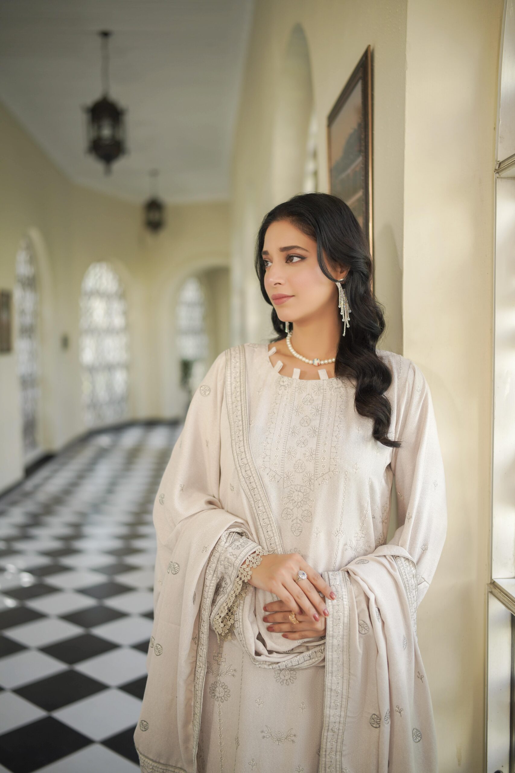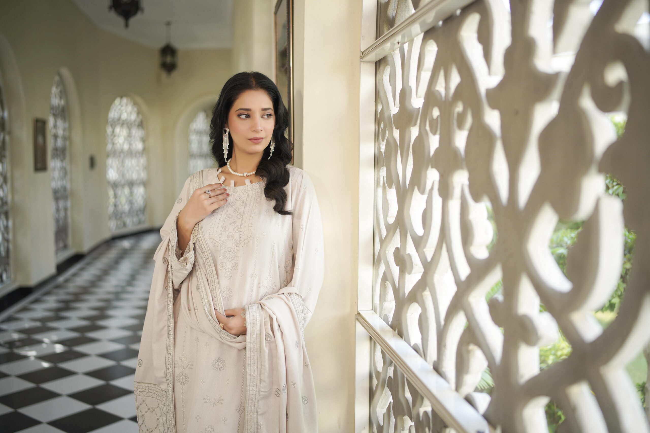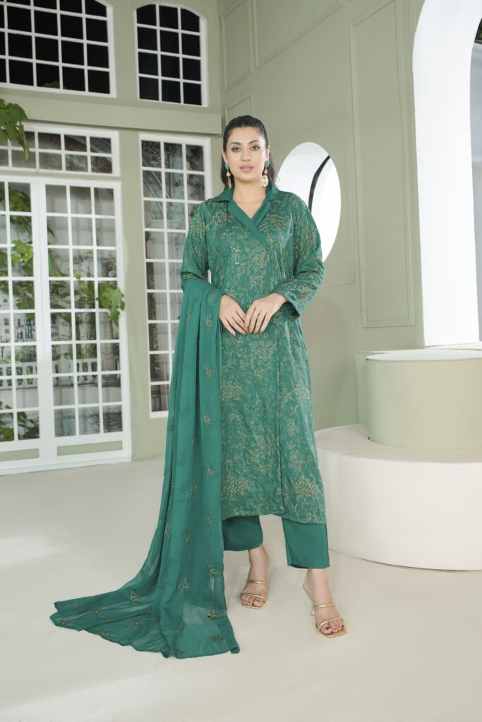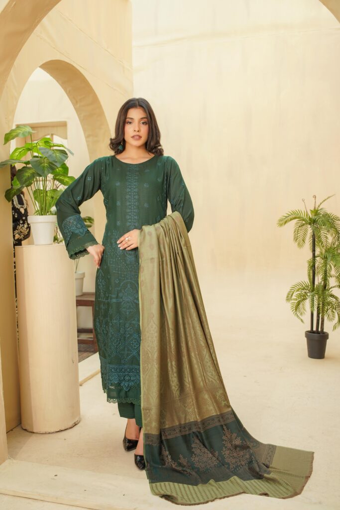 The highlight of this attire is the heavy embroidered wool shawl, designed to add richness and grace to your winter wardrobe. Ideal for festive occasions, family gatherings, and formal evenings, Khush Habi captures the true essence of timeless fashion with a cozy winter charm.