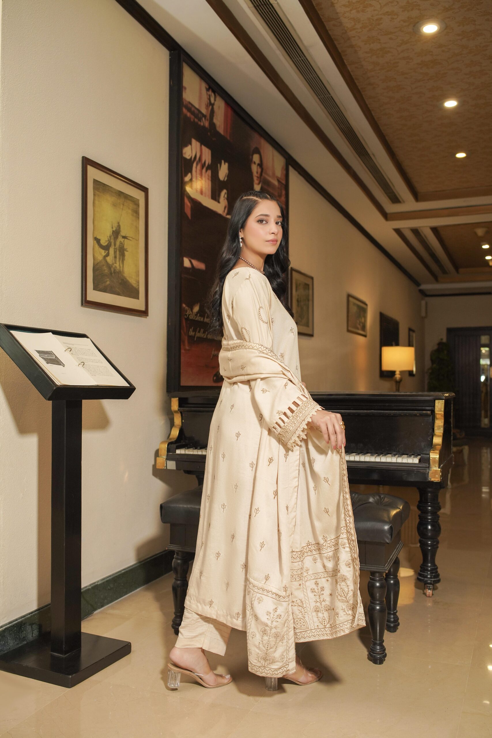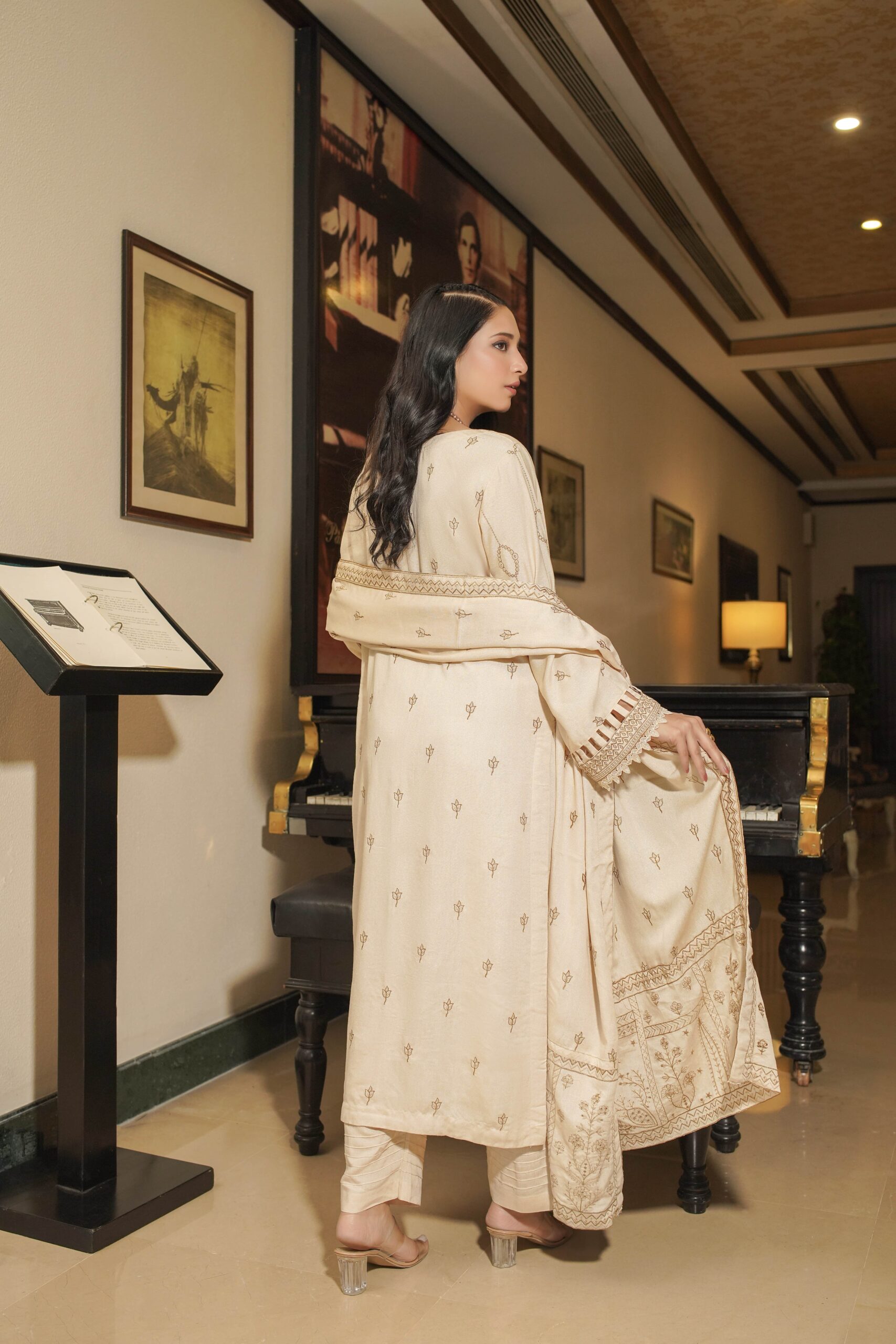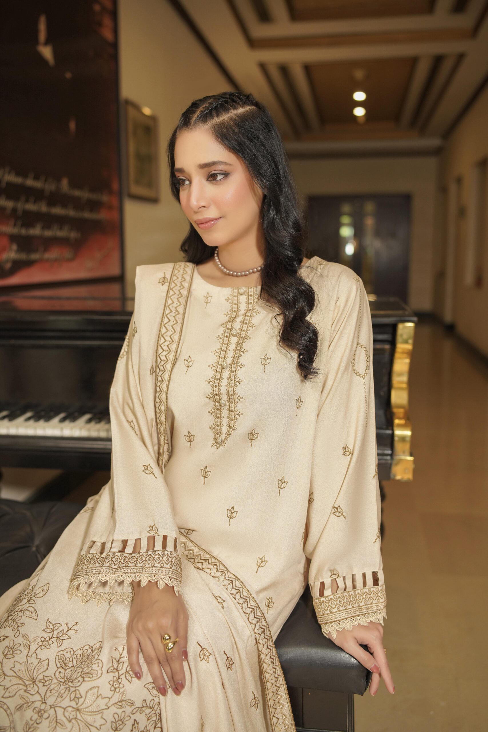 The highlight of this attire is the heavy embroidered wool shawl, designed to add richness and grace to your winter wardrobe. Ideal for festive occasions, family gatherings, and formal evenings, Khush Habi captures the true essence of timeless fashion with a cozy winter charm.