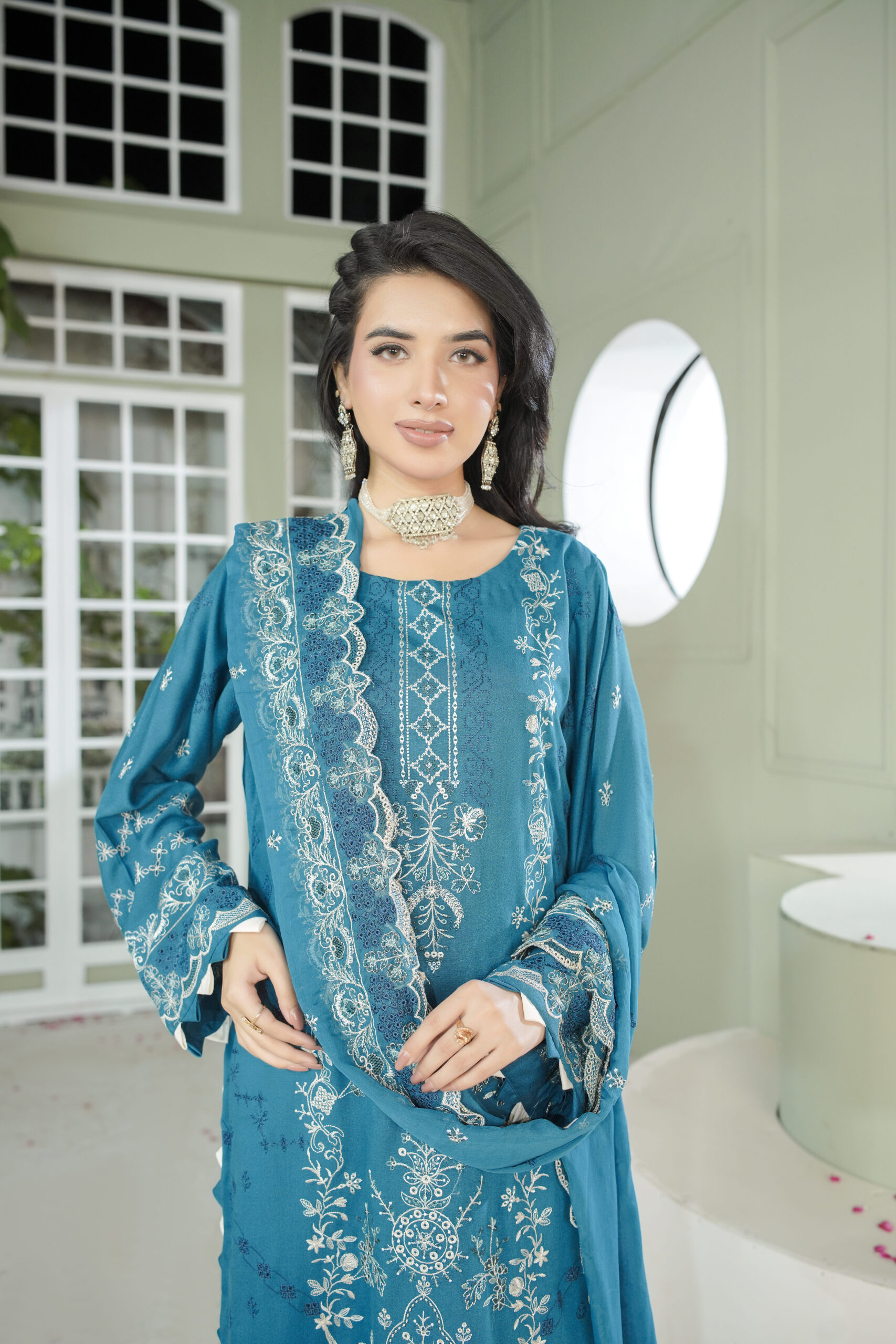 Finished with a plain dyed trouser for a classic balance, the ensemble is paired with a premium embroidered Crinkle dupatta, bringing fluidity, texture, and subtle elegance to the look. With its soft winter fabric, delicate embellishments, and versatile design, Mehrma is perfect for festive evenings, cultural occasions, and graceful everyday styling.