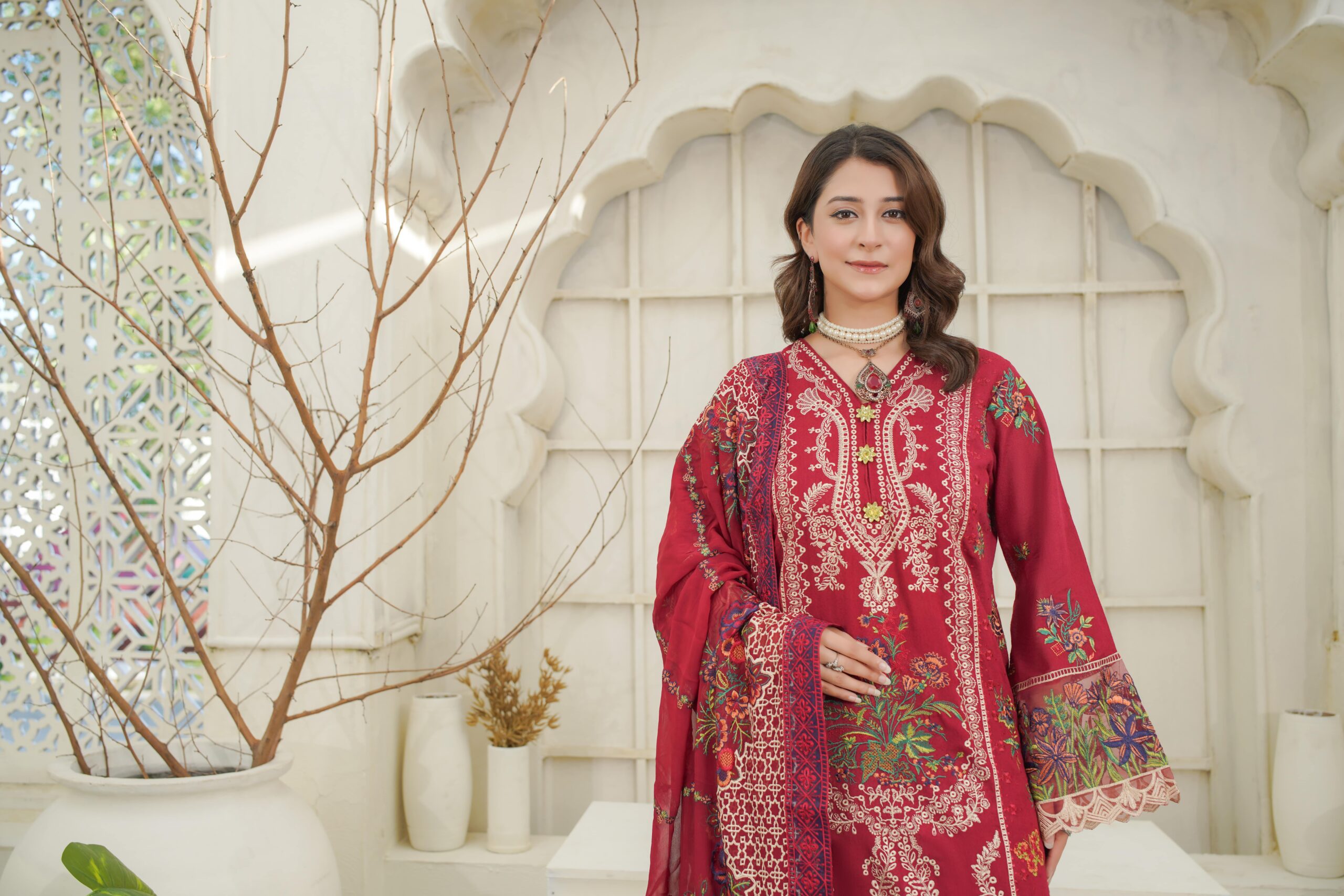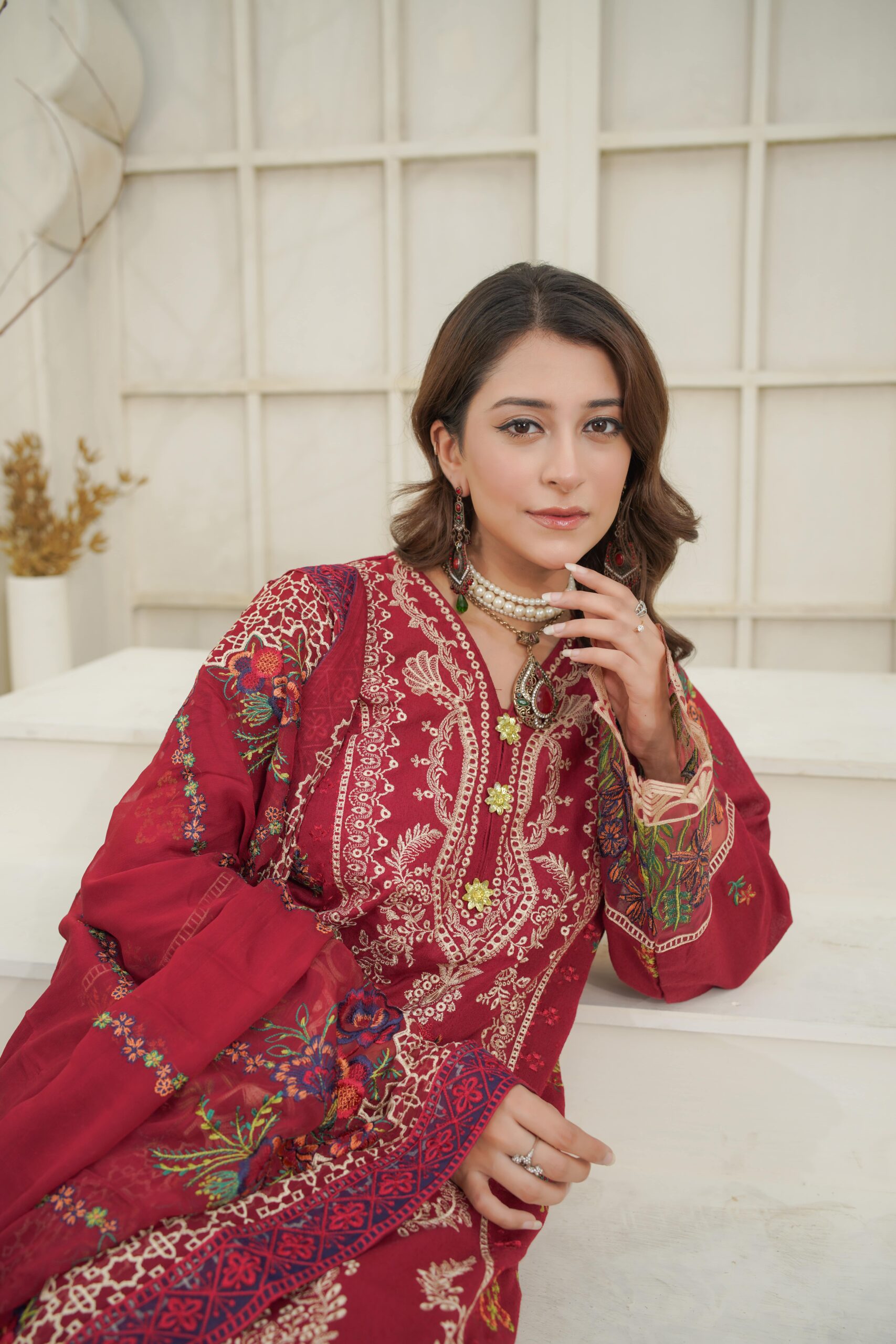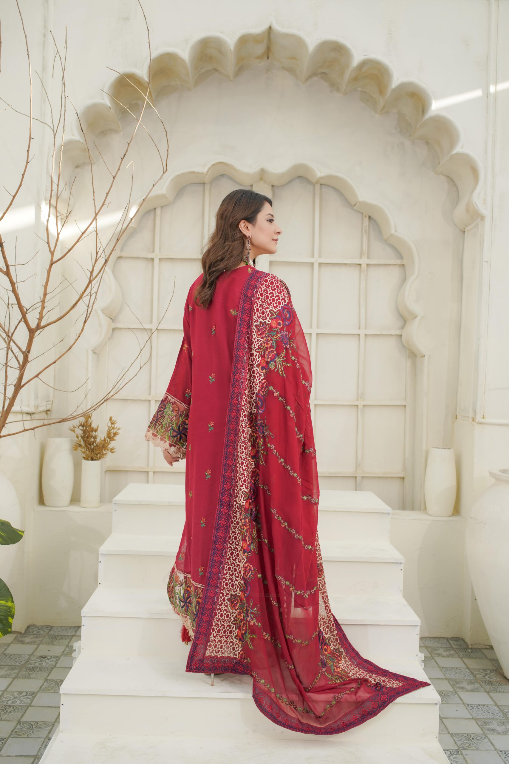 RANG E ISHQ is a masterpiece that embodies passion, grace, and timeless sophistication. Crafted from premium embroidered Karandi, this ensemble showcases refined embroidery on the front, back, and sleeves, radiating a sense of luxury and elegance. The plain dyed trouser balances the rich detailing of the shirt, ensuring a graceful and complete look.