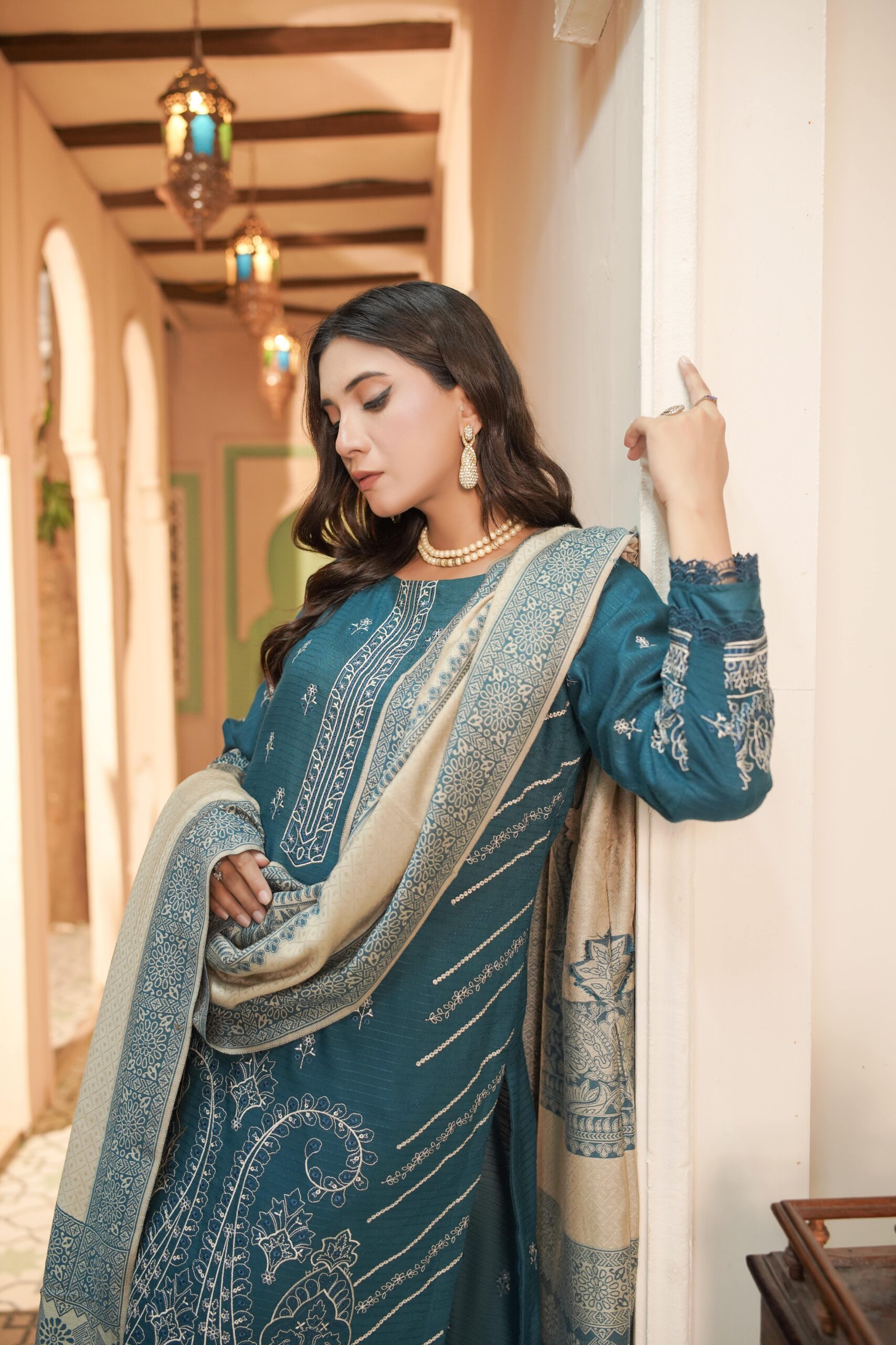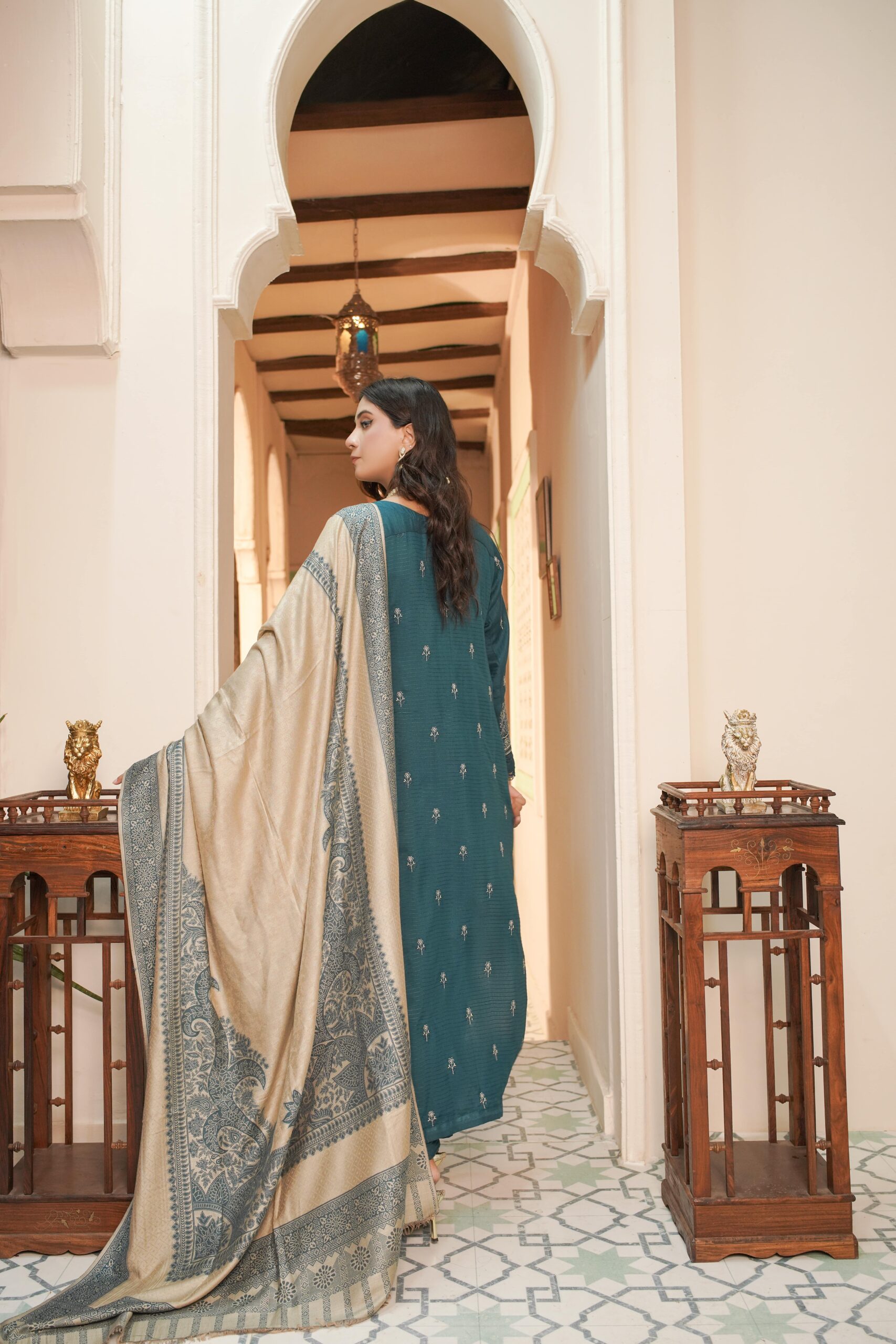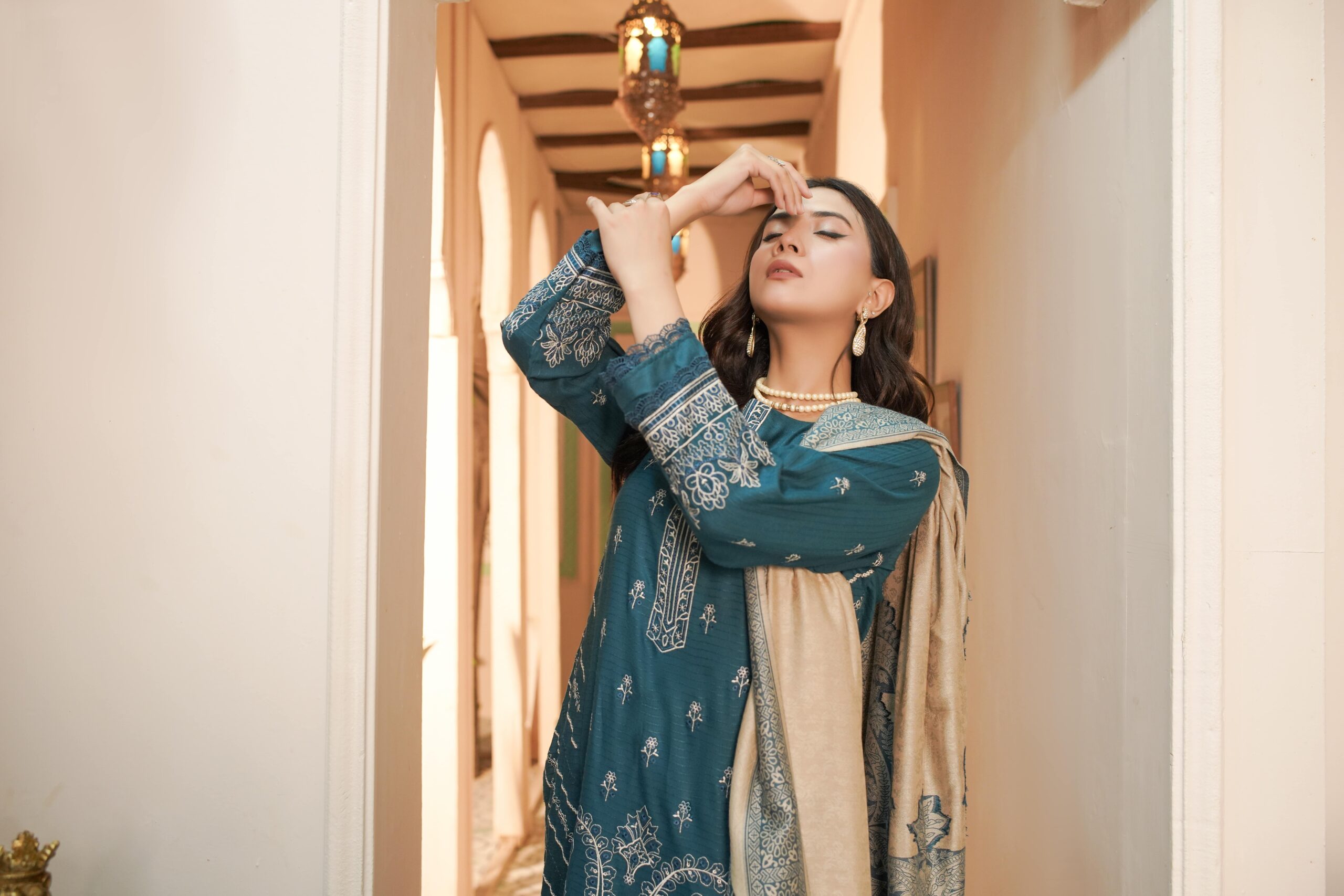 Sehar Bano is a poetic blend of warmth and elegance, woven with heritage and finesse. Crafted from premium embroidered Bana Dora Dhanak, this ensemble showcases intricate embroidery on the front, back, and sleeves—radiating timeless charm in every thread.