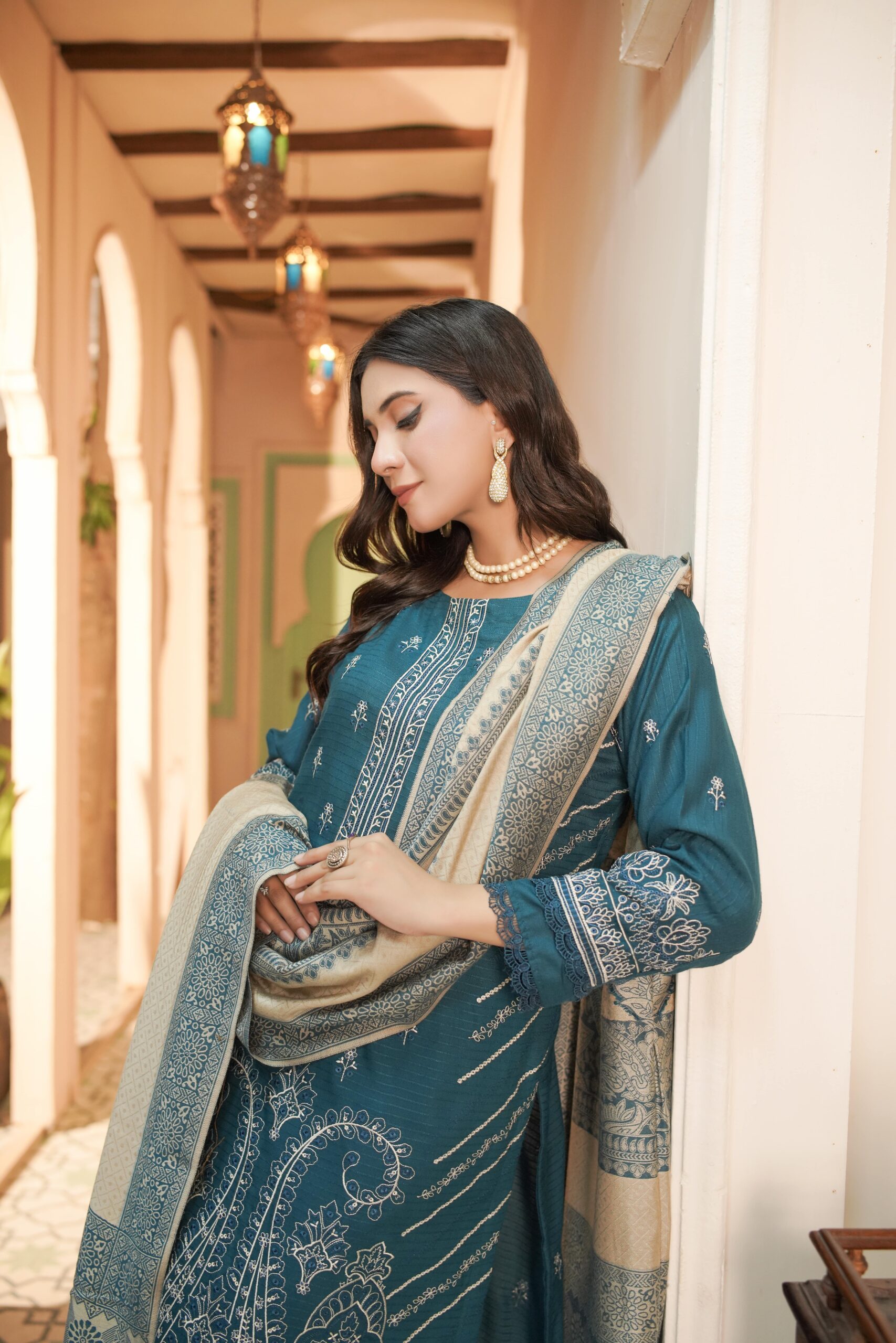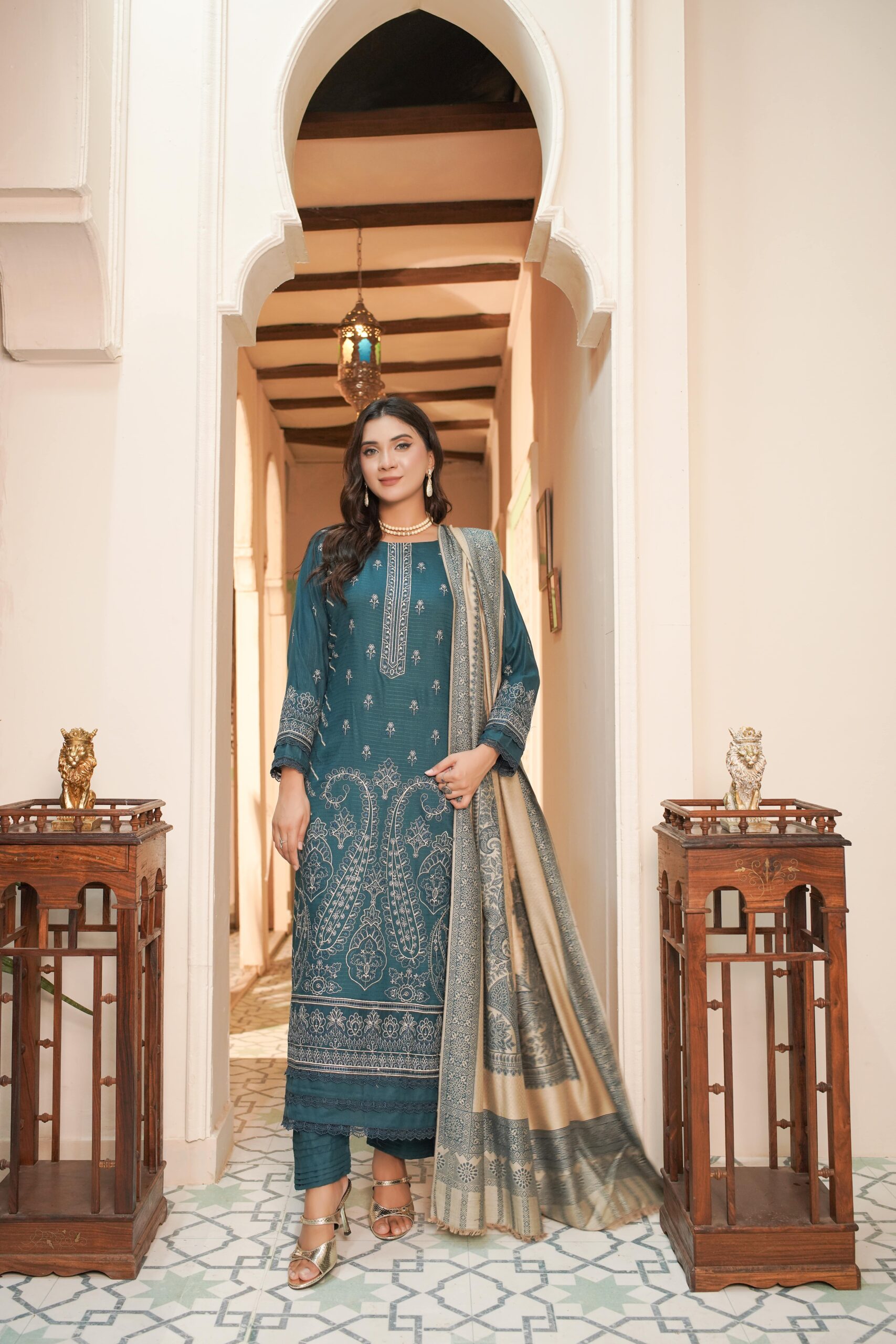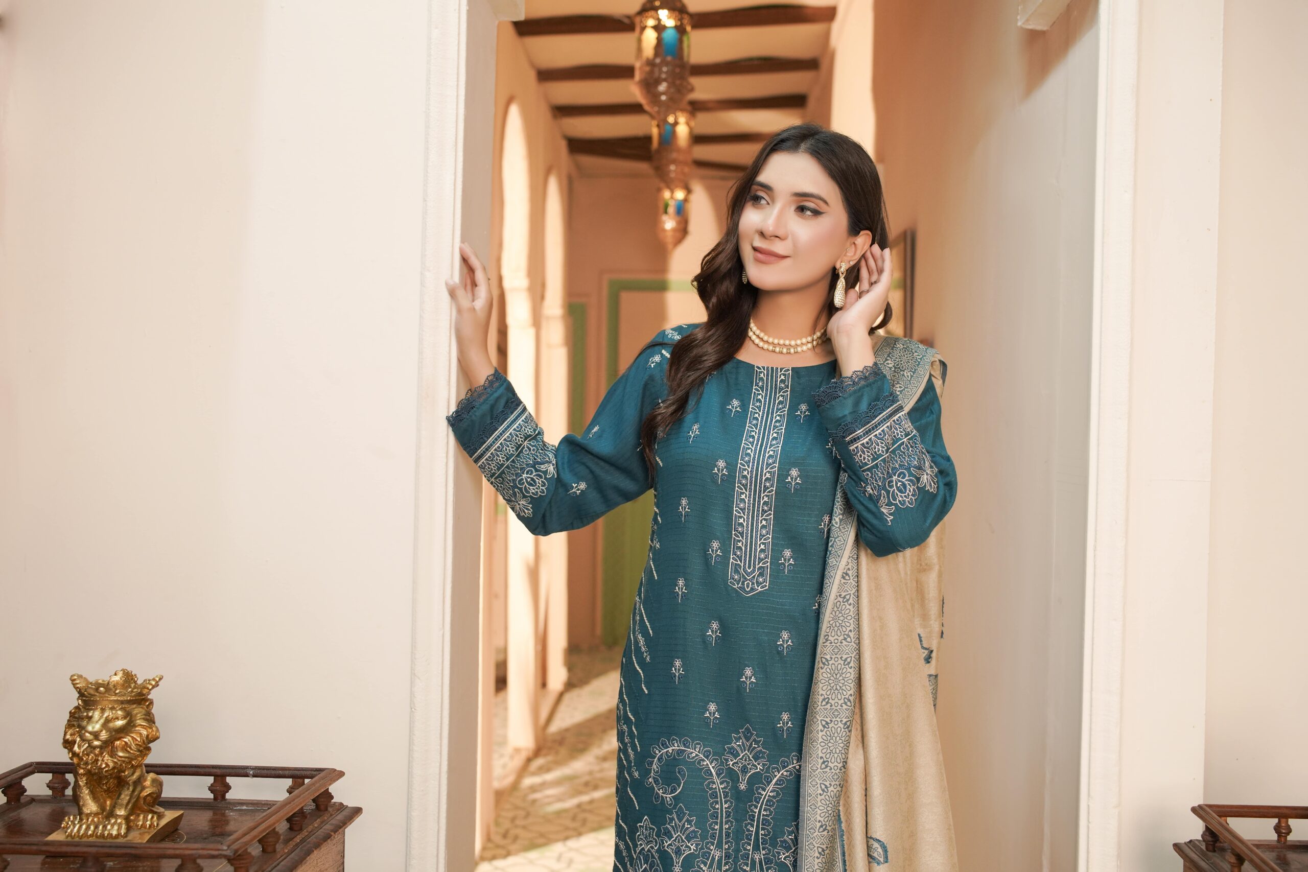 Sehar Bano is a poetic blend of warmth and elegance, woven with heritage and finesse. Crafted from premium embroidered Bana Dora Dhanak, this ensemble showcases intricate embroidery on the front, back, and sleeves—radiating timeless charm in every thread.