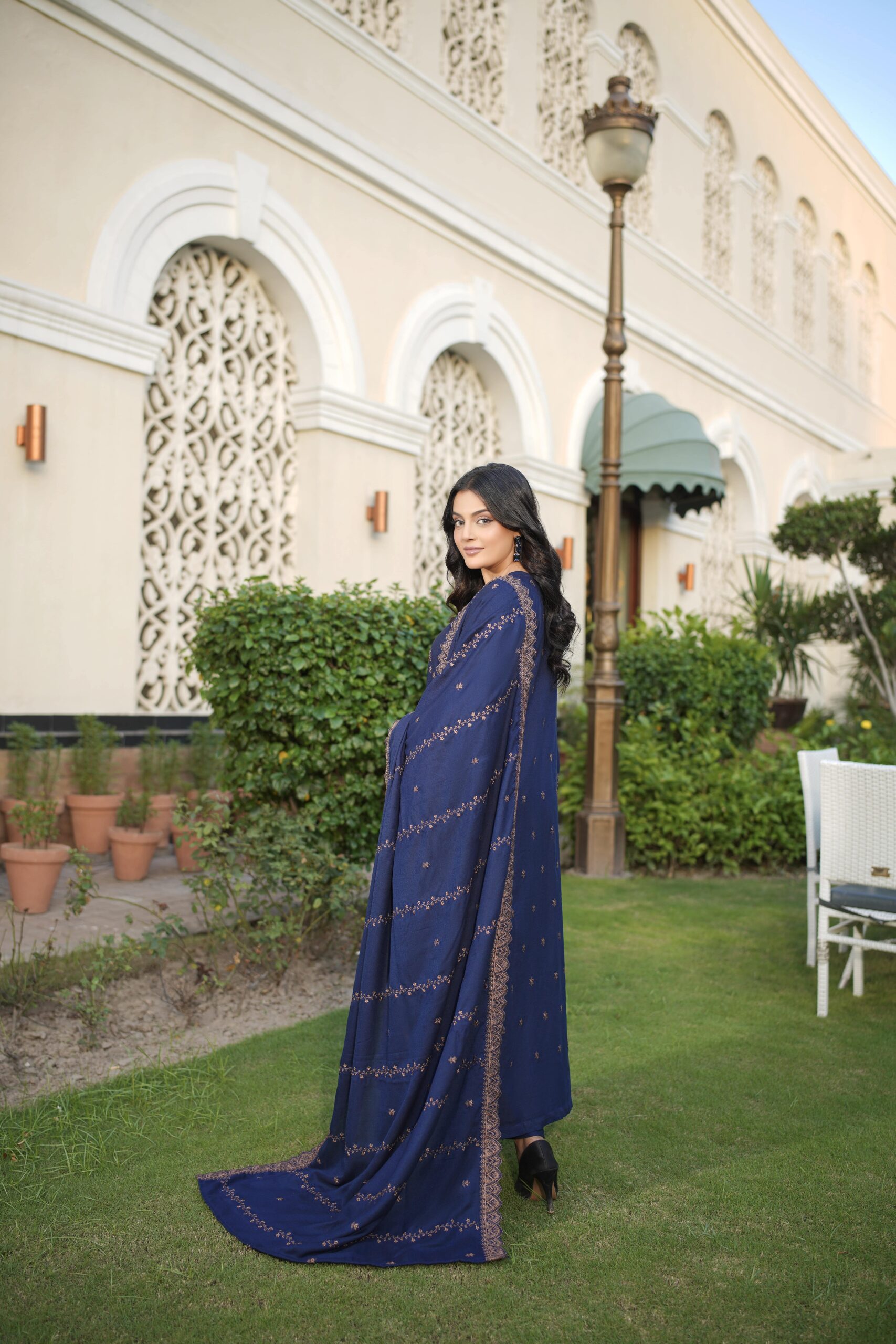 The ensemble is completed with a premium embroidered wool shawl, adding a touch of timeless grace and comfort — perfect for winter festivities, formal gatherings, and evening occasions. Shouk Kamal is the perfect blend of beauty and refinement, designed for women who value class and comfort in every season.