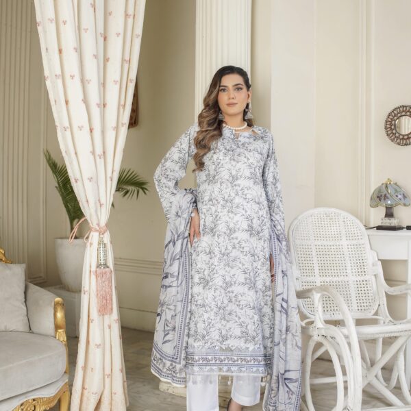 Premium Digital Print Lawn Front Premium Digital Print Lawn Back, Premium Digital Print Lawn Sleeves, Plain Dyed Trouser, Premium Lino Karta Dupatta.