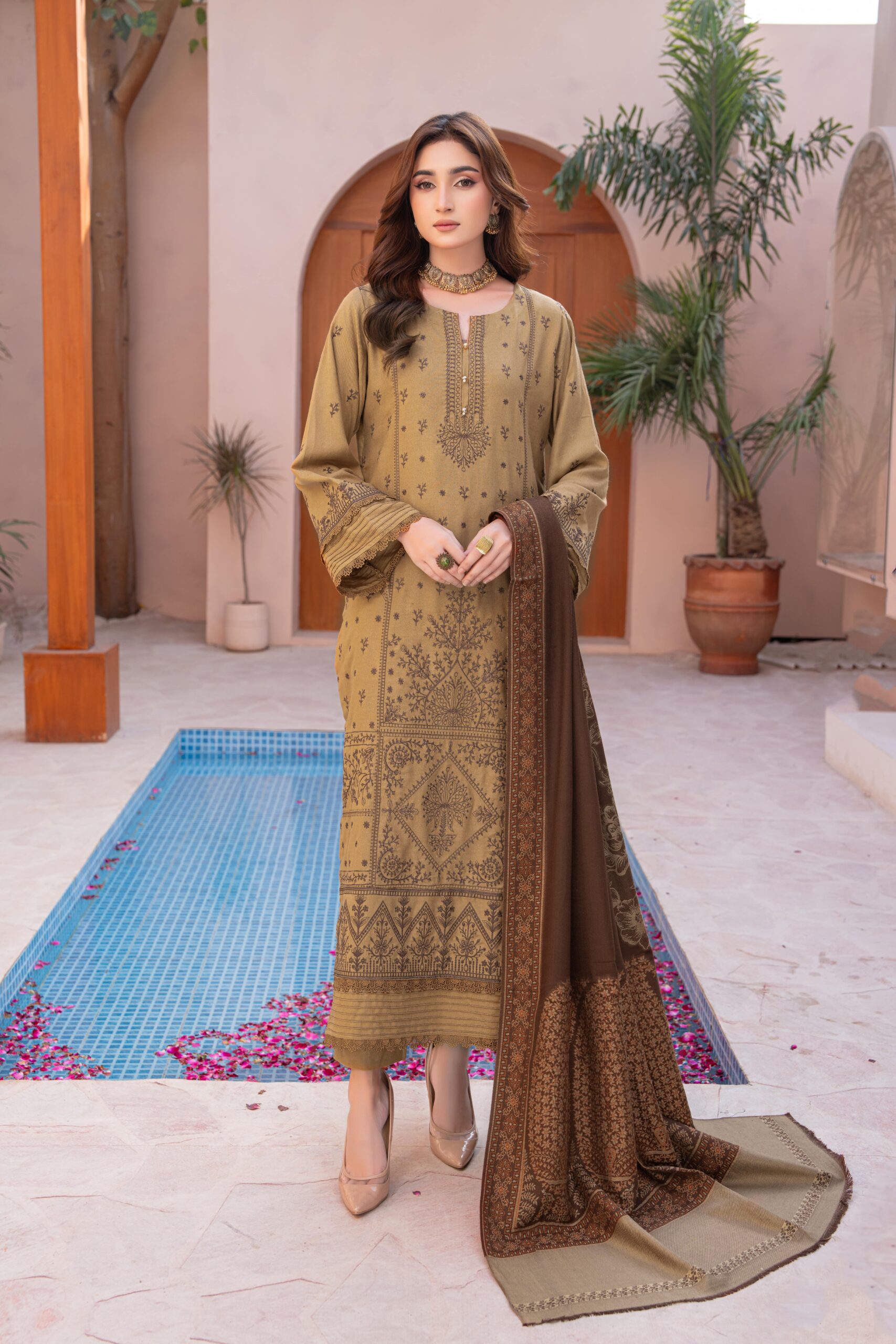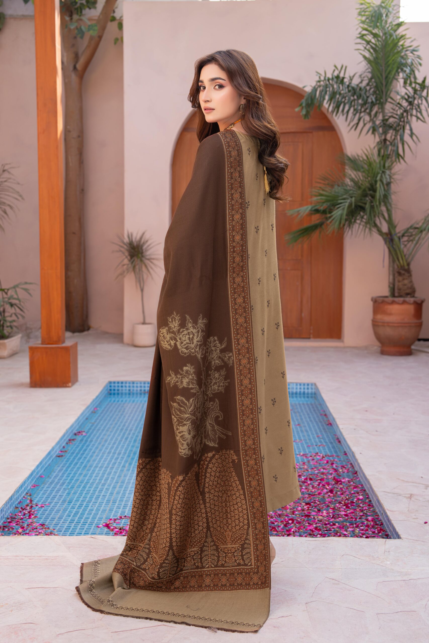The embroidered front, back, and sleeves add richness to the design, while the plain dyed trouser keeps the look refined and balanced. Completing the outfit is a luxurious pure Pashmina shawl, offering unmatched comfort, traditional beauty, and a royal winter feel.