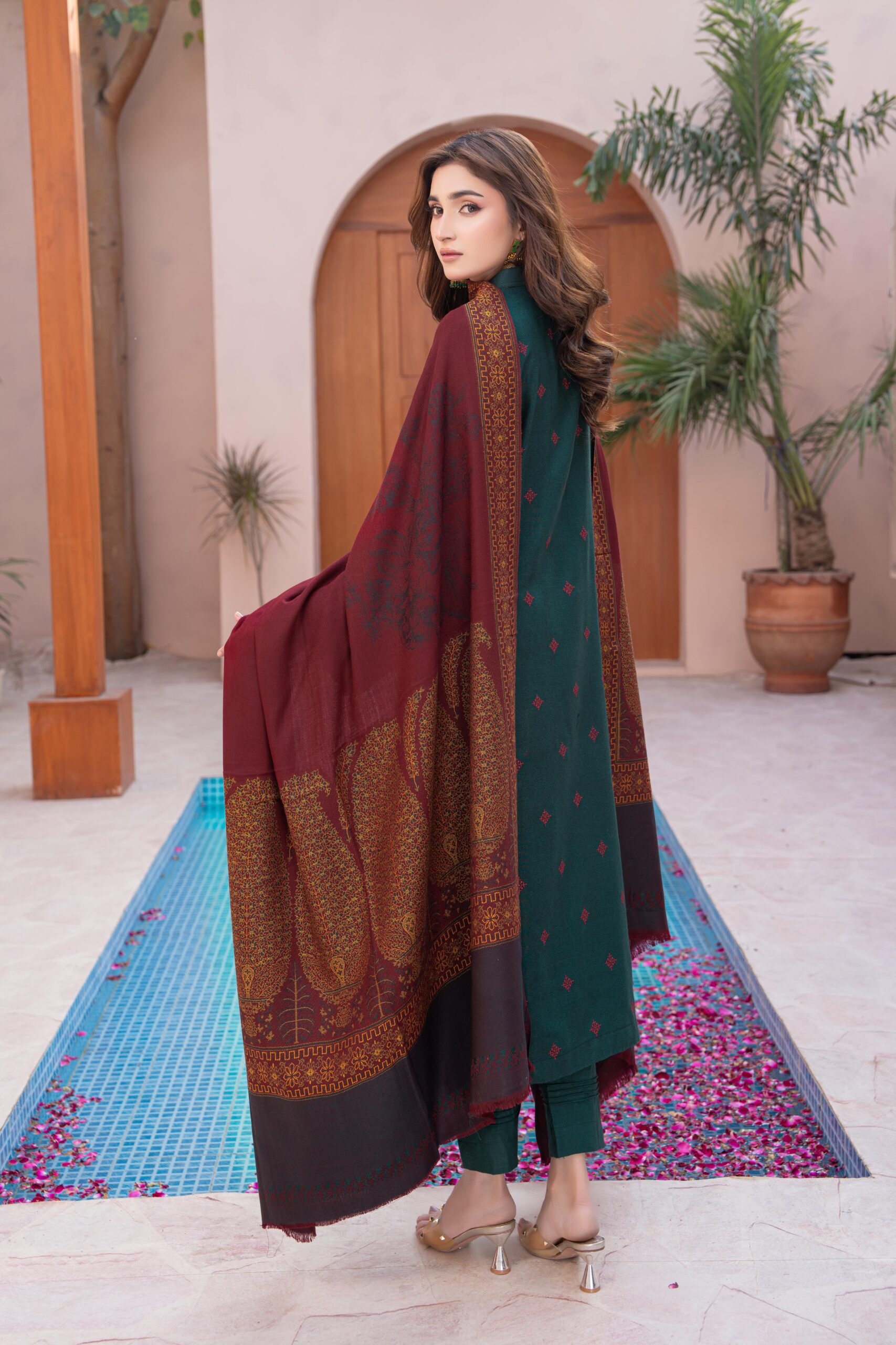 The embroidered front, back, and sleeves add richness to the design, while the plain dyed trouser keeps the look refined and balanced. Completing the outfit is a luxurious pure Pashmina shawl, offering unmatched comfort, traditional beauty, and a royal winter feel.