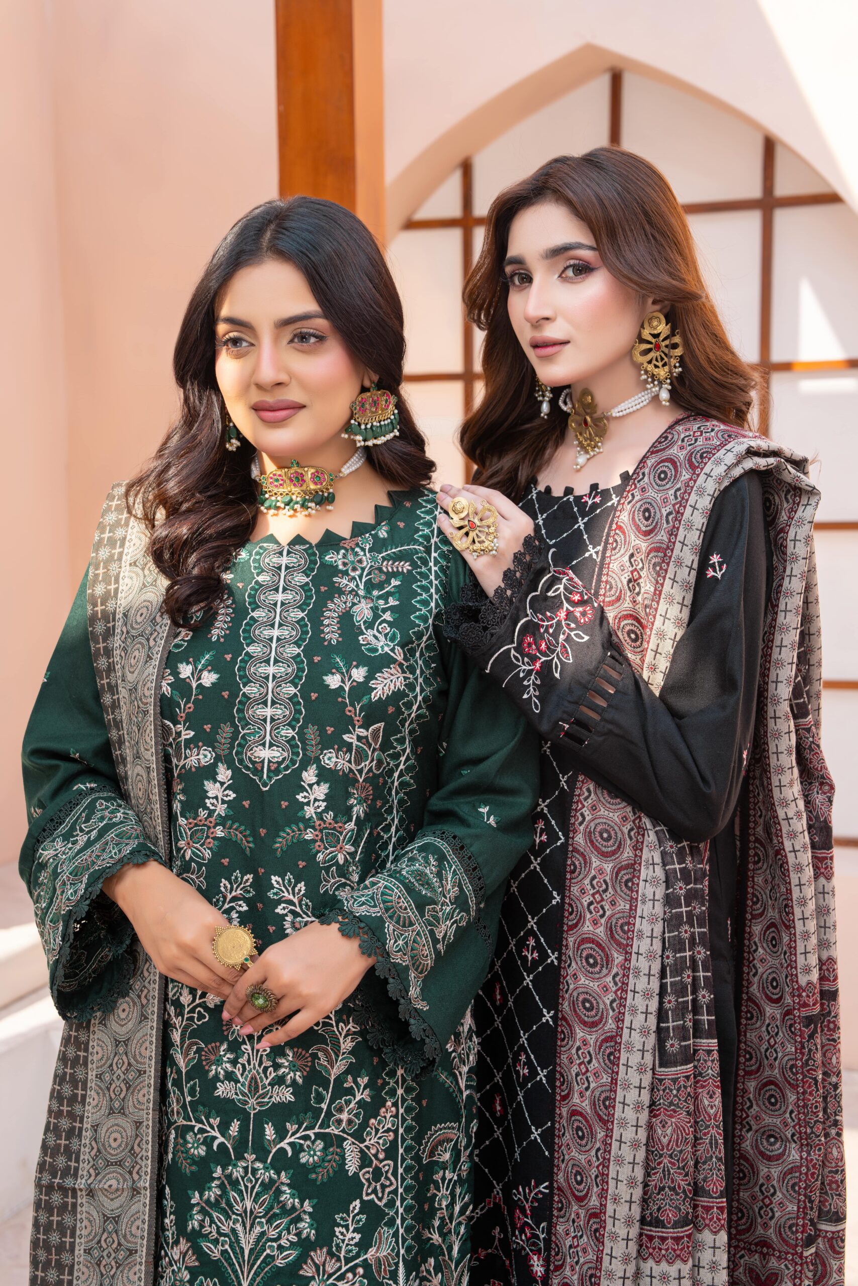 The embroidered front, back, and sleeves add richness to the design, while the plain dyed trouser keeps the look refined and balanced. Completing the outfit is a luxurious pure Pashmina shawl, offering unmatched comfort, traditional beauty, and a royal winter feel.