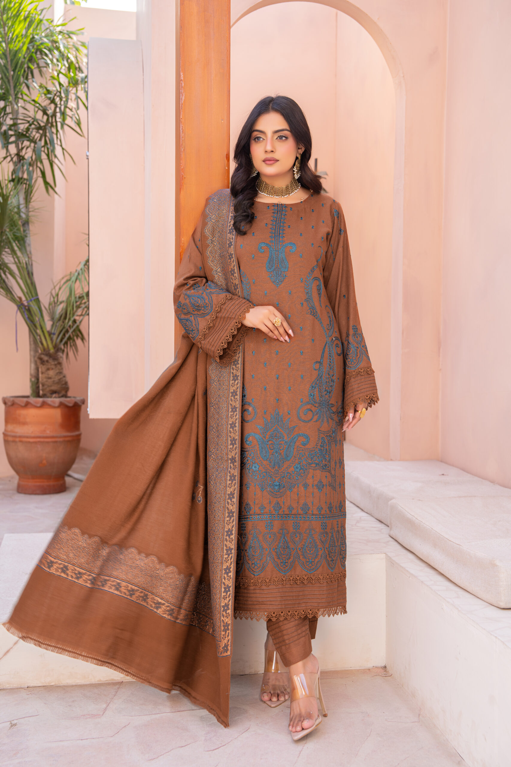 The embroidered front, back, and sleeves add richness to the design, while the plain dyed trouser keeps the look refined and balanced. Completing the outfit is a luxurious pure Pashmina shawl, offering unmatched comfort, traditional beauty, and a royal winter feel.