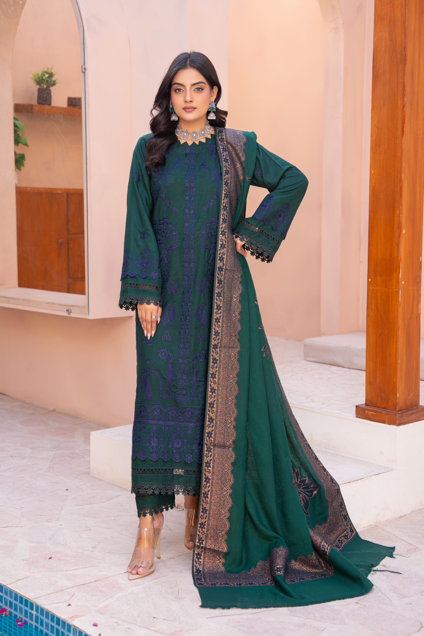 The embroidered front, back, and sleeves add richness to the design, while the plain dyed trouser keeps the look refined and balanced. Completing the outfit is a luxurious pure Pashmina shawl, offering unmatched comfort, traditional beauty, and a royal winter feel.